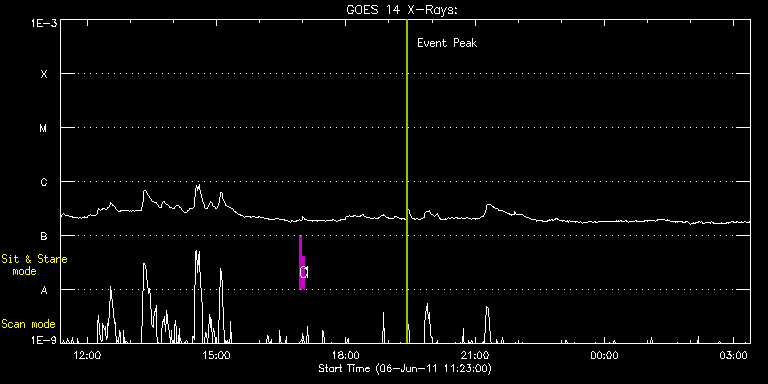 EIS Observation timeline overlay to GOES-Xray curve Code 1" 2" 40" 266" EIS Observations list for this event: STUDY ACRONYM ID DATE OBSERVED DESCRIPTION NOAA# TARGET 0 regcal071 | 22589 | 2011/06/06 16:55:11 | Dark exposures, CCD bottom rows (100s | | Engineering TIMELINE ID DATE OBSERVED FITS FILE XCEN (+W/-E) YCEN (+N/-S) DUR ----------------------------------------------------------------------------------------------------------------- 22589 | 2011/06/06 16:55:11.000 | eis_l0_20110606_165511.fits.gz | 613.26 | -684.32 | 3m21s 1 regcal072 | 22590 | 2011/06/06 16:58:59 | Dark exposures, top CCD rows (100s exp | | Engineering TIMELINE ID DATE OBSERVED FITS FILE XCEN (+W/-E) YCEN (+N/-S) DUR ----------------------------------------------------------------------------------------------------------------- 22590 | 2011/06/06 16:58:59.000 | eis_l0_20110606_165859.fits.gz | 613.57 | -173.09 | 3m22s : Check study information : Download file : View thumbnails For this event, also check for: