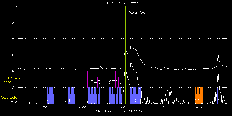 EIS Observation timeline overlay to GOES-Xray curve Code 1" 2" 40" 266" EIS Observations list for this event: STUDY ACRONYM ID DATE OBSERVED DESCRIPTION NOAA# TARGET 0 PRY_slot_contextLITE | 22659 | 2011/06/08 21:20:50 | context img for AR 11232 (EIS #354) | 1232 | Active Region TIMELINE ID DATE OBSERVED FITS FILE XCEN (+W/-E) YCEN (+N/-S) DUR ----------------------------------------------------------------------------------------------------------------- 22659 | 2011/06/08 21:20:50.000 | eis_l0_20110608_212050.fits.gz | 265.16 | 213.98 | 2m56s 22659 | 2011/06/08 21:23:50.000 | eis_l0_20110608_212350.fits.gz | 265.55 | 213.98 | 2m56s 22659 | 2011/06/08 21:26:50.000 | eis_l0_20110608_212650.fits.gz | 266.09 | 213.83 | 2m56s 22659 | 2011/06/08 21:29:50.000 | eis_l0_20110608_212950.fits.gz | 266.48 | 213.83 | 2m56s 22659 | 2011/06/08 21:32:50.000 | eis_l0_20110608_213250.fits.gz | 266.94 | 213.83 | 2m56s 22659 | 2011/06/08 21:35:50.000 | eis_l0_20110608_213550.fits.gz | 267.40 | 213.98 | 2m56s 22659 | 2011/06/08 21:38:50.000 | eis_l0_20110608_213850.fits.gz | 267.71 | 213.83 | 2m56s 22659 | 2011/06/08 21:41:50.000 | eis_l0_20110608_214150.fits.gz | 268.10 | 213.83 | 2m56s 22659 | 2011/06/08 21:44:50.000 | eis_l0_20110608_214450.fits.gz | 268.72 | 213.83 | 2m57s 22659 | 2011/06/08 21:47:50.000 | eis_l0_20110608_214750.fits.gz | 269.03 | 213.83 | 2m57s 1 PRY_slot_contextLITE | 22661 | 2011/06/08 22:56:40 | context img for AR 11232 (EIS #354) | 1232 | Active Region TIMELINE ID DATE OBSERVED FITS FILE XCEN (+W/-E) YCEN (+N/-S) DUR ----------------------------------------------------------------------------------------------------------------- 22661 | 2011/06/08 22:56:40.000 | eis_l0_20110608_225640.fits.gz | 279.14 | 213.83 | 2m56s 22661 | 2011/06/08 22:59:40.000 | eis_l0_20110608_225940.fits.gz | 279.45 | 213.83 | 2m56s 22661 | 2011/06/08 23:02:40.000 | eis_l0_20110608_230240.fits.gz | 279.92 | 213.75 | 2m56s 22661 | 2011/06/08 23:05:40.000 | eis_l0_20110608_230540.fits.gz | 280.23 | 213.98 | 2m56s 22661 | 2011/06/08 23:08:40.000 | eis_l0_20110608_230840.fits.gz | 280.77 | 213.83 | 2m56s 22661 | 2011/06/08 23:11:40.000 | eis_l0_20110608_231140.fits.gz | 281.23 | 213.83 | 2m56s 22661 | 2011/06/08 23:14:40.000 | eis_l0_20110608_231440.fits.gz | 281.62 | 213.75 | 2m57s 22661 | 2011/06/08 23:17:40.000 | eis_l0_20110608_231740.fits.gz | 282.00 | 213.83 | 2m57s 22661 | 2011/06/08 23:20:40.000 | eis_l0_20110608_232040.fits.gz | 282.47 | 213.83 | 2m57s 22661 | 2011/06/08 23:23:40.000 | eis_l0_20110608_232340.fits.gz | 282.85 | 213.75 | 2m57s 2 Alignment_modify_v2 | 22621 | 2011/06/09 00:25:50 | Hinode instrument alignment | | Quiet Sun TIMELINE ID DATE OBSERVED FITS FILE XCEN (+W/-E) YCEN (+N/-S) DUR ----------------------------------------------------------------------------------------------------------------- 22621 | 2011/06/09 00:25:50.000 | eis_l0_20110609_002550.fits.gz | -0.10 | 944.55 | 1m 22621 | 2011/06/09 00:27:15.000 | eis_l0_20110609_002715.fits.gz | -9.50 | 944.47 | 2m34s 22621 | 2011/06/09 00:30:23.000 | eis_l0_20110609_003023.fits.gz | -9.58 | 944.62 | 2m34s 22621 | 2011/06/09 00:33:31.000 | eis_l0_20110609_003331.fits.gz | -9.58 | 944.55 | 2m33s 22621 | 2011/06/09 00:36:38.000 | eis_l0_20110609_003638.fits.gz | -9.58 | 944.62 | 2m34s 3 Alignment_modify_v2 | 22622 | 2011/06/09 00:40:49 | Hinode instrument alignment | | Quiet Sun TIMELINE ID DATE OBSERVED FITS FILE XCEN (+W/-E) YCEN (+N/-S) DUR ----------------------------------------------------------------------------------------------------------------- 22622 | 2011/06/09 00:40:49.000 | eis_l0_20110609_004049.fits.gz | -0.02 | 944.47 | 1m 22622 | 2011/06/09 00:42:15.000 | eis_l0_20110609_004215.fits.gz | -9.58 | 944.55 | 2m34s 22622 | 2011/06/09 00:45:22.000 | eis_l0_20110609_004522.fits.gz | -9.58 | 944.47 | 2m34s 22622 | 2011/06/09 00:48:30.000 | eis_l0_20110609_004830.fits.gz | -9.58 | 944.55 | 2m33s 22622 | 2011/06/09 00:51:37.000 | eis_l0_20110609_005137.fits.gz | -9.58 | 944.47 | 2m34s 4 Alignment_modify_v2 | 22623 | 2011/06/09 00:55:49 | Hinode instrument alignment | | Quiet Sun TIMELINE ID DATE OBSERVED FITS FILE XCEN (+W/-E) YCEN (+N/-S) DUR ----------------------------------------------------------------------------------------------------------------- 22623 | 2011/06/09 00:55:49.000 | eis_l0_20110609_005549.fits.gz | -0.10 | 944.62 | 1m 22623 | 2011/06/09 00:57:15.000 | eis_l0_20110609_005715.fits.gz | -9.50 | 944.55 | 2m34s 22623 | 2011/06/09 01:00:22.000 | eis_l0_20110609_010022.fits.gz | -9.50 | 944.55 | 2m34s 22623 | 2011/06/09 01:03:30.000 | eis_l0_20110609_010330.fits.gz | -9.50 | 944.47 | 2m34s 22623 | 2011/06/09 01:06:37.000 | eis_l0_20110609_010637.fits.gz | -9.58 | 944.55 | 2m34s 5 Alignment_modify_v2 | 22624 | 2011/06/09 01:10:49 | Hinode instrument alignment | | Quiet Sun TIMELINE ID DATE OBSERVED FITS FILE XCEN (+W/-E) YCEN (+N/-S) DUR ----------------------------------------------------------------------------------------------------------------- 22624 | 2011/06/09 01:10:49.000 | eis_l0_20110609_011049.fits.gz | -0.02 | 944.62 | 1m 22624 | 2011/06/09 01:12:15.000 | eis_l0_20110609_011215.fits.gz | -9.50 | 944.62 | 2m34s 22624 | 2011/06/09 01:15:22.000 | eis_l0_20110609_011522.fits.gz | -9.43 | 944.62 | 2m34s 22624 | 2011/06/09 01:18:30.000 | eis_l0_20110609_011830.fits.gz | -9.58 | 944.47 | 2m34s 22624 | 2011/06/09 01:21:37.000 | eis_l0_20110609_012137.fits.gz | -9.50 | 944.47 | 2m34s 6 Alignment_modify_v2 | 22625 | 2011/06/09 02:04:20 | Hinode instrument alignment | | Quiet Sun TIMELINE ID DATE OBSERVED FITS FILE XCEN (+W/-E) YCEN (+N/-S) DUR ----------------------------------------------------------------------------------------------------------------- 22625 | 2011/06/09 02:04:20.000 | eis_l0_20110609_020420.fits.gz | -9854.52 | -9963.20 | 1m 22625 | 2011/06/09 02:05:46.000 | eis_l0_20110609_020546.fits.gz | -9893.96 | -9963.20 | 2m34s 22625 | 2011/06/09 02:08:53.000 | eis_l0_20110609_020853.fits.gz | -989