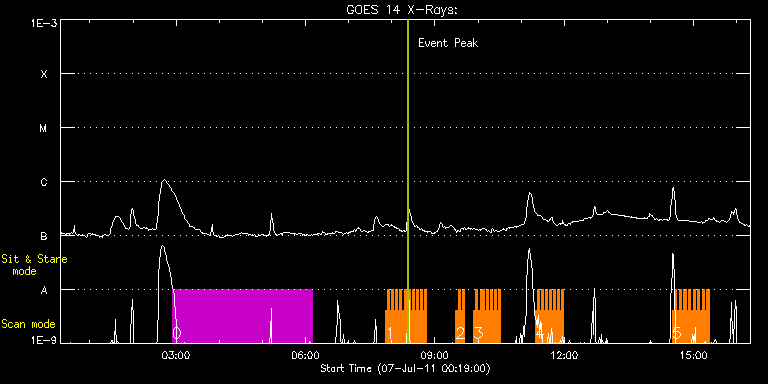 EIS Observation timeline overlay to GOES-Xray curve Code 1" 2" 40" 266" EIS Observations list for this event: STUDY ACRONYM ID DATE OBSERVED DESCRIPTION NOAA# TARGET 0 SYNOP006 | 23168 | 2011/07/07 02:54:26 | Sensitivity Monitor | | Quiet Sun TIMELINE ID DATE OBSERVED FITS FILE XCEN (+W/-E) YCEN (+N/-S) DUR ----------------------------------------------------------------------------------------------------------------- 23168 | 2011/07/07 02:54:26.000 | eis_l0_20110707_025426.fits.gz | -2.34 | 0.20 | 3h15m33s 1 HH_Flare_60x152f | 23185 | 2011/07/07 07:51:26 | Active Region observations - Aoki | 1243 | Flare TIMELINE ID DATE OBSERVED FITS FILE XCEN (+W/-E) YCEN (+N/-S) DUR ----------------------------------------------------------------------------------------------------------------- 23185 | 2011/07/07 07:51:26.000 | eis_l0_20110707_075126.fits.gz | 673.09 | 190.46 | 2m47s 23185 | 2011/07/07 07:54:16.000 | eis_l0_20110707_075416.fits.gz | 673.40 | 190.69 | 2m47s 23185 | 2011/07/07 07:57:06.000 | eis_l0_20110707_075706.fits.gz | 673.63 | 190.61 | 2m48s 23185 | 2011/07/07 07:59:57.000 | eis_l0_20110707_075957.fits.gz | 673.94 | 190.53 | 2m47s 23185 | 2011/07/07 08:02:47.000 | eis_l0_20110707_080247.fits.gz | 674.17 | 190.46 | 2m48s 23185 | 2011/07/07 08:05:38.000 | eis_l0_20110707_080538.fits.gz | 674.48 | 190.61 | 2m47s 23185 | 2011/07/07 08:08:28.000 | eis_l0_20110707_080828.fits.gz | 674.79 | 190.61 | 2m49s 23185 | 2011/07/07 08:11:19.000 | eis_l0_20110707_081119.fits.gz | 675.10 | 190.53 | 2m48s 23185 | 2011/07/07 08:14:10.000 | eis_l0_20110707_081410.fits.gz | 675.33 | 190.61 | 2m48s 23185 | 2011/07/07 08:17:01.000 | eis_l0_20110707_081701.fits.gz | 675.57 | 190.61 | 2m47s 23185 | 2011/07/07 08:19:51.000 | eis_l0_20110707_081951.fits.gz | 675.87 | 190.53 | 2m48s 23185 | 2011/07/07 08:22:42.000 | eis_l0_20110707_082242.fits.gz | 676.18 | 190.61 | 2m48s 23185 | 2011/07/07 08:25:33.000 | eis_l0_20110707_082533.fits.gz | 676.41 | 190.76 | 2m48s 23185 | 2011/07/07 08:28:24.000 | eis_l0_20110707_082824.fits.gz | 676.65 | 190.76 | 2m48s 23185 | 2011/07/07 08:31:15.000 | eis_l0_20110707_083115.fits.gz | 676.96 | 190.76 | 2m48s 23185 | 2011/07/07 08:34:05.000 | eis_l0_20110707_083405.fits.gz | 677.26 | 190.69 | 2m48s 23185 | 2011/07/07 08:36:56.000 | eis_l0_20110707_083656.fits.gz | 677.50 | 190.69 | 2m48s 23185 | 2011/07/07 08:39:46.000 | eis_l0_20110707_083946.fits.gz | 677.96 | 190.69 | 2m49s 23185 | 2011/07/07 08:42:37.000 | eis_l0_20110707_084237.fits.gz | 678.19 | 190.84 | 2m48s 23185 | 2011/07/07 08:45:28.000 | eis_l0_20110707_084528.fits.gz | 678.42 | 190.76 | 2m48s 2 HH_Flare_60x152f | 23186 | 2011/07/07 09:29:12 | Active Region observations - Aoki | 1243 | Flare TIMELINE ID DATE OBSERVED FITS FILE XCEN (+W/-E) YCEN (+N/-S) DUR ----------------------------------------------------------------------------------------------------------------- 23186 | 2011/07/07 09:29:12.000 | eis_l0_20110707_092912.fits.gz | 682.67 | 191.07 | 2m49s 23186 | 2011/07/07 09:32:04.000 | eis_l0_20110707_093204.fits.gz | 683.06 | 191.15 | 2m48s 23186 | 2011/07/07 09:34:54.000 | eis_l0_20110707_093454.fits.gz | 683.29 | 191.15 | 2m49s 23186 | 2011/07/07 09:37:46.000 | eis_l0_20110707_093746.fits.gz | 683.60 | 191.00 | 2m48s 3 HH_Flare_60x152f | 23187 | 2011/07/07 09:54:12 | Active Region observations - Aoki | 1243 | Flare TIMELINE ID DATE OBSERVED FITS FILE XCEN (+W/-E) YCEN (+N/-S) DUR ----------------------------------------------------------------------------------------------------------------- 23187 | 2011/07/07 09:54:12.000 | eis_l0_20110707_095412.fits.gz | 685.22 | 191.15 | 2m48s 23187 | 2011/07/07 09:57:03.000 | eis_l0_20110707_095703.fits.gz | 685.38 | 191.23 | 2m48s 23187 | 2011/07/07 09:59:54.000 | eis_l0_20110707_095954.fits.gz | 685.76 | 191.15 | 2m48s 23187 | 2011/07/07 10:02:45.000 | eis_l0_20110707_100245.fits.gz | 685.99 | 191.23 | 2m49s 23187 | 2011/07/07 10:05:37.000 | eis_l0_20110707_100537.fits.gz | 686.30 | 191.31 | 21s 23187 | 2011/07/07 10:06:05.000 | eis_l0_20110707_100605.fits.gz | 686.38 | 191.15 | 2m20s 23187 | 2011/07/07 10:08:28.000 | eis_l0_20110707_100828.fits.gz | 686.53 | 191.31 | 2m48s 23187 | 2011/07/07 10:11:18.000 | eis_l0_20110707_101118.fits.gz | 686.77 | 191.31 | 2m48s 23187 | 2011/07/07 10:14:09.000 | eis_l0_20110707_101409.fits.gz | 687.08 | 191.31 | 2m48s 23187 | 2011/07/07 10:16:59.000 | eis_l0_20110707_101659.fits.gz | 687.46 | 191.38 | 2m48s 23187 | 2011/07/07 10:19:50.000 | eis_l0_20110707_101950.fits.gz | 687.69 | 191.31 | 2m48s 23187 | 2011/07/07 10:22:41.000 | eis_l0_20110707_102241.fits.gz | 687.92 | 191.31 | 2m48s 23187 | 2011/07/07 10:25:32.000 | eis_l0_20110707_102532.fits.gz | 688.16 | 191.46 | 2m48s 23187 | 2011/07/07 10:28:23.000 | eis_l0_20110707_102823.fits.gz | 688.47 | 191.46 | 2m48s 4 HH_Flare_60x152f | 23202 | 2011/07/07 11:19:15 | Active Region observations - Aoki | | Flare TIMELINE ID DATE OBSERVED FITS FILE XCEN (+W/-E) YCEN (+N/-S) DUR ----------------------------------------------------------------------------------------------------------------- 23202 | 2011/07/07 11:19:15.000 | eis_l0_20110707_111915.fits.gz | 694.03 | 224.53 | 2m49s 23202 | 2011/07/07 11:22:07.000 | eis_l0_20110707_112207.fits.gz | 694.27 | 224.53 | 2m48s 23202 | 2011/07/07 11:24:58.000 | eis_l0_20110707_112458.fits.gz | 694.50 | 224.45 | 2m48s 23202 | 2011/07/07 11:27:48.000 | eis_l0_20110707_112748.fits.gz | 694.81 | 224.45 | 2m49s 23202 | 2011/07/07 11:30:39.000 | eis_l0_20110707_113039.fits.gz | 695.04 | 224.37 | 2m48s 23202 | 2011/07/07 11:33:30.000 | eis_l0_20110707_113330.fits.gz | 695.12 | 224.45 | 2m48s 23202 | 2011/07/07 11:36:20.000 | eis_l0_20110707_113620.fits.gz | 695.35 | 224.53 | 2m48s 23202 | 2011/07/07 11:39:11.000 | eis_l0_20110707_113911.fits.gz | 695.66 | 224.45 | 2m48s 23202 | 2011/07/07 11:42:02.000 | eis_l0_20110707_114202.fits.gz | 695.97 | 224.60 | 2m48s 23202 | 2011/07/07 11:44:53.000 | eis_l0_20110707_114453.fits.gz | 696.20 | 224.60 | 2m48s 23202