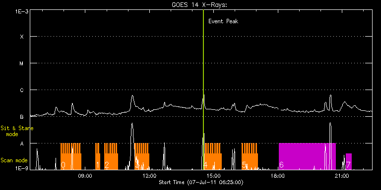 EIS Observation timeline overlay to GOES-Xray curve Code 1" 2" 40" 266" EIS Observations list for this event: STUDY ACRONYM ID DATE OBSERVED DESCRIPTION NOAA# TARGET 0 HH_Flare_60x152f | 23185 | 2011/07/07 07:51:26 | Active Region observations - Aoki | 1243 | Flare TIMELINE ID DATE OBSERVED FITS FILE XCEN (+W/-E) YCEN (+N/-S) DUR ----------------------------------------------------------------------------------------------------------------- 23185 | 2011/07/07 07:51:26.000 | eis_l0_20110707_075126.fits.gz | 673.09 | 190.46 | 2m47s 23185 | 2011/07/07 07:54:16.000 | eis_l0_20110707_075416.fits.gz | 673.40 | 190.69 | 2m47s 23185 | 2011/07/07 07:57:06.000 | eis_l0_20110707_075706.fits.gz | 673.63 | 190.61 | 2m48s 23185 | 2011/07/07 07:59:57.000 | eis_l0_20110707_075957.fits.gz | 673.94 | 190.53 | 2m47s 23185 | 2011/07/07 08:02:47.000 | eis_l0_20110707_080247.fits.gz | 674.17 | 190.46 | 2m48s 23185 | 2011/07/07 08:05:38.000 | eis_l0_20110707_080538.fits.gz | 674.48 | 190.61 | 2m47s 23185 | 2011/07/07 08:08:28.000 | eis_l0_20110707_080828.fits.gz | 674.79 | 190.61 | 2m49s 23185 | 2011/07/07 08:11:19.000 | eis_l0_20110707_081119.fits.gz | 675.10 | 190.53 | 2m48s 23185 | 2011/07/07 08:14:10.000 | eis_l0_20110707_081410.fits.gz | 675.33 | 190.61 | 2m48s 23185 | 2011/07/07 08:17:01.000 | eis_l0_20110707_081701.fits.gz | 675.57 | 190.61 | 2m47s 23185 | 2011/07/07 08:19:51.000 | eis_l0_20110707_081951.fits.gz | 675.87 | 190.53 | 2m48s 23185 | 2011/07/07 08:22:42.000 | eis_l0_20110707_082242.fits.gz | 676.18 | 190.61 | 2m48s 23185 | 2011/07/07 08:25:33.000 | eis_l0_20110707_082533.fits.gz | 676.41 | 190.76 | 2m48s 23185 | 2011/07/07 08:28:24.000 | eis_l0_20110707_082824.fits.gz | 676.65 | 190.76 | 2m48s 23185 | 2011/07/07 08:31:15.000 | eis_l0_20110707_083115.fits.gz | 676.96 | 190.76 | 2m48s 23185 | 2011/07/07 08:34:05.000 | eis_l0_20110707_083405.fits.gz | 677.26 | 190.69 | 2m48s 23185 | 2011/07/07 08:36:56.000 | eis_l0_20110707_083656.fits.gz | 677.50 | 190.69 | 2m48s 23185 | 2011/07/07 08:39:46.000 | eis_l0_20110707_083946.fits.gz | 677.96 | 190.69 | 2m49s 23185 | 2011/07/07 08:42:37.000 | eis_l0_20110707_084237.fits.gz | 678.19 | 190.84 | 2m48s 23185 | 2011/07/07 08:45:28.000 | eis_l0_20110707_084528.fits.gz | 678.42 | 190.76 | 2m48s 1 HH_Flare_60x152f | 23186 | 2011/07/07 09:29:12 | Active Region observations - Aoki | 1243 | Flare TIMELINE ID DATE OBSERVED FITS FILE XCEN (+W/-E) YCEN (+N/-S) DUR ----------------------------------------------------------------------------------------------------------------- 23186 | 2011/07/07 09:29:12.000 | eis_l0_20110707_092912.fits.gz | 682.67 | 191.07 | 2m49s 23186 | 2011/07/07 09:32:04.000 | eis_l0_20110707_093204.fits.gz | 683.06 | 191.15 | 2m48s 23186 | 2011/07/07 09:34:54.000 | eis_l0_20110707_093454.fits.gz | 683.29 | 191.15 | 2m49s 23186 | 2011/07/07 09:37:46.000 | eis_l0_20110707_093746.fits.gz | 683.60 | 191.00 | 2m48s 2 HH_Flare_60x152f | 23187 | 2011/07/07 09:54:12 | Active Region observations - Aoki | 1243 | Flare TIMELINE ID DATE OBSERVED FITS FILE XCEN (+W/-E) YCEN (+N/-S) DUR ----------------------------------------------------------------------------------------------------------------- 23187 | 2011/07/07 09:54:12.000 | eis_l0_20110707_095412.fits.gz | 685.22 | 191.15 | 2m48s 23187 | 2011/07/07 09:57:03.000 | eis_l0_20110707_095703.fits.gz | 685.38 | 191.23 | 2m48s 23187 | 2011/07/07 09:59:54.000 | eis_l0_20110707_095954.fits.gz | 685.76 | 191.15 | 2m48s 23187 | 2011/07/07 10:02:45.000 | eis_l0_20110707_100245.fits.gz | 685.99 | 191.23 | 2m49s 23187 | 2011/07/07 10:05:37.000 | eis_l0_20110707_100537.fits.gz | 686.30 | 191.31 | 21s 23187 | 2011/07/07 10:06:05.000 | eis_l0_20110707_100605.fits.gz | 686.38 | 191.15 | 2m20s 23187 | 2011/07/07 10:08:28.000 | eis_l0_20110707_100828.fits.gz | 686.53 | 191.31 | 2m48s 23187 | 2011/07/07 10:11:18.000 | eis_l0_20110707_101118.fits.gz | 686.77 | 191.31 | 2m48s 23187 | 2011/07/07 10:14:09.000 | eis_l0_20110707_101409.fits.gz | 687.08 | 191.31 | 2m48s 23187 | 2011/07/07 10:16:59.000 | eis_l0_20110707_101659.fits.gz | 687.46 | 191.38 | 2m48s 23187 | 2011/07/07 10:19:50.000 | eis_l0_20110707_101950.fits.gz | 687.69 | 191.31 | 2m48s 23187 | 2011/07/07 10:22:41.000 | eis_l0_20110707_102241.fits.gz | 687.92 | 191.31 | 2m48s 23187 | 2011/07/07 10:25:32.000 | eis_l0_20110707_102532.fits.gz | 688.16 | 191.46 | 2m48s 23187 | 2011/07/07 10:28:23.000 | eis_l0_20110707_102823.fits.gz | 688.47 | 191.46 | 2m48s 3 HH_Flare_60x152f | 23202 | 2011/07/07 11:19:15 | Active Region observations - Aoki | | Flare TIMELINE ID DATE OBSERVED FITS FILE XCEN (+W/-E) YCEN (+N/-S) DUR ----------------------------------------------------------------------------------------------------------------- 23202 | 2011/07/07 11:19:15.000 | eis_l0_20110707_111915.fits.gz | 694.03 | 224.53 | 2m49s 23202 | 2011/07/07 11:22:07.000 | eis_l0_20110707_112207.fits.gz | 694.27 | 224.53 | 2m48s 23202 | 2011/07/07 11:24:58.000 | eis_l0_20110707_112458.fits.gz | 694.50 | 224.45 | 2m48s 23202 | 2011/07/07 11:27:48.000 | eis_l0_20110707_112748.fits.gz | 694.81 | 224.45 | 2m49s 23202 | 2011/07/07 11:30:39.000 | eis_l0_20110707_113039.fits.gz | 695.04 | 224.37 | 2m48s 23202 | 2011/07/07 11:33:30.000 | eis_l0_20110707_113330.fits.gz | 695.12 | 224.45 | 2m48s 23202 | 2011/07/07 11:36:20.000 | eis_l0_20110707_113620.fits.gz | 695.35 | 224.53 | 2m48s 23202 | 2011/07/07 11:39:11.000 | eis_l0_20110707_113911.fits.gz | 695.66 | 224.45 | 2m48s 23202 | 2011/07/07 11:42:02.000 | eis_l0_20110707_114202.fits.gz | 695.97 | 224.60 | 2m48s 23202 | 2011/07/07 11:44:53.000 | eis_l0_20110707_114453.fits.gz | 696.20 | 224.60 | 2m48s 23202 | 2011/07/07 11:47:44.000 | eis_l0_20110707_114744.fits.gz | 696.51 | 224.53 | 2m47s 23202 | 2011/07/07 11:50:34.000 | eis_l0_20110707_115034.fits.gz | 696.66 | 224.60 | 2m48s 23202 | 2011/07/07 11:53:25.000 | eis_l0_20110707_115325.fits.gz | 696.89 | 224.60 | 2m48s 23202 | 2011/07/07 11:56:16.000 | eis_l0_20110707_115616.fits.gz | 697.20 | 224.
