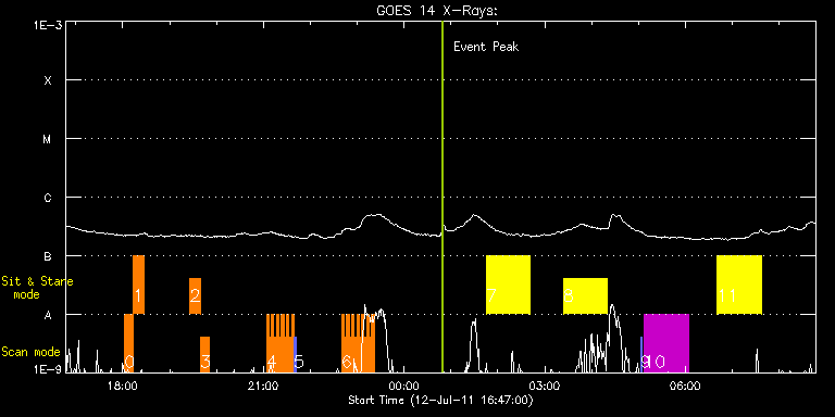 EIS Observation timeline overlay to GOES-Xray curve Code 1" 2" 40" 266" EIS Observations list for this event: STUDY ACRONYM ID DATE OBSERVED DESCRIPTION NOAA# TARGET 0 Cool_loop_response | 23257 | 2011/07/12 18:02:41 | HOP 191: Joint Obs. with BBSO | | Active Region TIMELINE ID DATE OBSERVED FITS FILE XCEN (+W/-E) YCEN (+N/-S) DUR ----------------------------------------------------------------------------------------------------------------- 23257 | 2011/07/12 18:02:41.000 | eis_l0_20110712_180241.fits.gz | 233.67 | 91.50 | 10m48s 1 madj_qs_sns_15m | 23258 | 2011/07/12 18:13:33 | HOP 191: Joint Obs. with BBSO | | Quiet Sun TIMELINE ID DATE OBSERVED FITS FILE XCEN (+W/-E) YCEN (+N/-S) DUR ----------------------------------------------------------------------------------------------------------------- 23258 | 2011/07/12 18:13:33.000 | eis_l0_20110712_181333.fits.gz | 235.87 | 91.42 | 13m8s 2 madj_qs_sns_15m | 23259 | 2011/07/12 19:26:13 | HOP 191: Joint Obs. with BBSO | | Quiet Sun TIMELINE ID DATE OBSERVED FITS FILE XCEN (+W/-E) YCEN (+N/-S) DUR ----------------------------------------------------------------------------------------------------------------- 23259 | 2011/07/12 19:26:13.000 | eis_l0_20110712_192613.fits.gz | 246.38 | 91.66 | 13m9s 3 Cool_loop_response | 23260 | 2011/07/12 19:39:26 | HOP 191: Joint Obs. with BBSO | | Active Region TIMELINE ID DATE OBSERVED FITS FILE XCEN (+W/-E) YCEN (+N/-S) DUR ----------------------------------------------------------------------------------------------------------------- 23260 | 2011/07/12 19:39:26.000 | eis_l0_20110712_193926.fits.gz | 247.81 | 91.66 | 10m49s 4 qub_hi-cad_flare_v1 | 23275 | 2011/07/12 21:03:43 | Hi-cadence flare hunt on AR 11247 | 1247 | Flare TIMELINE ID DATE OBSERVED FITS FILE XCEN (+W/-E) YCEN (+N/-S) DUR ----------------------------------------------------------------------------------------------------------------- 23275 | 2011/07/12 21:03:43.000 | eis_l0_20110712_210343.fits.gz | 546.22 | -351.16 | 3m10s 23275 | 2011/07/12 21:06:56.000 | eis_l0_20110712_210656.fits.gz | 546.52 | -351.08 | 3m9s 23275 | 2011/07/12 21:10:08.000 | eis_l0_20110712_211008.fits.gz | 546.91 | -351.08 | 3m9s 23275 | 2011/07/12 21:13:20.000 | eis_l0_20110712_211320.fits.gz | 547.30 | -351.08 | 3m10s 23275 | 2011/07/12 21:16:32.000 | eis_l0_20110712_211632.fits.gz | 547.60 | -351.08 | 3m10s 23275 | 2011/07/12 21:19:45.000 | eis_l0_20110712_211945.fits.gz | 547.91 | -351.01 | 3m10s 23275 | 2011/07/12 21:22:57.000 | eis_l0_20110712_212257.fits.gz | 548.22 | -351.08 | 3m10s 23275 | 2011/07/12 21:26:10.000 | eis_l0_20110712_212610.fits.gz | 548.61 | -351.01 | 3m10s 23275 | 2011/07/12 21:29:23.000 | eis_l0_20110712_212923.fits.gz | 548.92 | -351.08 | 3m10s 23275 | 2011/07/12 21:32:35.000 | eis_l0_20110712_213235.fits.gz | 549.30 | -351.01 | 3m10s 23275 | 2011/07/12 21:35:48.000 | eis_l0_20110712_213548.fits.gz | 549.54 | -351.01 | 3m10s 5 PRY_slot_context_v3 | 23277 | 2011/07/12 21:39:08 | | 1247 | Active Region TIMELINE ID DATE OBSERVED FITS FILE XCEN (+W/-E) YCEN (+N/-S) DUR ----------------------------------------------------------------------------------------------------------------- 23277 | 2011/07/12 21:39:08.000 | eis_l0_20110712_213908.fits.gz | 551.98 | -395.85 | 2m57s 6 qub_hi-cad_flare_v1 | 23278 | 2011/07/12 22:40:04 | Hi-cadence flare hunt on AR 11247 | 1247 | Flare TIMELINE ID DATE OBSERVED FITS FILE XCEN (+W/-E) YCEN (+N/-S) DUR ----------------------------------------------------------------------------------------------------------------- 23278 | 2011/07/12 22:40:04.000 | eis_l0_20110712_224004.fits.gz | 556.41 | -350.54 | 3m10s 23278 | 2011/07/12 22:43:16.000 | eis_l0_20110712_224316.fits.gz | 556.80 | -350.47 | 3m10s 23278 | 2011/07/12 22:46:29.000 | eis_l0_20110712_224629.fits.gz | 557.18 | -350.54 | 3m10s 23278 | 2011/07/12 22:49:42.000 | eis_l0_20110712_224942.fits.gz | 557.49 | -350.47 | 3m10s 23278 | 2011/07/12 22:52:54.000 | eis_l0_20110712_225254.fits.gz | 557.80 | -350.54 | 3m10s 23278 | 2011/07/12 22:56:07.000 | eis_l0_20110712_225607.fits.gz | 558.11 | -350.47 | 3m9s 23278 | 2011/07/12 22:59:19.000 | eis_l0_20110712_225919.fits.gz | 558.50 | -350.47 | 3m10s 23278 | 2011/07/12 23:02:32.000 | eis_l0_20110712_230232.fits.gz | 558.73 | -350.54 | 3m10s 23278 | 2011/07/12 23:05:44.000 | eis_l0_20110712_230544.fits.gz | 559.11 | -350.54 | 3m9s 23278 | 2011/07/12 23:08:56.000 | eis_l0_20110712_230856.fits.gz | 559.42 | -350.31 | 3m10s 23278 | 2011/07/12 23:12:08.000 | eis_l0_20110712_231208.fits.gz | 559.81 | -350.47 | 3m10s 23278 | 2011/07/12 23:15:21.000 | eis_l0_20110712_231521.fits.gz | 560.20 | -350.23 | 3m9s 23278 | 2011/07/12 23:18:33.000 | eis_l0_20110712_231833.fits.gz | 560.51 | -350.31 | 3m10s 7 FLARE266_TEST1 | 23248 | 2011/07/13 01:45:34 | EIS Flare Trigger Testing (control cas | 1247 | Active Region TIMELINE ID DATE OBSERVED FITS FILE XCEN (+W/-E) YCEN (+N/-S) DUR ----------------------------------------------------------------------------------------------------------------- 23248 | 2011/07/13 01:45:34.000 | eis_l0_20110713_014534.fits.gz | 460.36 | -394.39 | 55m59s 8 FLARE266_TEST1 | 23249 | 2011/07/13 03:23:43 | EIS Flare Trigger Testing | 1247 | Active Region TIMELINE ID DATE OBSERVED FITS FILE XCEN (+W/-E) YCEN (+N/-S) DUR ----------------------------------------------------------------------------------------------------------------- 23249 | 2011/07/13 03:23:43.000 | eis_l0_20110713_032343.fits.gz | 470.32 | -393.85 | 56m47s 9 PRY_slot_context_v2 | 23281 | 2011/07/13 05:02:27 | | 1247 | Active Region TIMELINE ID DATE OBSERVED FITS FILE XCEN (+W/-E) YCEN (+N/-S) DUR ----------------------------------------------------------------------------------------------------------------- 23281 | 2011/07/13 05:02:27.000 | eis_l0_20110713_050227.fits.gz | 593.74 | -393.23 | 2m33s 10 HPW008_FULLCCD_RAST | 23279 | 2011/07/13 05:07:20 | Full AR spectrum with 1" slit (William | 1247 | Active Region TIMELINE ID DATE OBSERV