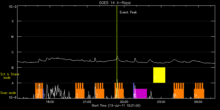 EIS Observation timeline overlay to GOES-Xray curve Code 1" 2" 40" 266" EIS Observations list for this event: STUDY ACRONYM ID DATE OBSERVED DESCRIPTION NOAA# TARGET 0 qub_hi-cad_flare_v1 | 23267 | 2011/07/13 16:49:13 | HOP 188: Joint Solar Flare Observation | | Flare TIMELINE ID DATE OBSERVED FITS FILE XCEN (+W/-E) YCEN (+N/-S) DUR ----------------------------------------------------------------------------------------------------------------- 23267 | 2011/07/13 16:49:13.000 | eis_l0_20110713_164913.fits.gz | 662.03 | -341.36 | 3m10s 23267 | 2011/07/13 16:52:25.000 | eis_l0_20110713_165225.fits.gz | 662.34 | -341.36 | 3m10s 23267 | 2011/07/13 16:55:38.000 | eis_l0_20110713_165538.fits.gz | 662.65 | -341.52 | 3m9s 23267 | 2011/07/13 16:58:50.000 | eis_l0_20110713_165850.fits.gz | 662.88 | -341.36 | 3m10s 23267 | 2011/07/13 17:02:03.000 | eis_l0_20110713_170203.fits.gz | 663.26 | -341.36 | 3m10s 23267 | 2011/07/13 17:05:16.000 | eis_l0_20110713_170516.fits.gz | 663.49 | -341.36 | 3m9s 23267 | 2011/07/13 17:08:28.000 | eis_l0_20110713_170828.fits.gz | 663.80 | -341.44 | 3m10s 23267 | 2011/07/13 17:11:41.000 | eis_l0_20110713_171141.fits.gz | 664.03 | -341.28 | 3m9s 23267 | 2011/07/13 17:14:53.000 | eis_l0_20110713_171453.fits.gz | 664.27 | -341.44 | 3m10s 23267 | 2011/07/13 17:18:05.000 | eis_l0_20110713_171805.fits.gz | 664.65 | -341.13 | 3m10s 23267 | 2011/07/13 17:21:17.000 | eis_l0_20110713_172117.fits.gz | 664.96 | -341.21 | 3m10s 1 PRY_slot_context_v3 | 23268 | 2011/07/13 17:24:38 | | 1247 | Active Region TIMELINE ID DATE OBSERVED FITS FILE XCEN (+W/-E) YCEN (+N/-S) DUR ----------------------------------------------------------------------------------------------------------------- 23268 | 2011/07/13 17:24:38.000 | eis_l0_20110713_172438.fits.gz | 667.01 | -388.13 | 2m57s 2 HH_Flare+AR_180x152 | 23269 | 2011/07/13 20:03:33 | Flare hunting | 1247 | Flare TIMELINE ID DATE OBSERVED FITS FILE XCEN (+W/-E) YCEN (+N/-S) DUR ----------------------------------------------------------------------------------------------------------------- 23269 | 2011/07/13 20:03:33.000 | eis_l0_20110713_200333.fits.gz | 683.19 | -352.05 | 5m19s 23269 | 2011/07/13 20:08:54.000 | eis_l0_20110713_200854.fits.gz | 683.57 | -351.89 | 5m18s 23269 | 2011/07/13 20:14:15.000 | eis_l0_20110713_201415.fits.gz | 683.96 | -351.97 | 5m17s 23269 | 2011/07/13 20:19:35.000 | eis_l0_20110713_201935.fits.gz | 684.58 | -351.97 | 5m18s 23269 | 2011/07/13 20:24:55.000 | eis_l0_20110713_202455.fits.gz | 684.96 | -351.89 | 5m19s 23269 | 2011/07/13 20:30:17.000 | eis_l0_20110713_203017.fits.gz | 685.27 | -351.82 | 5m18s 23269 | 2011/07/13 20:35:38.000 | eis_l0_20110713_203538.fits.gz | 685.81 | -351.74 | 5m18s 23269 | 2011/07/13 20:40:58.000 | eis_l0_20110713_204058.fits.gz | 686.35 | -351.66 | 5m18s 3 HH_Flare+AR_180x152 | 23270 | 2011/07/13 21:40:13 | Flare hunting | 1247 | Flare TIMELINE ID DATE OBSERVED FITS FILE XCEN (+W/-E) YCEN (+N/-S) DUR ----------------------------------------------------------------------------------------------------------------- 23270 | 2011/07/13 21:40:13.000 | eis_l0_20110713_214013.fits.gz | 691.30 | -351.27 | 5m18s 23270 | 2011/07/13 21:45:34.000 | eis_l0_20110713_214534.fits.gz | 691.68 | -351.27 | 5m18s 23270 | 2011/07/13 21:50:55.000 | eis_l0_20110713_215055.fits.gz | 692.07 | -351.12 | 5m18s 23270 | 2011/07/13 21:56:16.000 | eis_l0_20110713_215616.fits.gz | 692.53 | -351.12 | 5m17s 23270 | 2011/07/13 22:01:36.000 | eis_l0_20110713_220136.fits.gz | 693.00 | -351.12 | 5m18s 23270 | 2011/07/13 22:06:57.000 | eis_l0_20110713_220657.fits.gz | 693.38 | -351.20 | 5m18s 23270 | 2011/07/13 22:12:18.000 | eis_l0_20110713_221218.fits.gz | 693.85 | -351.04 | 5m18s 23270 | 2011/07/13 22:17:39.000 | eis_l0_20110713_221739.fits.gz | 694.31 | -350.97 | 5m18s 4 HH_Flare+AR_180x152 | 23271 | 2011/07/13 23:14:13 | Flare hunting | 1247 | Flare TIMELINE ID DATE OBSERVED FITS FILE XCEN (+W/-E) YCEN (+N/-S) DUR ----------------------------------------------------------------------------------------------------------------- 23271 | 2011/07/13 23:14:13.000 | eis_l0_20110713_231413.fits.gz | 698.95 | -350.50 | 5m18s 23271 | 2011/07/13 23:19:33.000 | eis_l0_20110713_231933.fits.gz | 699.33 | -350.50 | 5m18s 23271 | 2011/07/13 23:24:54.000 | eis_l0_20110713_232454.fits.gz | 699.87 | -350.58 | 5m18s 23271 | 2011/07/13 23:30:15.000 | eis_l0_20110713_233015.fits.gz | 700.18 | -350.35 | 5m18s 23271 | 2011/07/13 23:35:36.000 | eis_l0_20110713_233536.fits.gz | 700.65 | -350.27 | 5m18s 23271 | 2011/07/13 23:40:57.000 | eis_l0_20110713_234057.fits.gz | 701.19 | -350.35 | 5m18s 23271 | 2011/07/13 23:46:18.000 | eis_l0_20110713_234618.fits.gz | 701.49 | -350.35 | 5m19s 23271 | 2011/07/13 23:51:39.000 | eis_l0_20110713_235139.fits.gz | 701.96 | -350.27 | 5m18s 5 PRY_slot_context_v3 | 23282 | 2011/07/14 00:43:49 | Context slot raster | 1247 | Active Region TIMELINE ID DATE OBSERVED FITS FILE XCEN (+W/-E) YCEN (+N/-S) DUR ----------------------------------------------------------------------------------------------------------------- 23282 | 2011/07/14 00:43:49.000 | eis_l0_20110714_004349.fits.gz | 703.62 | -384.81 | 2m56s 6 inn_ar_lmb_ra01 | 23283 | 2011/07/14 00:46:57 | Double-exposure raster across 11247 (W | | Active Region TIMELINE ID DATE OBSERVED FITS FILE XCEN (+W/-E) YCEN (+N/-S) DUR ----------------------------------------------------------------------------------------------------------------- 23283 | 2011/07/14 00:46:57.000 | eis_l0_20110714_004657.fits.gz | 686.13 | -390.65 | 1h3m7s 7 FLARE266_TEST1 | 23252 | 2011/07/14 02:22:19 | EIS Flare Trigger Testing | 1249 | Active Region TIMELINE ID DATE OBSERVED FITS FILE XCEN (+W/-E) YCEN (+N/-S) DUR ----------------------------------------------------------------------------------------------------------------- 23252 | 2011/07/14 02:22:19.000 | eis_l0_20110714_022219.fits.gz | 593.99 | -384.03 | 56m47s 8 HH_Flare+AR_180x152 | 23272 | 2011/07/14 04:00:49 | Flare hunting | 1247 |