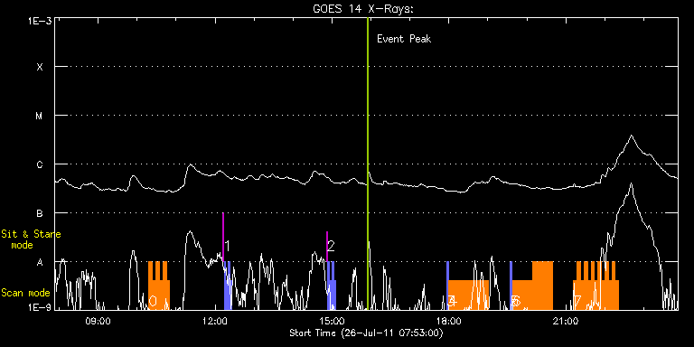 EIS Observation timeline overlay to GOES-Xray curve Code 1" 2" 40" 266" EIS Observations list for this event: STUDY ACRONYM ID DATE OBSERVED DESCRIPTION NOAA# TARGET 0 HH_Flare+AR_180x152 | 23464 | 2011/07/26 10:18:14 | AR observation | 1259 | Flare TIMELINE ID DATE OBSERVED FITS FILE XCEN (+W/-E) YCEN (+N/-S) DUR ----------------------------------------------------------------------------------------------------------------- 23464 | 2011/07/26 10:18:14.000 | eis_l0_20110726_101814.fits.gz | 398.82 | 281.92 | 5m17s 23464 | 2011/07/26 10:23:34.000 | eis_l0_20110726_102334.fits.gz | 399.51 | 281.92 | 5m18s 23464 | 2011/07/26 10:28:55.000 | eis_l0_20110726_102855.fits.gz | 400.21 | 281.92 | 5m17s 23464 | 2011/07/26 10:34:15.000 | eis_l0_20110726_103415.fits.gz | 400.90 | 281.99 | 5m17s 23464 | 2011/07/26 10:39:35.000 | eis_l0_20110726_103935.fits.gz | 401.44 | 281.99 | 5m18s 23464 | 2011/07/26 10:44:56.000 | eis_l0_20110726_104456.fits.gz | 402.29 | 281.84 | 5m18s 1 Alignment_modify_v2 | 23465 | 2011/07/26 12:12:27 | Hinode instrument alignment programme | | Quiet Sun TIMELINE ID DATE OBSERVED FITS FILE XCEN (+W/-E) YCEN (+N/-S) DUR ----------------------------------------------------------------------------------------------------------------- 23465 | 2011/07/26 12:12:27.000 | eis_l0_20110726_121227.fits.gz | -0.10 | 944.70 | 1m 23465 | 2011/07/26 12:13:52.000 | eis_l0_20110726_121352.fits.gz | -9.50 | 944.47 | 2m34s 23465 | 2011/07/26 12:17:00.000 | eis_l0_20110726_121700.fits.gz | -9.58 | 944.55 | 2m34s 23465 | 2011/07/26 12:20:08.000 | eis_l0_20110726_122008.fits.gz | -9.50 | 944.62 | 2m33s 23465 | 2011/07/26 12:23:15.000 | eis_l0_20110726_122315.fits.gz | -9.50 | 944.47 | 2m34s 2 Alignment_modify_v2 | 23466 | 2011/07/26 14:52:20 | Hinode instrument alignment programme | | Quiet Sun TIMELINE ID DATE OBSERVED FITS FILE XCEN (+W/-E) YCEN (+N/-S) DUR ----------------------------------------------------------------------------------------------------------------- 23466 | 2011/07/26 14:52:20.000 | eis_l0_20110726_145220.fits.gz | -9869.50 | -9963.20 | 1m 23466 | 2011/07/26 14:53:45.000 | eis_l0_20110726_145345.fits.gz | -9878.98 | -9963.20 | 2m34s 23466 | 2011/07/26 14:56:53.000 | eis_l0_20110726_145653.fits.gz | -9878.98 | -9963.20 | 2m34s 23466 | 2011/07/26 15:00:00.000 | eis_l0_20110726_150000.fits.gz | -9878.98 | -9963.20 | 2m34s 23466 | 2011/07/26 15:03:08.000 | eis_l0_20110726_150308.fits.gz | -9878.98 | -9963.20 | 2m34s 3 PRY_slot_context_v3 | 23478 | 2011/07/26 17:56:13 | EIS Spectral Atlas Synoptic programme | | Active Region TIMELINE ID DATE OBSERVED FITS FILE XCEN (+W/-E) YCEN (+N/-S) DUR ----------------------------------------------------------------------------------------------------------------- 23478 | 2011/07/26 17:56:13.000 | eis_l0_20110726_175613.fits.gz | -1.57 | -30.94 | 2m56s 4 Atlas_60 | 23479 | 2011/07/26 17:59:35 | EIS Spectral Atlas Synoptic programme | | Quiet Sun TIMELINE ID DATE OBSERVED FITS FILE XCEN (+W/-E) YCEN (+N/-S) DUR ----------------------------------------------------------------------------------------------------------------- 23479 | 2011/07/26 17:59:35.000 | eis_l0_20110726_175935.fits.gz | 13.71 | -31.01 | 1h1m39s 5 PRY_slot_context_v3 | 23493 | 2011/07/26 19:34:20 | EIS Spectral Atlas Synoptic programme | | Active Region TIMELINE ID DATE OBSERVED FITS FILE XCEN (+W/-E) YCEN (+N/-S) DUR ----------------------------------------------------------------------------------------------------------------- 23493 | 2011/07/26 19:34:20.000 | eis_l0_20110726_193420.fits.gz | 13.49 | -31.01 | 2m57s 6 Atlas_60 | 23494 | 2011/07/26 19:37:42 | | | Quiet Sun TIMELINE ID DATE OBSERVED FITS FILE XCEN (+W/-E) YCEN (+N/-S) DUR ----------------------------------------------------------------------------------------------------------------- 23494 | 2011/07/26 19:37:42.000 | eis_l0_20110726_193742.fits.gz | 28.77 | -31.09 | 30m49s 23494 | 2011/07/26 20:08:32.000 | eis_l0_20110726_200832.fits.gz | 33.48 | -31.24 | 30m49s 7 HH_Flare+AR_180x152 | 23467 | 2011/07/26 21:12:10 | AR observation | | Flare TIMELINE ID DATE OBSERVED FITS FILE XCEN (+W/-E) YCEN (+N/-S) DUR ----------------------------------------------------------------------------------------------------------------- 23467 | 2011/07/26 21:12:10.000 | eis_l0_20110726_211210.fits.gz | 477.07 | 285.62 | 5m19s 23467 | 2011/07/26 21:17:31.000 | eis_l0_20110726_211731.fits.gz | 477.84 | 285.62 | 5m18s 23467 | 2011/07/26 21:22:52.000 | eis_l0_20110726_212252.fits.gz | 478.54 | 285.62 | 5m18s 23467 | 2011/07/26 21:28:13.000 | eis_l0_20110726_212813.fits.gz | 479.08 | 285.62 | 5m17s 23467 | 2011/07/26 21:33:33.000 | eis_l0_20110726_213333.fits.gz | 479.77 | 285.62 | 5m18s 23467 | 2011/07/26 21:38:54.000 | eis_l0_20110726_213854.fits.gz | 480.31 | 285.78 | 5m18s 23467 | 2011/07/26 21:44:15.000 | eis_l0_20110726_214415.fits.gz | 480.85 | 285.62 | 5m18s 23467 | 2011/07/26 21:49:36.000 | eis_l0_20110726_214936.fits.gz | 481.55 | 285.62 | 5m18s 23467 | 2011/07/26 21:54:57.000 | eis_l0_20110726_215457.fits.gz | 482.17 | 285.70 | 5m17s 23467 | 2011/07/26 22:00:17.000 | eis_l0_20110726_220017.fits.gz | 482.86 | 285.70 | 5m17s 23467 | 2011/07/26 22:05:37.000 | eis_l0_20110726_220537.fits.gz | 483.48 | 285.78 | 5m17s 23467 | 2011/07/26 22:10:57.000 | eis_l0_20110726_221057.fits.gz | 484.02 | 285.78 | 5m18s 23467 | 2011/07/26 22:16:18.000 | eis_l0_20110726_221618.fits.gz | 484.64 | 285.86 | 5m19s : Check study information : Download file : View thumbnails For this event, also check for: