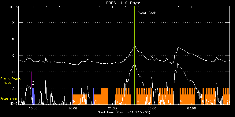 EIS Observation timeline overlay to GOES-Xray curve Code 1" 2" 40" 266" EIS Observations list for this event: STUDY ACRONYM ID DATE OBSERVED DESCRIPTION NOAA# TARGET 0 Alignment_modify_v2 | 23466 | 2011/07/26 14:52:20 | Hinode instrument alignment programme | | Quiet Sun TIMELINE ID DATE OBSERVED FITS FILE XCEN (+W/-E) YCEN (+N/-S) DUR ----------------------------------------------------------------------------------------------------------------- 23466 | 2011/07/26 14:52:20.000 | eis_l0_20110726_145220.fits.gz | -9869.50 | -9963.20 | 1m 23466 | 2011/07/26 14:53:45.000 | eis_l0_20110726_145345.fits.gz | -9878.98 | -9963.20 | 2m34s 23466 | 2011/07/26 14:56:53.000 | eis_l0_20110726_145653.fits.gz | -9878.98 | -9963.20 | 2m34s 23466 | 2011/07/26 15:00:00.000 | eis_l0_20110726_150000.fits.gz | -9878.98 | -9963.20 | 2m34s 23466 | 2011/07/26 15:03:08.000 | eis_l0_20110726_150308.fits.gz | -9878.98 | -9963.20 | 2m34s 1 PRY_slot_context_v3 | 23478 | 2011/07/26 17:56:13 | EIS Spectral Atlas Synoptic programme | | Active Region TIMELINE ID DATE OBSERVED FITS FILE XCEN (+W/-E) YCEN (+N/-S) DUR ----------------------------------------------------------------------------------------------------------------- 23478 | 2011/07/26 17:56:13.000 | eis_l0_20110726_175613.fits.gz | -1.57 | -30.94 | 2m56s 2 Atlas_60 | 23479 | 2011/07/26 17:59:35 | EIS Spectral Atlas Synoptic programme | | Quiet Sun TIMELINE ID DATE OBSERVED FITS FILE XCEN (+W/-E) YCEN (+N/-S) DUR ----------------------------------------------------------------------------------------------------------------- 23479 | 2011/07/26 17:59:35.000 | eis_l0_20110726_175935.fits.gz | 13.71 | -31.01 | 1h1m39s 3 PRY_slot_context_v3 | 23493 | 2011/07/26 19:34:20 | EIS Spectral Atlas Synoptic programme | | Active Region TIMELINE ID DATE OBSERVED FITS FILE XCEN (+W/-E) YCEN (+N/-S) DUR ----------------------------------------------------------------------------------------------------------------- 23493 | 2011/07/26 19:34:20.000 | eis_l0_20110726_193420.fits.gz | 13.49 | -31.01 | 2m57s 4 Atlas_60 | 23494 | 2011/07/26 19:37:42 | | | Quiet Sun TIMELINE ID DATE OBSERVED FITS FILE XCEN (+W/-E) YCEN (+N/-S) DUR ----------------------------------------------------------------------------------------------------------------- 23494 | 2011/07/26 19:37:42.000 | eis_l0_20110726_193742.fits.gz | 28.77 | -31.09 | 30m49s 23494 | 2011/07/26 20:08:32.000 | eis_l0_20110726_200832.fits.gz | 33.48 | -31.24 | 30m49s 5 HH_Flare+AR_180x152 | 23467 | 2011/07/26 21:12:10 | AR observation | | Flare TIMELINE ID DATE OBSERVED FITS FILE XCEN (+W/-E) YCEN (+N/-S) DUR ----------------------------------------------------------------------------------------------------------------- 23467 | 2011/07/26 21:12:10.000 | eis_l0_20110726_211210.fits.gz | 477.07 | 285.62 | 5m19s 23467 | 2011/07/26 21:17:31.000 | eis_l0_20110726_211731.fits.gz | 477.84 | 285.62 | 5m18s 23467 | 2011/07/26 21:22:52.000 | eis_l0_20110726_212252.fits.gz | 478.54 | 285.62 | 5m18s 23467 | 2011/07/26 21:28:13.000 | eis_l0_20110726_212813.fits.gz | 479.08 | 285.62 | 5m17s 23467 | 2011/07/26 21:33:33.000 | eis_l0_20110726_213333.fits.gz | 479.77 | 285.62 | 5m18s 23467 | 2011/07/26 21:38:54.000 | eis_l0_20110726_213854.fits.gz | 480.31 | 285.78 | 5m18s 23467 | 2011/07/26 21:44:15.000 | eis_l0_20110726_214415.fits.gz | 480.85 | 285.62 | 5m18s 23467 | 2011/07/26 21:49:36.000 | eis_l0_20110726_214936.fits.gz | 481.55 | 285.62 | 5m18s 23467 | 2011/07/26 21:54:57.000 | eis_l0_20110726_215457.fits.gz | 482.17 | 285.70 | 5m17s 23467 | 2011/07/26 22:00:17.000 | eis_l0_20110726_220017.fits.gz | 482.86 | 285.70 | 5m17s 23467 | 2011/07/26 22:05:37.000 | eis_l0_20110726_220537.fits.gz | 483.48 | 285.78 | 5m17s 23467 | 2011/07/26 22:10:57.000 | eis_l0_20110726_221057.fits.gz | 484.02 | 285.78 | 5m18s 23467 | 2011/07/26 22:16:18.000 | eis_l0_20110726_221618.fits.gz | 484.64 | 285.86 | 5m19s 6 HH_Flare+AR_180x152 | 23468 | 2011/07/26 22:49:44 | AR observation | | Flare TIMELINE ID DATE OBSERVED FITS FILE XCEN (+W/-E) YCEN (+N/-S) DUR ----------------------------------------------------------------------------------------------------------------- 23468 | 2011/07/26 22:49:44.000 | eis_l0_20110726_224944.fits.gz | 488.42 | 286.32 | 5m17s 23468 | 2011/07/26 22:55:04.000 | eis_l0_20110726_225504.fits.gz | 489.04 | 286.24 | 5m17s 23468 | 2011/07/26 23:00:24.000 | eis_l0_20110726_230024.fits.gz | 489.74 | 286.24 | 5m18s 23468 | 2011/07/26 23:05:45.000 | eis_l0_20110726_230545.fits.gz | 490.36 | 286.17 | 5m17s 23468 | 2011/07/26 23:11:05.000 | eis_l0_20110726_231105.fits.gz | 490.89 | 286.24 | 5m18s 23468 | 2011/07/26 23:16:26.000 | eis_l0_20110726_231626.fits.gz | 491.51 | 286.32 | 5m18s 23468 | 2011/07/26 23:21:47.000 | eis_l0_20110726_232147.fits.gz | 492.13 | 286.32 | 5m18s 23468 | 2011/07/26 23:27:07.000 | eis_l0_20110726_232707.fits.gz | 492.75 | 286.32 | 5m18s 23468 | 2011/07/26 23:32:27.000 | eis_l0_20110726_233227.fits.gz | 493.37 | 286.32 | 5m18s 23468 | 2011/07/26 23:37:48.000 | eis_l0_20110726_233748.fits.gz | 493.98 | 286.40 | 5m17s 23468 | 2011/07/26 23:43:08.000 | eis_l0_20110726_234308.fits.gz | 494.53 | 286.48 | 5m18s 23468 | 2011/07/26 23:48:29.000 | eis_l0_20110726_234829.fits.gz | 495.14 | 286.55 | 5m18s 23468 | 2011/07/26 23:53:50.000 | eis_l0_20110726_235350.fits.gz | 495.76 | 286.48 | 5m18s 7 HH_Flare+AR_180x152 | 23469 | 2011/07/27 00:28:14 | AR observation | | Flare TIMELINE ID DATE OBSERVED FITS FILE XCEN (+W/-E) YCEN (+N/-S) DUR ----------------------------------------------------------------------------------------------------------------- 23469 | 2011/07/27 00:28:14.000 | eis_l0_20110727_002814.fits.gz | 499.70 | 286.86 | 5m17s 23469 | 2011/07/27 00:33:34.000 | eis_l0_20110727_003334.fits.gz | 500.24 | 286.86 | 5m18s 23469 | 2011/07/27 00:38:55.000 | eis_l0_20110727_003855.fits.gz | 500.94 | 286.78 | 5m18s 23469 | 2011/07/27 00:44:16.000 | eis_l0_20110727_004416.fits.gz | 501.56 | 286.86 | 5m18s 23469 | 2011/07/27 00:4