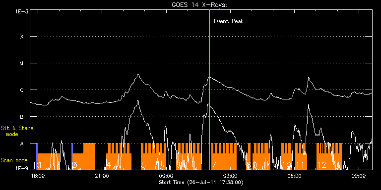 EIS Observation timeline overlay to GOES-Xray curve Code 1" 2" 40" 266" EIS Observations list for this event: STUDY ACRONYM ID DATE OBSERVED DESCRIPTION NOAA# TARGET 0 PRY_slot_context_v3 | 23478 | 2011/07/26 17:56:13 | EIS Spectral Atlas Synoptic programme | | Active Region TIMELINE ID DATE OBSERVED FITS FILE XCEN (+W/-E) YCEN (+N/-S) DUR ----------------------------------------------------------------------------------------------------------------- 23478 | 2011/07/26 17:56:13.000 | eis_l0_20110726_175613.fits.gz | -1.57 | -30.94 | 2m56s 1 Atlas_60 | 23479 | 2011/07/26 17:59:35 | EIS Spectral Atlas Synoptic programme | | Quiet Sun TIMELINE ID DATE OBSERVED FITS FILE XCEN (+W/-E) YCEN (+N/-S) DUR ----------------------------------------------------------------------------------------------------------------- 23479 | 2011/07/26 17:59:35.000 | eis_l0_20110726_175935.fits.gz | 13.71 | -31.01 | 1h1m39s 2 PRY_slot_context_v3 | 23493 | 2011/07/26 19:34:20 | EIS Spectral Atlas Synoptic programme | | Active Region TIMELINE ID DATE OBSERVED FITS FILE XCEN (+W/-E) YCEN (+N/-S) DUR ----------------------------------------------------------------------------------------------------------------- 23493 | 2011/07/26 19:34:20.000 | eis_l0_20110726_193420.fits.gz | 13.49 | -31.01 | 2m57s 3 Atlas_60 | 23494 | 2011/07/26 19:37:42 | | | Quiet Sun TIMELINE ID DATE OBSERVED FITS FILE XCEN (+W/-E) YCEN (+N/-S) DUR ----------------------------------------------------------------------------------------------------------------- 23494 | 2011/07/26 19:37:42.000 | eis_l0_20110726_193742.fits.gz | 28.77 | -31.09 | 30m49s 23494 | 2011/07/26 20:08:32.000 | eis_l0_20110726_200832.fits.gz | 33.48 | -31.24 | 30m49s 4 HH_Flare+AR_180x152 | 23467 | 2011/07/26 21:12:10 | AR observation | | Flare TIMELINE ID DATE OBSERVED FITS FILE XCEN (+W/-E) YCEN (+N/-S) DUR ----------------------------------------------------------------------------------------------------------------- 23467 | 2011/07/26 21:12:10.000 | eis_l0_20110726_211210.fits.gz | 477.07 | 285.62 | 5m19s 23467 | 2011/07/26 21:17:31.000 | eis_l0_20110726_211731.fits.gz | 477.84 | 285.62 | 5m18s 23467 | 2011/07/26 21:22:52.000 | eis_l0_20110726_212252.fits.gz | 478.54 | 285.62 | 5m18s 23467 | 2011/07/26 21:28:13.000 | eis_l0_20110726_212813.fits.gz | 479.08 | 285.62 | 5m17s 23467 | 2011/07/26 21:33:33.000 | eis_l0_20110726_213333.fits.gz | 479.77 | 285.62 | 5m18s 23467 | 2011/07/26 21:38:54.000 | eis_l0_20110726_213854.fits.gz | 480.31 | 285.78 | 5m18s 23467 | 2011/07/26 21:44:15.000 | eis_l0_20110726_214415.fits.gz | 480.85 | 285.62 | 5m18s 23467 | 2011/07/26 21:49:36.000 | eis_l0_20110726_214936.fits.gz | 481.55 | 285.62 | 5m18s 23467 | 2011/07/26 21:54:57.000 | eis_l0_20110726_215457.fits.gz | 482.17 | 285.70 | 5m17s 23467 | 2011/07/26 22:00:17.000 | eis_l0_20110726_220017.fits.gz | 482.86 | 285.70 | 5m17s 23467 | 2011/07/26 22:05:37.000 | eis_l0_20110726_220537.fits.gz | 483.48 | 285.78 | 5m17s 23467 | 2011/07/26 22:10:57.000 | eis_l0_20110726_221057.fits.gz | 484.02 | 285.78 | 5m18s 23467 | 2011/07/26 22:16:18.000 | eis_l0_20110726_221618.fits.gz | 484.64 | 285.86 | 5m19s 5 HH_Flare+AR_180x152 | 23468 | 2011/07/26 22:49:44 | AR observation | | Flare TIMELINE ID DATE OBSERVED FITS FILE XCEN (+W/-E) YCEN (+N/-S) DUR ----------------------------------------------------------------------------------------------------------------- 23468 | 2011/07/26 22:49:44.000 | eis_l0_20110726_224944.fits.gz | 488.42 | 286.32 | 5m17s 23468 | 2011/07/26 22:55:04.000 | eis_l0_20110726_225504.fits.gz | 489.04 | 286.24 | 5m17s 23468 | 2011/07/26 23:00:24.000 | eis_l0_20110726_230024.fits.gz | 489.74 | 286.24 | 5m18s 23468 | 2011/07/26 23:05:45.000 | eis_l0_20110726_230545.fits.gz | 490.36 | 286.17 | 5m17s 23468 | 2011/07/26 23:11:05.000 | eis_l0_20110726_231105.fits.gz | 490.89 | 286.24 | 5m18s 23468 | 2011/07/26 23:16:26.000 | eis_l0_20110726_231626.fits.gz | 491.51 | 286.32 | 5m18s 23468 | 2011/07/26 23:21:47.000 | eis_l0_20110726_232147.fits.gz | 492.13 | 286.32 | 5m18s 23468 | 2011/07/26 23:27:07.000 | eis_l0_20110726_232707.fits.gz | 492.75 | 286.32 | 5m18s 23468 | 2011/07/26 23:32:27.000 | eis_l0_20110726_233227.fits.gz | 493.37 | 286.32 | 5m18s 23468 | 2011/07/26 23:37:48.000 | eis_l0_20110726_233748.fits.gz | 493.98 | 286.40 | 5m17s 23468 | 2011/07/26 23:43:08.000 | eis_l0_20110726_234308.fits.gz | 494.53 | 286.48 | 5m18s 23468 | 2011/07/26 23:48:29.000 | eis_l0_20110726_234829.fits.gz | 495.14 | 286.55 | 5m18s 23468 | 2011/07/26 23:53:50.000 | eis_l0_20110726_235350.fits.gz | 495.76 | 286.48 | 5m18s 6 HH_Flare+AR_180x152 | 23469 | 2011/07/27 00:28:14 | AR observation | | Flare TIMELINE ID DATE OBSERVED FITS FILE XCEN (+W/-E) YCEN (+N/-S) DUR ----------------------------------------------------------------------------------------------------------------- 23469 | 2011/07/27 00:28:14.000 | eis_l0_20110727_002814.fits.gz | 499.70 | 286.86 | 5m17s 23469 | 2011/07/27 00:33:34.000 | eis_l0_20110727_003334.fits.gz | 500.24 | 286.86 | 5m18s 23469 | 2011/07/27 00:38:55.000 | eis_l0_20110727_003855.fits.gz | 500.94 | 286.78 | 5m18s 23469 | 2011/07/27 00:44:16.000 | eis_l0_20110727_004416.fits.gz | 501.56 | 286.86 | 5m18s 23469 | 2011/07/27 00:49:36.000 | eis_l0_20110727_004936.fits.gz | 502.10 | 286.94 | 5m18s 23469 | 2011/07/27 00:54:57.000 | eis_l0_20110727_005457.fits.gz | 502.79 | 286.86 | 5m18s 23469 | 2011/07/27 01:00:18.000 | eis_l0_20110727_010018.fits.gz | 503.33 | 286.94 | 5m18s 23469 | 2011/07/27 01:05:38.000 | eis_l0_20110727_010538.fits.gz | 503.87 | 286.94 | 5m19s 23469 | 2011/07/27 01:11:00.000 | eis_l0_20110727_011100.fits.gz | 504.49 | 287.02 | 5m17s 23469 | 2011/07/27 01:16:20.000 | eis_l0_20110727_011620.fits.gz | 505.11 | 287.02 | 5m18s 23469 | 2011/07/27 01:21:40.000 | eis_l0_20110727_012140.fits.gz | 505.73 | 287.17 | 5m18s 23469 | 2011/07/27 01:27:00.000 | eis_l0_20110727_012700.fits.gz | 506.42 | 287.09 | 5m18s 23469 | 2011/07/27 01:32:21.000 | eis_l0_20110727_013