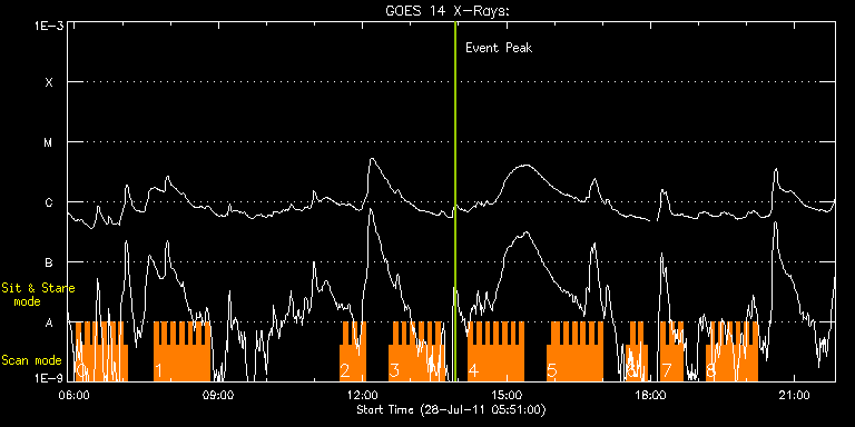 EIS Observation timeline overlay to GOES-Xray curve Code 1" 2" 40" 266" EIS Observations list for this event: STUDY ACRONYM ID DATE OBSERVED DESCRIPTION NOAA# TARGET 0 HH_Flare+AR_180x152 | 23487 | 2011/07/28 06:02:12 | AR observation | | Flare TIMELINE ID DATE OBSERVED FITS FILE XCEN (+W/-E) YCEN (+N/-S) DUR ----------------------------------------------------------------------------------------------------------------- 23487 | 2011/07/28 06:02:12.000 | eis_l0_20110728_060212.fits.gz | 678.99 | 301.08 | 5m19s 23487 | 2011/07/28 06:07:34.000 | eis_l0_20110728_060734.fits.gz | 679.38 | 301.15 | 5m17s 23487 | 2011/07/28 06:12:54.000 | eis_l0_20110728_061254.fits.gz | 679.84 | 301.15 | 5m17s 23487 | 2011/07/28 06:18:14.000 | eis_l0_20110728_061814.fits.gz | 680.31 | 301.23 | 5m17s 23487 | 2011/07/28 06:23:34.000 | eis_l0_20110728_062334.fits.gz | 680.77 | 301.31 | 5m18s 23487 | 2011/07/28 06:28:55.000 | eis_l0_20110728_062855.fits.gz | 681.23 | 301.38 | 5m18s 23487 | 2011/07/28 06:34:16.000 | eis_l0_20110728_063416.fits.gz | 681.62 | 301.31 | 5m18s 23487 | 2011/07/28 06:39:37.000 | eis_l0_20110728_063937.fits.gz | 682.08 | 301.54 | 5m18s 23487 | 2011/07/28 06:44:58.000 | eis_l0_20110728_064458.fits.gz | 682.55 | 301.46 | 5m18s 23487 | 2011/07/28 06:50:19.000 | eis_l0_20110728_065019.fits.gz | 683.16 | 301.38 | 5m18s 23487 | 2011/07/28 06:55:40.000 | eis_l0_20110728_065540.fits.gz | 683.47 | 301.54 | 5m18s 23487 | 2011/07/28 07:01:00.000 | eis_l0_20110728_070100.fits.gz | 683.94 | 301.46 | 5m19s 1 HH_Flare+AR_180x152 | 23488 | 2011/07/28 07:39:13 | AR observation | | Flare TIMELINE ID DATE OBSERVED FITS FILE XCEN (+W/-E) YCEN (+N/-S) DUR ----------------------------------------------------------------------------------------------------------------- 23488 | 2011/07/28 07:39:13.000 | eis_l0_20110728_073913.fits.gz | 687.18 | 302.16 | 5m18s 23488 | 2011/07/28 07:44:34.000 | eis_l0_20110728_074434.fits.gz | 687.72 | 302.16 | 5m19s 23488 | 2011/07/28 07:49:56.000 | eis_l0_20110728_074956.fits.gz | 688.26 | 302.08 | 5m17s 23488 | 2011/07/28 07:55:16.000 | eis_l0_20110728_075516.fits.gz | 688.65 | 302.08 | 5m18s 23488 | 2011/07/28 08:00:37.000 | eis_l0_20110728_080037.fits.gz | 689.11 | 302.31 | 5m18s 23488 | 2011/07/28 08:05:58.000 | eis_l0_20110728_080558.fits.gz | 689.50 | 302.23 | 5m19s 23488 | 2011/07/28 08:11:19.000 | eis_l0_20110728_081119.fits.gz | 689.89 | 302.31 | 5m18s 23488 | 2011/07/28 08:16:40.000 | eis_l0_20110728_081640.fits.gz | 690.35 | 302.39 | 5m18s 23488 | 2011/07/28 08:22:01.000 | eis_l0_20110728_082201.fits.gz | 690.97 | 302.39 | 5m19s 23488 | 2011/07/28 08:27:23.000 | eis_l0_20110728_082723.fits.gz | 691.35 | 302.54 | 5m18s 23488 | 2011/07/28 08:32:43.000 | eis_l0_20110728_083243.fits.gz | 691.82 | 302.46 | 5m18s 23488 | 2011/07/28 08:38:04.000 | eis_l0_20110728_083804.fits.gz | 692.28 | 302.54 | 5m18s 23488 | 2011/07/28 08:43:24.000 | eis_l0_20110728_084324.fits.gz | 692.74 | 302.46 | 5m19s 2 HH_Flare+AR_180x152 | 23515 | 2011/07/28 11:31:15 | AR observation | 1260 | Flare TIMELINE ID DATE OBSERVED FITS FILE XCEN (+W/-E) YCEN (+N/-S) DUR ----------------------------------------------------------------------------------------------------------------- 23515 | 2011/07/28 11:31:15.000 | eis_l0_20110728_113115.fits.gz | -397.07 | 197.87 | 5m18s 23515 | 2011/07/28 11:36:36.000 | eis_l0_20110728_113636.fits.gz | -396.37 | 197.95 | 5m19s 23515 | 2011/07/28 11:41:57.000 | eis_l0_20110728_114157.fits.gz | -395.68 | 197.95 | 5m18s 23515 | 2011/07/28 11:47:18.000 | eis_l0_20110728_114718.fits.gz | -394.98 | 197.95 | 5m19s 23515 | 2011/07/28 11:52:40.000 | eis_l0_20110728_115240.fits.gz | -394.21 | 197.79 | 5m18s 23515 | 2011/07/28 11:58:01.000 | eis_l0_20110728_115801.fits.gz | -393.51 | 197.87 | 5m18s 3 HH_Flare+AR_180x152 | 23516 | 2011/07/28 12:33:14 | AR observation | 1260 | Flare TIMELINE ID DATE OBSERVED FITS FILE XCEN (+W/-E) YCEN (+N/-S) DUR ----------------------------------------------------------------------------------------------------------------- 23516 | 2011/07/28 12:33:14.000 | eis_l0_20110728_123314.fits.gz | -388.95 | 197.79 | 5m18s 23516 | 2011/07/28 12:38:35.000 | eis_l0_20110728_123835.fits.gz | -388.26 | 197.64 | 5m18s 23516 | 2011/07/28 12:43:55.000 | eis_l0_20110728_124355.fits.gz | -387.49 | 197.49 | 5m18s 23516 | 2011/07/28 12:49:16.000 | eis_l0_20110728_124916.fits.gz | -386.87 | 197.72 | 5m18s 23516 | 2011/07/28 12:54:37.000 | eis_l0_20110728_125437.fits.gz | -386.17 | 197.49 | 5m17s 23516 | 2011/07/28 12:59:57.000 | eis_l0_20110728_125957.fits.gz | -385.40 | 197.49 | 5m17s 23516 | 2011/07/28 13:05:17.000 | eis_l0_20110728_130517.fits.gz | -384.71 | 197.56 | 5m18s 23516 | 2011/07/28 13:10:38.000 | eis_l0_20110728_131038.fits.gz | -384.01 | 197.33 | 5m18s 23516 | 2011/07/28 13:15:59.000 | eis_l0_20110728_131559.fits.gz | -383.24 | 197.18 | 5m18s 23516 | 2011/07/28 13:21:20.000 | eis_l0_20110728_132120.fits.gz | -382.62 | 197.25 | 5m18s 23516 | 2011/07/28 13:26:40.000 | eis_l0_20110728_132640.fits.gz | -381.93 | 197.25 | 5m18s 23516 | 2011/07/28 13:32:01.000 | eis_l0_20110728_133201.fits.gz | -381.08 | 197.10 | 5m18s 23516 | 2011/07/28 13:37:22.000 | eis_l0_20110728_133722.fits.gz | -380.54 | 197.18 | 5m18s 4 HH_Flare+AR_180x152 | 23517 | 2011/07/28 14:12:14 | AR observation | 1260 | Flare TIMELINE ID DATE OBSERVED FITS FILE XCEN (+W/-E) YCEN (+N/-S) DUR ----------------------------------------------------------------------------------------------------------------- 23517 | 2011/07/28 14:12:14.000 | eis_l0_20110728_141214.fits.gz | -375.98 | 197.10 | 5m18s 23517 | 2011/07/28 14:17:35.000 | eis_l0_20110728_141735.fits.gz | -375.28 | 196.95 | 5m18s 23517 | 2011/07/28 14:22:55.000 | eis_l0_20110728_142255.fits.gz | -374.51 | 196.87 | 5m18s 23517 | 2011/07/28 14:28:15.000 | eis_l0_20110728_142815.fits.gz | -373.74 | 196.71 | 5m18s 23517 | 2011/07/28 14:33:36.000 | eis_l0_20110728_143336.fits.gz | -373.20 | 196.95 | 5m18s 23517 | 2011/07/28 14:38:56.000 | eis_l0_