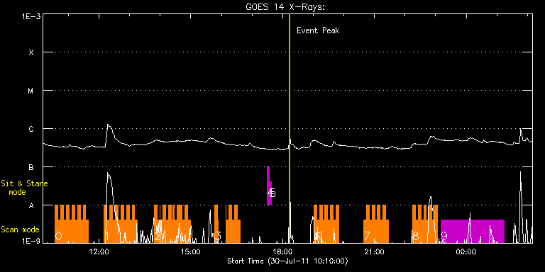 EIS Observation timeline overlay to GOES-Xray curve Code 1" 2" 40" 266" EIS Observations list for this event: STUDY ACRONYM ID DATE OBSERVED DESCRIPTION NOAA# TARGET 0 IUU_SCAN_STEPS_002 | 23545 | 2011/07/30 10:34:14 | Active region studies | | Active Region TIMELINE ID DATE OBSERVED FITS FILE XCEN (+W/-E) YCEN (+N/-S) DUR ----------------------------------------------------------------------------------------------------------------- 23545 | 2011/07/30 10:34:14.000 | eis_l0_20110730_103414.fits.gz | 35.11 | 190.38 | 5m24s 23545 | 2011/07/30 10:39:41.000 | eis_l0_20110730_103941.fits.gz | 35.73 | 190.07 | 5m23s 23545 | 2011/07/30 10:45:08.000 | eis_l0_20110730_104508.fits.gz | 36.58 | 189.99 | 5m23s 23545 | 2011/07/30 10:50:35.000 | eis_l0_20110730_105035.fits.gz | 37.35 | 190.07 | 5m23s 23545 | 2011/07/30 10:56:01.000 | eis_l0_20110730_105601.fits.gz | 38.12 | 189.91 | 5m24s 23545 | 2011/07/30 11:01:28.000 | eis_l0_20110730_110128.fits.gz | 38.90 | 189.99 | 5m24s 23545 | 2011/07/30 11:06:55.000 | eis_l0_20110730_110655.fits.gz | 39.67 | 189.99 | 5m23s 23545 | 2011/07/30 11:12:22.000 | eis_l0_20110730_111222.fits.gz | 40.60 | 189.84 | 5m23s 23545 | 2011/07/30 11:17:48.000 | eis_l0_20110730_111748.fits.gz | 41.21 | 189.99 | 5m24s 23545 | 2011/07/30 11:23:15.000 | eis_l0_20110730_112315.fits.gz | 42.06 | 190.07 | 5m24s 23545 | 2011/07/30 11:28:42.000 | eis_l0_20110730_112842.fits.gz | 42.84 | 190.07 | 5m23s 23545 | 2011/07/30 11:34:09.000 | eis_l0_20110730_113409.fits.gz | 43.61 | 190.07 | 5m23s 1 IUU_SCAN_STEPS_002 | 23546 | 2011/07/30 12:10:14 | Active region studies | | Active Region TIMELINE ID DATE OBSERVED FITS FILE XCEN (+W/-E) YCEN (+N/-S) DUR ----------------------------------------------------------------------------------------------------------------- 23546 | 2011/07/30 12:10:14.000 | eis_l0_20110730_121014.fits.gz | 48.86 | 190.07 | 5m23s 23546 | 2011/07/30 12:15:41.000 | eis_l0_20110730_121541.fits.gz | 49.63 | 190.07 | 5m23s 23546 | 2011/07/30 12:21:07.000 | eis_l0_20110730_122107.fits.gz | 50.48 | 189.99 | 5m24s 23546 | 2011/07/30 12:26:34.000 | eis_l0_20110730_122634.fits.gz | 51.18 | 190.07 | 5m23s 23546 | 2011/07/30 12:32:01.000 | eis_l0_20110730_123201.fits.gz | 51.95 | 189.99 | 5m23s 23546 | 2011/07/30 12:37:27.000 | eis_l0_20110730_123727.fits.gz | 52.72 | 189.91 | 5m24s 23546 | 2011/07/30 12:42:54.000 | eis_l0_20110730_124254.fits.gz | 53.50 | 189.99 | 5m23s 23546 | 2011/07/30 12:48:21.000 | eis_l0_20110730_124821.fits.gz | 54.27 | 190.15 | 5m23s 23546 | 2011/07/30 12:53:48.000 | eis_l0_20110730_125348.fits.gz | 55.12 | 189.99 | 5m23s 23546 | 2011/07/30 12:59:14.000 | eis_l0_20110730_125914.fits.gz | 55.97 | 190.07 | 5m24s 23546 | 2011/07/30 13:04:41.000 | eis_l0_20110730_130441.fits.gz | 56.66 | 189.91 | 5m24s 23546 | 2011/07/30 13:10:08.000 | eis_l0_20110730_131008.fits.gz | 57.51 | 189.99 | 5m23s 2 IUU_SCAN_STEPS_002 | 23547 | 2011/07/30 13:48:44 | Active region studies | | Active Region TIMELINE ID DATE OBSERVED FITS FILE XCEN (+W/-E) YCEN (+N/-S) DUR ----------------------------------------------------------------------------------------------------------------- 23547 | 2011/07/30 13:48:44.000 | eis_l0_20110730_134844.fits.gz | 63.07 | 190.07 | 5m23s 23547 | 2011/07/30 13:54:10.000 | eis_l0_20110730_135410.fits.gz | 63.92 | 189.99 | 4m19s 23547 | 2011/07/30 13:58:52.000 | eis_l0_20110730_135852.fits.gz | 64.46 | 190.07 | 42s 23547 | 2011/07/30 13:59:37.000 | eis_l0_20110730_135937.fits.gz | 64.62 | 189.99 | 5m24s 23547 | 2011/07/30 14:05:04.000 | eis_l0_20110730_140504.fits.gz | 65.31 | 189.91 | 5m23s 23547 | 2011/07/30 14:10:31.000 | eis_l0_20110730_141031.fits.gz | 66.16 | 189.99 | 5m23s 23547 | 2011/07/30 14:15:58.000 | eis_l0_20110730_141558.fits.gz | 66.86 | 189.99 | 5m23s 23547 | 2011/07/30 14:21:24.000 | eis_l0_20110730_142124.fits.gz | 67.79 | 189.99 | 2m52s 23547 | 2011/07/30 14:24:39.000 | eis_l0_20110730_142439.fits.gz | 68.25 | 189.99 | 2m9s 23547 | 2011/07/30 14:26:51.000 | eis_l0_20110730_142651.fits.gz | 68.48 | 189.91 | 5m24s 23547 | 2011/07/30 14:32:18.000 | eis_l0_20110730_143218.fits.gz | 69.33 | 189.99 | 5m23s 23547 | 2011/07/30 14:37:45.000 | eis_l0_20110730_143745.fits.gz | 70.10 | 189.91 | 41s 23547 | 2011/07/30 14:38:49.000 | eis_l0_20110730_143849.fits.gz | 70.18 | 189.91 | 4m19s 23547 | 2011/07/30 14:43:11.000 | eis_l0_20110730_144311.fits.gz | 70.95 | 190.07 | 5m24s 23547 | 2011/07/30 14:48:38.000 | eis_l0_20110730_144838.fits.gz | 71.65 | 189.99 | 5m24s 23547 | 2011/07/30 14:54:05.000 | eis_l0_20110730_145405.fits.gz | 72.42 | 189.99 | 5m23s 3 IUU_SCAN_STEPS_002 | 23548 | 2011/07/30 15:47:14 | Active region studies | | Active Region TIMELINE ID DATE OBSERVED FITS FILE XCEN (+W/-E) YCEN (+N/-S) DUR ----------------------------------------------------------------------------------------------------------------- 23548 | 2011/07/30 15:47:14.000 | eis_l0_20110730_154714.fits.gz | 80.07 | 189.99 | 5m24s 23548 | 2011/07/30 15:52:41.000 | eis_l0_20110730_155241.fits.gz | 80.92 | 189.99 | 1m25s 23548 | 2011/07/30 16:08:16.000 | eis_l0_20110730_160816.fits.gz | 83.08 | 190.07 | 42s 23548 | 2011/07/30 16:09:02.000 | eis_l0_20110730_160902.fits.gz | 83.24 | 190.07 | 5m23s 23548 | 2011/07/30 16:14:28.000 | eis_l0_20110730_161428.fits.gz | 84.01 | 190.07 | 5m24s 23548 | 2011/07/30 16:19:55.000 | eis_l0_20110730_161955.fits.gz | 84.78 | 190.07 | 5m23s 23548 | 2011/07/30 16:25:22.000 | eis_l0_20110730_162522.fits.gz | 85.63 | 190.07 | 5m23s 23548 | 2011/07/30 16:30:49.000 | eis_l0_20110730_163049.fits.gz | 86.40 | 189.99 | 5m23s 4 regcal071 | 23549 | 2011/07/30 17:30:12 | Dark exposures, CCD bottom rows (100s | | Engineering TIMELINE ID DATE OBSERVED FITS FILE XCEN (+W/-E) YCEN (+N/-S) DUR ----------------------------------------------------------------------------------------------------------------- 23549 | 2011/07/30 17:30:12.000 | eis_l0_20110730_173012.fits.gz | 110.99 | -114.85 | 3m22s 5 regcal072 | 23550 | 2011/07/30 17:34:00 | Dark exposures,