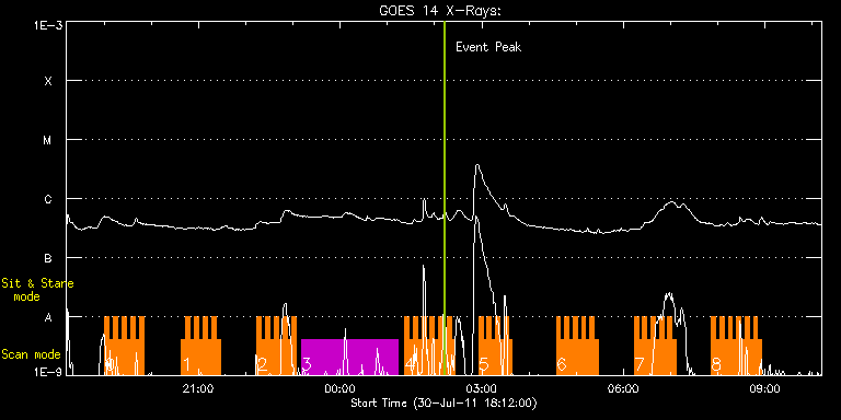 EIS Observation timeline overlay to GOES-Xray curve Code 1" 2" 40" 266" EIS Observations list for this event: STUDY ACRONYM ID DATE OBSERVED DESCRIPTION NOAA# TARGET 0 IUU_SCAN_STEPS_002 | 23584 | 2011/07/30 19:01:13 | Active region studies | 1260 | Active Region TIMELINE ID DATE OBSERVED FITS FILE XCEN (+W/-E) YCEN (+N/-S) DUR ----------------------------------------------------------------------------------------------------------------- 23584 | 2011/07/30 19:01:13.000 | eis_l0_20110730_190113.fits.gz | 107.96 | 190.15 | 5m23s 23584 | 2011/07/30 19:06:40.000 | eis_l0_20110730_190640.fits.gz | 108.81 | 190.15 | 5m23s 23584 | 2011/07/30 19:12:07.000 | eis_l0_20110730_191207.fits.gz | 109.58 | 190.15 | 5m23s 23584 | 2011/07/30 19:17:34.000 | eis_l0_20110730_191734.fits.gz | 110.35 | 190.15 | 5m23s 23584 | 2011/07/30 19:23:00.000 | eis_l0_20110730_192300.fits.gz | 111.12 | 190.15 | 5m24s 23584 | 2011/07/30 19:28:27.000 | eis_l0_20110730_192827.fits.gz | 111.82 | 190.15 | 5m24s 23584 | 2011/07/30 19:33:54.000 | eis_l0_20110730_193354.fits.gz | 112.59 | 190.15 | 5m23s 23584 | 2011/07/30 19:39:21.000 | eis_l0_20110730_193921.fits.gz | 113.44 | 190.22 | 5m23s 23584 | 2011/07/30 19:44:47.000 | eis_l0_20110730_194447.fits.gz | 114.21 | 190.07 | 5m24s 1 IUU_SCAN_STEPS_002 | 23585 | 2011/07/30 20:38:43 | Active region studies | 1260 | Active Region TIMELINE ID DATE OBSERVED FITS FILE XCEN (+W/-E) YCEN (+N/-S) DUR ----------------------------------------------------------------------------------------------------------------- 23585 | 2011/07/30 20:38:43.000 | eis_l0_20110730_203843.fits.gz | 121.94 | 190.30 | 5m24s 23585 | 2011/07/30 20:44:10.000 | eis_l0_20110730_204410.fits.gz | 122.71 | 190.30 | 5m24s 23585 | 2011/07/30 20:49:37.000 | eis_l0_20110730_204937.fits.gz | 123.56 | 190.15 | 5m2s 23585 | 2011/07/30 20:55:04.000 | eis_l0_20110730_205504.fits.gz | 124.33 | 190.15 | 5m23s 23585 | 2011/07/30 21:00:30.000 | eis_l0_20110730_210030.fits.gz | 125.03 | 190.30 | 5m24s 23585 | 2011/07/30 21:05:57.000 | eis_l0_20110730_210557.fits.gz | 125.88 | 190.15 | 5m24s 23585 | 2011/07/30 21:11:24.000 | eis_l0_20110730_211124.fits.gz | 126.65 | 190.30 | 5m23s 23585 | 2011/07/30 21:16:51.000 | eis_l0_20110730_211651.fits.gz | 127.42 | 190.30 | 5m23s 23585 | 2011/07/30 21:22:18.000 | eis_l0_20110730_212218.fits.gz | 128.19 | 190.30 | 5m23s 2 IUU_SCAN_STEPS_002 | 23586 | 2011/07/30 22:14:43 | Active region studies | 1260 | Active Region TIMELINE ID DATE OBSERVED FITS FILE XCEN (+W/-E) YCEN (+N/-S) DUR ----------------------------------------------------------------------------------------------------------------- 23586 | 2011/07/30 22:14:43.000 | eis_l0_20110730_221443.fits.gz | 135.61 | 190.38 | 5m24s 23586 | 2011/07/30 22:20:10.000 | eis_l0_20110730_222010.fits.gz | 136.38 | 190.38 | 5m24s 23586 | 2011/07/30 22:25:37.000 | eis_l0_20110730_222537.fits.gz | 137.23 | 190.38 | 5m24s 23586 | 2011/07/30 22:31:04.000 | eis_l0_20110730_223104.fits.gz | 138.01 | 190.30 | 5m23s 23586 | 2011/07/30 22:36:31.000 | eis_l0_20110730_223631.fits.gz | 138.78 | 190.30 | 5m23s 23586 | 2011/07/30 22:41:58.000 | eis_l0_20110730_224158.fits.gz | 139.47 | 190.38 | 5m23s 23586 | 2011/07/30 22:47:24.000 | eis_l0_20110730_224724.fits.gz | 140.32 | 190.38 | 5m24s 23586 | 2011/07/30 22:52:51.000 | eis_l0_20110730_225251.fits.gz | 141.09 | 190.46 | 5m24s 23586 | 2011/07/30 22:58:18.000 | eis_l0_20110730_225818.fits.gz | 141.94 | 190.46 | 5m23s 3 HPW021_VEL_240x512v1 | 23551 | 2011/07/30 23:10:27 | Active region studies | 1260 | Active Region TIMELINE ID DATE OBSERVED FITS FILE XCEN (+W/-E) YCEN (+N/-S) DUR ----------------------------------------------------------------------------------------------------------------- 23551 | 2011/07/30 23:10:27.000 | eis_l0_20110730_231027.fits.gz | 144.88 | 190.46 | 2h3m47s 4 HH_Flare+AR_180x152 | 23559 | 2011/07/31 01:22:27 | Flare monitoring of AR 11260 | 1260 | Flare TIMELINE ID DATE OBSERVED FITS FILE XCEN (+W/-E) YCEN (+N/-S) DUR ----------------------------------------------------------------------------------------------------------------- 23559 | 2011/07/31 01:22:27.000 | eis_l0_20110731_012227.fits.gz | 161.59 | 190.69 | 5m18s 23559 | 2011/07/31 01:27:47.000 | eis_l0_20110731_012747.fits.gz | 162.44 | 190.76 | 5m18s 23559 | 2011/07/31 01:33:08.000 | eis_l0_20110731_013308.fits.gz | 163.13 | 190.69 | 5m18s 23559 | 2011/07/31 01:38:29.000 | eis_l0_20110731_013829.fits.gz | 163.98 | 190.61 | 5m18s 23559 | 2011/07/31 01:43:50.000 | eis_l0_20110731_014350.fits.gz | 164.68 | 190.69 | 5m18s 23559 | 2011/07/31 01:49:10.000 | eis_l0_20110731_014910.fits.gz | 165.45 | 190.76 | 5m18s 23559 | 2011/07/31 01:54:30.000 | eis_l0_20110731_015430.fits.gz | 166.22 | 190.69 | 5m18s 23559 | 2011/07/31 01:59:51.000 | eis_l0_20110731_015951.fits.gz | 166.92 | 190.69 | 5m19s 23559 | 2011/07/31 02:05:12.000 | eis_l0_20110731_020512.fits.gz | 167.77 | 190.76 | 5m18s 23559 | 2011/07/31 02:10:33.000 | eis_l0_20110731_021033.fits.gz | 168.46 | 190.61 | 5m17s 23559 | 2011/07/31 02:15:53.000 | eis_l0_20110731_021553.fits.gz | 169.39 | 190.61 | 5m18s 23559 | 2011/07/31 02:21:14.000 | eis_l0_20110731_022114.fits.gz | 170.09 | 190.61 | 5m17s 5 HH_Flare+AR_180x152 | 23581 | 2011/07/31 02:56:14 | Flare monitoring of AR 11260 | 1260 | Flare TIMELINE ID DATE OBSERVED FITS FILE XCEN (+W/-E) YCEN (+N/-S) DUR ----------------------------------------------------------------------------------------------------------------- 23581 | 2011/07/31 02:56:14.000 | eis_l0_20110731_025614.fits.gz | 174.95 | 191.07 | 5m17s 23581 | 2011/07/31 03:01:34.000 | eis_l0_20110731_030134.fits.gz | 175.73 | 190.92 | 5m17s 23581 | 2011/07/31 03:06:54.000 | eis_l0_20110731_030654.fits.gz | 176.57 | 190.84 | 5m18s 23581 | 2011/07/31 03:12:15.000 | eis_l0_20110731_031215.fits.gz | 177.19 | 190.84 | 5m18s 23581 | 2011/07/31 03:17:36.000 | eis_l0_20110731_031736.fits.gz | 177.96 | 190.84 | 5m17s 23581 | 2011/07/31 03:22:56.000 | eis_l0_20110731_032256.fits.gz | 1