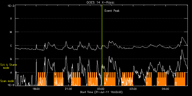 EIS Observation timeline overlay to GOES-Xray curve Code 1" 2" 40" 266" EIS Observations list for this event: STUDY ACRONYM ID DATE OBSERVED DESCRIPTION NOAA# TARGET 0 HH_Flare+AR_180x152 | 23564 | 2011/07/31 18:10:57 | Flare monitoring of AR 11260 | 1260 | Flare TIMELINE ID DATE OBSERVED FITS FILE XCEN (+W/-E) YCEN (+N/-S) DUR ----------------------------------------------------------------------------------------------------------------- 23564 | 2011/07/31 18:10:57.000 | eis_l0_20110731_181057.fits.gz | 293.68 | 191.92 | 5m18s 23564 | 2011/07/31 18:16:17.000 | eis_l0_20110731_181617.fits.gz | 302.95 | 193.55 | 5m18s 23564 | 2011/07/31 18:21:38.000 | eis_l0_20110731_182138.fits.gz | 303.65 | 193.62 | 5m17s 23564 | 2011/07/31 18:26:58.000 | eis_l0_20110731_182658.fits.gz | 304.42 | 193.62 | 5m18s 23564 | 2011/07/31 18:32:19.000 | eis_l0_20110731_183219.fits.gz | 305.19 | 193.47 | 5m18s 23564 | 2011/07/31 18:37:40.000 | eis_l0_20110731_183740.fits.gz | 305.96 | 193.62 | 5m18s 23564 | 2011/07/31 18:43:01.000 | eis_l0_20110731_184301.fits.gz | 306.58 | 193.70 | 5m18s 23564 | 2011/07/31 18:48:22.000 | eis_l0_20110731_184822.fits.gz | 307.28 | 193.70 | 5m18s 1 HH_Flare+AR_180x152 | 23565 | 2011/07/31 19:38:10 | Flare monitoring of AR 11260 | 1260 | Flare TIMELINE ID DATE OBSERVED FITS FILE XCEN (+W/-E) YCEN (+N/-S) DUR ----------------------------------------------------------------------------------------------------------------- 23565 | 2011/07/31 19:38:10.000 | eis_l0_20110731_193810.fits.gz | 314.00 | 193.85 | 5m18s 23565 | 2011/07/31 19:43:30.000 | eis_l0_20110731_194330.fits.gz | 314.69 | 194.01 | 5m18s 23565 | 2011/07/31 19:48:51.000 | eis_l0_20110731_194851.fits.gz | 315.47 | 194.01 | 5m17s 23565 | 2011/07/31 19:54:11.000 | eis_l0_20110731_195411.fits.gz | 316.16 | 194.01 | 5m18s 23565 | 2011/07/31 19:59:32.000 | eis_l0_20110731_195932.fits.gz | 316.86 | 193.93 | 5m18s 23565 | 2011/07/31 20:04:53.000 | eis_l0_20110731_200453.fits.gz | 317.71 | 193.85 | 5m18s 23565 | 2011/07/31 20:10:14.000 | eis_l0_20110731_201014.fits.gz | 318.40 | 193.93 | 5m18s 23565 | 2011/07/31 20:15:35.000 | eis_l0_20110731_201535.fits.gz | 319.17 | 194.09 | 5m17s 23565 | 2011/07/31 20:20:55.000 | eis_l0_20110731_202055.fits.gz | 319.87 | 194.09 | 5m18s 23565 | 2011/07/31 20:26:16.000 | eis_l0_20110731_202616.fits.gz | 320.56 | 194.09 | 5m18s 2 HH_Flare+AR_180x152 | 23566 | 2011/07/31 21:14:43 | Flare monitoring of AR 11260 | 1260 | Flare TIMELINE ID DATE OBSERVED FITS FILE XCEN (+W/-E) YCEN (+N/-S) DUR ----------------------------------------------------------------------------------------------------------------- 23566 | 2011/07/31 21:14:43.000 | eis_l0_20110731_211443.fits.gz | 327.05 | 194.32 | 5m19s 23566 | 2011/07/31 21:20:04.000 | eis_l0_20110731_212004.fits.gz | 327.75 | 194.32 | 5m19s 23566 | 2011/07/31 21:25:25.000 | eis_l0_20110731_212525.fits.gz | 328.52 | 194.24 | 5m18s 23566 | 2011/07/31 21:30:45.000 | eis_l0_20110731_213045.fits.gz | 329.29 | 194.40 | 5m18s 23566 | 2011/07/31 21:36:06.000 | eis_l0_20110731_213606.fits.gz | 329.99 | 194.40 | 5m17s 23566 | 2011/07/31 21:41:26.000 | eis_l0_20110731_214126.fits.gz | 330.68 | 194.40 | 5m18s 23566 | 2011/07/31 21:46:47.000 | eis_l0_20110731_214647.fits.gz | 331.38 | 194.40 | 5m18s 23566 | 2011/07/31 21:52:08.000 | eis_l0_20110731_215208.fits.gz | 332.07 | 194.47 | 5m18s 23566 | 2011/07/31 21:57:28.000 | eis_l0_20110731_215728.fits.gz | 332.85 | 194.55 | 5m18s 23566 | 2011/07/31 22:02:49.000 | eis_l0_20110731_220249.fits.gz | 333.46 | 194.55 | 5m18s 3 HH_Flare+AR_180x152 | 23567 | 2011/07/31 22:49:43 | Flare monitoring of AR 11260 | 1260 | Flare TIMELINE ID DATE OBSERVED FITS FILE XCEN (+W/-E) YCEN (+N/-S) DUR ----------------------------------------------------------------------------------------------------------------- 23567 | 2011/07/31 22:49:43.000 | eis_l0_20110731_224943.fits.gz | 339.88 | 194.71 | 5m18s 23567 | 2011/07/31 22:55:04.000 | eis_l0_20110731_225504.fits.gz | 340.57 | 194.78 | 5m17s 23567 | 2011/07/31 23:00:24.000 | eis_l0_20110731_230024.fits.gz | 341.27 | 194.86 | 5m18s 23567 | 2011/07/31 23:05:44.000 | eis_l0_20110731_230544.fits.gz | 341.89 | 194.86 | 5m18s 23567 | 2011/07/31 23:11:05.000 | eis_l0_20110731_231105.fits.gz | 342.66 | 194.86 | 5m18s 23567 | 2011/07/31 23:16:26.000 | eis_l0_20110731_231626.fits.gz | 343.35 | 194.86 | 5m18s 23567 | 2011/07/31 23:21:47.000 | eis_l0_20110731_232147.fits.gz | 344.20 | 194.94 | 5m17s 23567 | 2011/07/31 23:27:07.000 | eis_l0_20110731_232707.fits.gz | 344.82 | 194.94 | 5m17s 23567 | 2011/07/31 23:32:27.000 | eis_l0_20110731_233227.fits.gz | 345.67 | 194.86 | 5m17s 23567 | 2011/07/31 23:37:47.000 | eis_l0_20110731_233747.fits.gz | 346.21 | 195.01 | 5m18s 4 HH_Flare+AR_180x152 | 23568 | 2011/08/01 00:16:13 | Flare monitoring of AR 11260 | 1260 | Flare TIMELINE ID DATE OBSERVED FITS FILE XCEN (+W/-E) YCEN (+N/-S) DUR ----------------------------------------------------------------------------------------------------------------- 23568 | 2011/08/01 00:16:13.000 | eis_l0_20110801_001613.fits.gz | 351.31 | 195.32 | 5m17s 23568 | 2011/08/01 00:21:33.000 | eis_l0_20110801_002133.fits.gz | 352.08 | 195.24 | 5m18s 23568 | 2011/08/01 00:26:53.000 | eis_l0_20110801_002653.fits.gz | 352.78 | 195.24 | 2m49s 23568 | 2011/08/01 00:30:05.000 | eis_l0_20110801_003005.fits.gz | 353.24 | 195.17 | 2m6s 23568 | 2011/08/01 00:32:14.000 | eis_l0_20110801_003214.fits.gz | 353.55 | 195.24 | 5m17s 23568 | 2011/08/01 00:37:33.000 | eis_l0_20110801_003733.fits.gz | 354.17 | 195.40 | 5m19s 23568 | 2011/08/01 00:42:54.000 | eis_l0_20110801_004254.fits.gz | 354.94 | 195.24 | 5m18s 23568 | 2011/08/01 00:48:15.000 | eis_l0_20110801_004815.fits.gz | 355.56 | 195.24 | 5m18s 23568 | 2011/08/01 00:53:35.000 | eis_l0_20110801_005335.fits.gz | 356.33 | 195.32 | 5m19s 23568 | 2011/08/01 00:58:57.000 | eis_l0_20110801_005857.fits.gz | 357.10 | 195.32 | 5m18s 23568 | 2011/08/01 01:04:18.000 | eis_l0_20110801_010418.fits.gz | 357.72 | 1