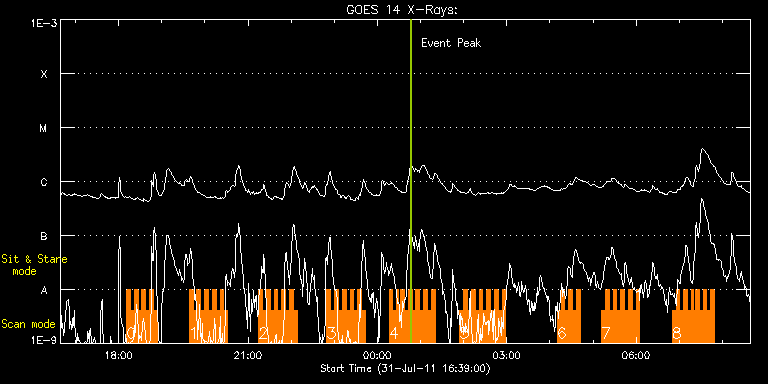 EIS Observation timeline overlay to GOES-Xray curve Code 1" 2" 40" 266" EIS Observations list for this event: STUDY ACRONYM ID DATE OBSERVED DESCRIPTION NOAA# TARGET 0 HH_Flare+AR_180x152 | 23564 | 2011/07/31 18:10:57 | Flare monitoring of AR 11260 | 1260 | Flare TIMELINE ID DATE OBSERVED FITS FILE XCEN (+W/-E) YCEN (+N/-S) DUR ----------------------------------------------------------------------------------------------------------------- 23564 | 2011/07/31 18:10:57.000 | eis_l0_20110731_181057.fits.gz | 293.68 | 191.92 | 5m18s 23564 | 2011/07/31 18:16:17.000 | eis_l0_20110731_181617.fits.gz | 302.95 | 193.55 | 5m18s 23564 | 2011/07/31 18:21:38.000 | eis_l0_20110731_182138.fits.gz | 303.65 | 193.62 | 5m17s 23564 | 2011/07/31 18:26:58.000 | eis_l0_20110731_182658.fits.gz | 304.42 | 193.62 | 5m18s 23564 | 2011/07/31 18:32:19.000 | eis_l0_20110731_183219.fits.gz | 305.19 | 193.47 | 5m18s 23564 | 2011/07/31 18:37:40.000 | eis_l0_20110731_183740.fits.gz | 305.96 | 193.62 | 5m18s 23564 | 2011/07/31 18:43:01.000 | eis_l0_20110731_184301.fits.gz | 306.58 | 193.70 | 5m18s 23564 | 2011/07/31 18:48:22.000 | eis_l0_20110731_184822.fits.gz | 307.28 | 193.70 | 5m18s 1 HH_Flare+AR_180x152 | 23565 | 2011/07/31 19:38:10 | Flare monitoring of AR 11260 | 1260 | Flare TIMELINE ID DATE OBSERVED FITS FILE XCEN (+W/-E) YCEN (+N/-S) DUR ----------------------------------------------------------------------------------------------------------------- 23565 | 2011/07/31 19:38:10.000 | eis_l0_20110731_193810.fits.gz | 314.00 | 193.85 | 5m18s 23565 | 2011/07/31 19:43:30.000 | eis_l0_20110731_194330.fits.gz | 314.69 | 194.01 | 5m18s 23565 | 2011/07/31 19:48:51.000 | eis_l0_20110731_194851.fits.gz | 315.47 | 194.01 | 5m17s 23565 | 2011/07/31 19:54:11.000 | eis_l0_20110731_195411.fits.gz | 316.16 | 194.01 | 5m18s 23565 | 2011/07/31 19:59:32.000 | eis_l0_20110731_195932.fits.gz | 316.86 | 193.93 | 5m18s 23565 | 2011/07/31 20:04:53.000 | eis_l0_20110731_200453.fits.gz | 317.71 | 193.85 | 5m18s 23565 | 2011/07/31 20:10:14.000 | eis_l0_20110731_201014.fits.gz | 318.40 | 193.93 | 5m18s 23565 | 2011/07/31 20:15:35.000 | eis_l0_20110731_201535.fits.gz | 319.17 | 194.09 | 5m17s 23565 | 2011/07/31 20:20:55.000 | eis_l0_20110731_202055.fits.gz | 319.87 | 194.09 | 5m18s 23565 | 2011/07/31 20:26:16.000 | eis_l0_20110731_202616.fits.gz | 320.56 | 194.09 | 5m18s 2 HH_Flare+AR_180x152 | 23566 | 2011/07/31 21:14:43 | Flare monitoring of AR 11260 | 1260 | Flare TIMELINE ID DATE OBSERVED FITS FILE XCEN (+W/-E) YCEN (+N/-S) DUR ----------------------------------------------------------------------------------------------------------------- 23566 | 2011/07/31 21:14:43.000 | eis_l0_20110731_211443.fits.gz | 327.05 | 194.32 | 5m19s 23566 | 2011/07/31 21:20:04.000 | eis_l0_20110731_212004.fits.gz | 327.75 | 194.32 | 5m19s 23566 | 2011/07/31 21:25:25.000 | eis_l0_20110731_212525.fits.gz | 328.52 | 194.24 | 5m18s 23566 | 2011/07/31 21:30:45.000 | eis_l0_20110731_213045.fits.gz | 329.29 | 194.40 | 5m18s 23566 | 2011/07/31 21:36:06.000 | eis_l0_20110731_213606.fits.gz | 329.99 | 194.40 | 5m17s 23566 | 2011/07/31 21:41:26.000 | eis_l0_20110731_214126.fits.gz | 330.68 | 194.40 | 5m18s 23566 | 2011/07/31 21:46:47.000 | eis_l0_20110731_214647.fits.gz | 331.38 | 194.40 | 5m18s 23566 | 2011/07/31 21:52:08.000 | eis_l0_20110731_215208.fits.gz | 332.07 | 194.47 | 5m18s 23566 | 2011/07/31 21:57:28.000 | eis_l0_20110731_215728.fits.gz | 332.85 | 194.55 | 5m18s 23566 | 2011/07/31 22:02:49.000 | eis_l0_20110731_220249.fits.gz | 333.46 | 194.55 | 5m18s 3 HH_Flare+AR_180x152 | 23567 | 2011/07/31 22:49:43 | Flare monitoring of AR 11260 | 1260 | Flare TIMELINE ID DATE OBSERVED FITS FILE XCEN (+W/-E) YCEN (+N/-S) DUR ----------------------------------------------------------------------------------------------------------------- 23567 | 2011/07/31 22:49:43.000 | eis_l0_20110731_224943.fits.gz | 339.88 | 194.71 | 5m18s 23567 | 2011/07/31 22:55:04.000 | eis_l0_20110731_225504.fits.gz | 340.57 | 194.78 | 5m17s 23567 | 2011/07/31 23:00:24.000 | eis_l0_20110731_230024.fits.gz | 341.27 | 194.86 | 5m18s 23567 | 2011/07/31 23:05:44.000 | eis_l0_20110731_230544.fits.gz | 341.89 | 194.86 | 5m18s 23567 | 2011/07/31 23:11:05.000 | eis_l0_20110731_231105.fits.gz | 342.66 | 194.86 | 5m18s 23567 | 2011/07/31 23:16:26.000 | eis_l0_20110731_231626.fits.gz | 343.35 | 194.86 | 5m18s 23567 | 2011/07/31 23:21:47.000 | eis_l0_20110731_232147.fits.gz | 344.20 | 194.94 | 5m17s 23567 | 2011/07/31 23:27:07.000 | eis_l0_20110731_232707.fits.gz | 344.82 | 194.94 | 5m17s 23567 | 2011/07/31 23:32:27.000 | eis_l0_20110731_233227.fits.gz | 345.67 | 194.86 | 5m17s 23567 | 2011/07/31 23:37:47.000 | eis_l0_20110731_233747.fits.gz | 346.21 | 195.01 | 5m18s 4 HH_Flare+AR_180x152 | 23568 | 2011/08/01 00:16:13 | Flare monitoring of AR 11260 | 1260 | Flare TIMELINE ID DATE OBSERVED FITS FILE XCEN (+W/-E) YCEN (+N/-S) DUR ----------------------------------------------------------------------------------------------------------------- 23568 | 2011/08/01 00:16:13.000 | eis_l0_20110801_001613.fits.gz | 351.31 | 195.32 | 5m17s 23568 | 2011/08/01 00:21:33.000 | eis_l0_20110801_002133.fits.gz | 352.08 | 195.24 | 5m18s 23568 | 2011/08/01 00:26:53.000 | eis_l0_20110801_002653.fits.gz | 352.78 | 195.24 | 2m49s 23568 | 2011/08/01 00:30:05.000 | eis_l0_20110801_003005.fits.gz | 353.24 | 195.17 | 2m6s 23568 | 2011/08/01 00:32:14.000 | eis_l0_20110801_003214.fits.gz | 353.55 | 195.24 | 5m17s 23568 | 2011/08/01 00:37:33.000 | eis_l0_20110801_003733.fits.gz | 354.17 | 195.40 | 5m19s 23568 | 2011/08/01 00:42:54.000 | eis_l0_20110801_004254.fits.gz | 354.94 | 195.24 | 5m18s 23568 | 2011/08/01 00:48:15.000 | eis_l0_20110801_004815.fits.gz | 355.56 | 195.24 | 5m18s 23568 | 2011/08/01 00:53:35.000 | eis_l0_20110801_005335.fits.gz | 356.33 | 195.32 | 5m19s 23568 | 2011/08/01 00:58:57.000 | eis_l0_20110801_005857.fits.gz | 357.10 | 195.32 | 5m18s 23568 | 2011/08/01 01:04:18.000 | eis_l0_20110801_010418.fits.gz | 357.72 | 1