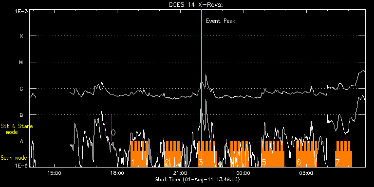 EIS Observation timeline overlay to GOES-Xray curve Code 1" 2" 40" 266" EIS Observations list for this event: STUDY ACRONYM ID DATE OBSERVED DESCRIPTION NOAA# TARGET 0 regcal077 | 23553 | 2011/08/01 17:42:11 | Flatfield, 2 exposures, led 80ms, full | | Engineering TIMELINE ID DATE OBSERVED FITS FILE XCEN (+W/-E) YCEN (+N/-S) DUR ----------------------------------------------------------------------------------------------------------------- 23553 | 2011/08/01 17:42:11.000 | eis_l0_20110801_174211.fits.gz | 14.43 | -50.58 | 4s 1 HH_Flare+AR_180x152 | 23573 | 2011/08/01 18:38:25 | Flare monitoring of AR 11260 | 1260 | Flare TIMELINE ID DATE OBSERVED FITS FILE XCEN (+W/-E) YCEN (+N/-S) DUR ----------------------------------------------------------------------------------------------------------------- 23573 | 2011/08/01 18:38:25.000 | eis_l0_20110801_183825.fits.gz | 491.67 | 201.66 | 5m18s 23573 | 2011/08/01 18:43:46.000 | eis_l0_20110801_184346.fits.gz | 492.29 | 201.81 | 5m18s 23573 | 2011/08/01 18:49:07.000 | eis_l0_20110801_184907.fits.gz | 492.98 | 201.81 | 5m18s 23573 | 2011/08/01 18:54:28.000 | eis_l0_20110801_185428.fits.gz | 493.60 | 201.89 | 5m17s 23573 | 2011/08/01 18:59:48.000 | eis_l0_20110801_185948.fits.gz | 494.22 | 201.89 | 5m18s 23573 | 2011/08/01 19:05:09.000 | eis_l0_20110801_190509.fits.gz | 494.99 | 201.97 | 5m17s 23573 | 2011/08/01 19:10:29.000 | eis_l0_20110801_191029.fits.gz | 495.45 | 201.97 | 5m17s 23573 | 2011/08/01 19:15:49.000 | eis_l0_20110801_191549.fits.gz | 496.15 | 202.12 | 5m17s 23573 | 2011/08/01 19:21:09.000 | eis_l0_20110801_192109.fits.gz | 496.84 | 202.12 | 5m17s 2 HH_Flare+AR_180x152 | 23574 | 2011/08/01 20:14:42 | Flare monitoring of AR 11260 | 1260 | Flare TIMELINE ID DATE OBSERVED FITS FILE XCEN (+W/-E) YCEN (+N/-S) DUR ----------------------------------------------------------------------------------------------------------------- 23574 | 2011/08/01 20:14:42.000 | eis_l0_20110801_201442.fits.gz | 503.26 | 202.51 | 5m18s 23574 | 2011/08/01 20:20:03.000 | eis_l0_20110801_202003.fits.gz | 503.87 | 202.58 | 5m18s 23574 | 2011/08/01 20:25:24.000 | eis_l0_20110801_202524.fits.gz | 504.57 | 202.51 | 5m17s 23574 | 2011/08/01 20:30:44.000 | eis_l0_20110801_203044.fits.gz | 505.19 | 202.58 | 5m18s 23574 | 2011/08/01 20:36:04.000 | eis_l0_20110801_203604.fits.gz | 505.73 | 202.58 | 5m18s 23574 | 2011/08/01 20:41:25.000 | eis_l0_20110801_204125.fits.gz | 506.42 | 202.74 | 5m18s 23574 | 2011/08/01 20:46:46.000 | eis_l0_20110801_204646.fits.gz | 507.04 | 202.82 | 5m18s 23574 | 2011/08/01 20:52:07.000 | eis_l0_20110801_205207.fits.gz | 507.73 | 202.74 | 5m19s 23574 | 2011/08/01 20:57:29.000 | eis_l0_20110801_205729.fits.gz | 508.43 | 202.89 | 5m18s 3 HH_Flare+AR_180x152 | 23575 | 2011/08/01 21:51:10 | Flare monitoring of AR 11260 | 1260 | Flare TIMELINE ID DATE OBSERVED FITS FILE XCEN (+W/-E) YCEN (+N/-S) DUR ----------------------------------------------------------------------------------------------------------------- 23575 | 2011/08/01 21:51:10.000 | eis_l0_20110801_215110.fits.gz | 514.84 | 203.20 | 5m18s 23575 | 2011/08/01 21:56:31.000 | eis_l0_20110801_215631.fits.gz | 515.31 | 203.20 | 5m18s 23575 | 2011/08/01 22:01:52.000 | eis_l0_20110801_220152.fits.gz | 515.92 | 203.28 | 5m17s 23575 | 2011/08/01 22:07:12.000 | eis_l0_20110801_220712.fits.gz | 516.62 | 203.28 | 5m17s 23575 | 2011/08/01 22:12:32.000 | eis_l0_20110801_221232.fits.gz | 517.24 | 203.51 | 5m18s 23575 | 2011/08/01 22:17:52.000 | eis_l0_20110801_221752.fits.gz | 517.85 | 203.43 | 5m19s 23575 | 2011/08/01 22:23:14.000 | eis_l0_20110801_222314.fits.gz | 518.40 | 203.43 | 5m18s 23575 | 2011/08/01 22:28:35.000 | eis_l0_20110801_222835.fits.gz | 519.24 | 203.43 | 5m18s 23575 | 2011/08/01 22:33:56.000 | eis_l0_20110801_223356.fits.gz | 519.86 | 203.59 | 5m17s 23575 | 2011/08/01 22:39:16.000 | eis_l0_20110801_223916.fits.gz | 520.40 | 203.59 | 5m18s 4 HH_Flare+AR_180x152 | 23576 | 2011/08/01 23:23:42 | Flare monitoring of AR 11260 | 1260 | Flare TIMELINE ID DATE OBSERVED FITS FILE XCEN (+W/-E) YCEN (+N/-S) DUR ----------------------------------------------------------------------------------------------------------------- 23576 | 2011/08/01 23:23:42.000 | eis_l0_20110801_232342.fits.gz | 525.66 | 203.97 | 2m38s 23576 | 2011/08/01 23:26:33.000 | eis_l0_20110801_232633.fits.gz | 525.97 | 203.97 | 30s 23576 | 2011/08/01 23:27:15.000 | eis_l0_20110801_232715.fits.gz | 526.12 | 203.97 | 1m45s 23576 | 2011/08/01 23:29:03.000 | eis_l0_20110801_232903.fits.gz | 526.20 | 203.90 | 5m18s 23576 | 2011/08/01 23:34:23.000 | eis_l0_20110801_233423.fits.gz | 526.82 | 203.97 | 5m18s 23576 | 2011/08/01 23:39:44.000 | eis_l0_20110801_233944.fits.gz | 527.51 | 204.05 | 5m18s 23576 | 2011/08/01 23:45:05.000 | eis_l0_20110801_234505.fits.gz | 528.28 | 203.97 | 5m18s 23576 | 2011/08/01 23:50:26.000 | eis_l0_20110801_235026.fits.gz | 528.75 | 204.13 | 5m17s 23576 | 2011/08/01 23:55:46.000 | eis_l0_20110801_235546.fits.gz | 529.36 | 204.13 | 5m18s 23576 | 2011/08/02 00:01:06.000 | eis_l0_20110802_000106.fits.gz | 530.06 | 204.13 | 5m18s 23576 | 2011/08/02 00:06:26.000 | eis_l0_20110802_000626.fits.gz | 530.68 | 204.36 | 5m18s 23576 | 2011/08/02 00:11:47.000 | eis_l0_20110802_001147.fits.gz | 531.30 | 204.36 | 5m18s 5 HH_Flare+AR_180x152 | 23577 | 2011/08/02 00:53:12 | Flare monitoring of AR 11260 | 1260 | Flare TIMELINE ID DATE OBSERVED FITS FILE XCEN (+W/-E) YCEN (+N/-S) DUR ----------------------------------------------------------------------------------------------------------------- 23577 | 2011/08/02 00:53:12.000 | eis_l0_20110802_005312.fits.gz | 536.01 | 204.75 | 5m19s 23577 | 2011/08/02 00:58:34.000 | eis_l0_20110802_005834.fits.gz | 536.63 | 204.75 | 5m18s 23577 | 2011/08/02 01:03:55.000 | eis_l0_20110802_010355.fits.gz | 537.24 | 204.75 | 5m17s 23577 | 2011/08/02 01:09:15.000 | eis_l0_20110802_010915.fits.gz | 537.94 | 204.82 | 5m18s 23577 | 2011/08/02 01:14:35.000 | eis_l0_20110802_011435.fits.gz | 538.48 | 