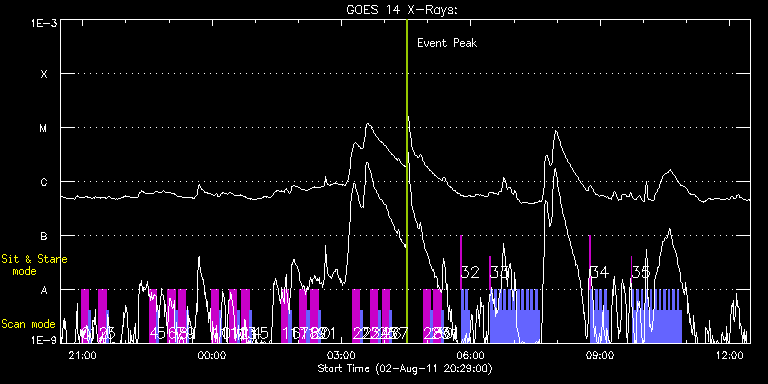 EIS Observation timeline overlay to GOES-Xray curve Code 1" 2" 40" 266" EIS Observations list for this event: STUDY ACRONYM ID DATE OBSERVED DESCRIPTION NOAA# TARGET 0 SK_DEEP_5x512_SLIT1 | 23605 | 2011/08/02 20:57:41 | Synoptic SOT Irradiance Scans | | Quiet Sun TIMELINE ID DATE OBSERVED FITS FILE XCEN (+W/-E) YCEN (+N/-S) DUR ----------------------------------------------------------------------------------------------------------------- 23605 | 2011/08/02 20:57:41.000 | eis_l0_20110802_205741.fits.gz | -6.89 | -73.50 | 10m7s 1 PRY_slot_contextLITE | 23606 | 2011/08/02 21:08:14 | Synoptic SOT Irradiance Scans | 1261 | Active Region TIMELINE ID DATE OBSERVED FITS FILE XCEN (+W/-E) YCEN (+N/-S) DUR ----------------------------------------------------------------------------------------------------------------- 23606 | 2011/08/02 21:08:14.000 | eis_l0_20110802_210814.fits.gz | -22.20 | -73.50 | 2m56s 2 SK_DEEP_5x512_SLIT1 | 23607 | 2011/08/02 21:22:20 | Synoptic SOT Irradiance Scans | | Quiet Sun TIMELINE ID DATE OBSERVED FITS FILE XCEN (+W/-E) YCEN (+N/-S) DUR ----------------------------------------------------------------------------------------------------------------- 23607 | 2011/08/02 21:22:20.000 | eis_l0_20110802_212220.fits.gz | -6.82 | 16.49 | 10m8s 3 PRY_slot_contextLITE | 23608 | 2011/08/02 21:32:53 | Synoptic SOT Irradiance Scans | 1261 | Active Region TIMELINE ID DATE OBSERVED FITS FILE XCEN (+W/-E) YCEN (+N/-S) DUR ----------------------------------------------------------------------------------------------------------------- 23608 | 2011/08/02 21:32:53.000 | eis_l0_20110802_213253.fits.gz | -22.12 | 16.49 | 2m56s 4 SK_DEEP_5x512_SLIT1 | 23609 | 2011/08/02 22:32:20 | Synoptic SOT Irradiance Scans | | Quiet Sun TIMELINE ID DATE OBSERVED FITS FILE XCEN (+W/-E) YCEN (+N/-S) DUR ----------------------------------------------------------------------------------------------------------------- 23609 | 2011/08/02 22:32:20.000 | eis_l0_20110802_223220.fits.gz | -6.82 | 116.38 | 10m8s 5 PRY_slot_contextLITE | 23610 | 2011/08/02 22:42:54 | Synoptic SOT Irradiance Scans | 1261 | Active Region TIMELINE ID DATE OBSERVED FITS FILE XCEN (+W/-E) YCEN (+N/-S) DUR ----------------------------------------------------------------------------------------------------------------- 23610 | 2011/08/02 22:42:54.000 | eis_l0_20110802_224254.fits.gz | -22.12 | 116.38 | 2m56s 6 SK_DEEP_5x512_SLIT1 | 23611 | 2011/08/02 22:58:20 | Synoptic SOT Irradiance Scans | | Quiet Sun TIMELINE ID DATE OBSERVED FITS FILE XCEN (+W/-E) YCEN (+N/-S) DUR ----------------------------------------------------------------------------------------------------------------- 23611 | 2011/08/02 22:58:20.000 | eis_l0_20110802_225820.fits.gz | -6.89 | 216.57 | 10m8s 7 PRY_slot_contextLITE | 23612 | 2011/08/02 23:08:53 | Synoptic SOT Irradiance Scans | 1261 | Active Region TIMELINE ID DATE OBSERVED FITS FILE XCEN (+W/-E) YCEN (+N/-S) DUR ----------------------------------------------------------------------------------------------------------------- 23612 | 2011/08/02 23:08:53.000 | eis_l0_20110802_230853.fits.gz | -22.04 | 216.57 | 2m57s 8 SK_DEEP_5x512_SLIT1 | 23651 | 2011/08/02 23:13:20 | Synoptic SOT Irradiance Scans | | Quiet Sun TIMELINE ID DATE OBSERVED FITS FILE XCEN (+W/-E) YCEN (+N/-S) DUR ----------------------------------------------------------------------------------------------------------------- 23651 | 2011/08/02 23:13:20.000 | eis_l0_20110802_231320.fits.gz | -6.82 | 216.57 | 10m8s 9 PRY_slot_contextLITE | 23652 | 2011/08/02 23:23:53 | Synoptic SOT Irradiance Scans | 1261 | Active Region TIMELINE ID DATE OBSERVED FITS FILE XCEN (+W/-E) YCEN (+N/-S) DUR ----------------------------------------------------------------------------------------------------------------- 23652 | 2011/08/02 23:23:53.000 | eis_l0_20110802_232353.fits.gz | -21.97 | 216.49 | 2m56s 10 SK_DEEP_5x512_SLIT1 | 23613 | 2011/08/02 23:59:20 | Synoptic SOT Irradiance Scans | | Quiet Sun TIMELINE ID DATE OBSERVED FITS FILE XCEN (+W/-E) YCEN (+N/-S) DUR ----------------------------------------------------------------------------------------------------------------- 23613 | 2011/08/02 23:59:20.000 | eis_l0_20110802_235920.fits.gz | -6.89 | 316.76 | 10m7s 11 PRY_slot_contextLITE | 23614 | 2011/08/03 00:09:53 | Synoptic SOT Irradiance Scans | 1263 | Active Region TIMELINE ID DATE OBSERVED FITS FILE XCEN (+W/-E) YCEN (+N/-S) DUR ----------------------------------------------------------------------------------------------------------------- 23614 | 2011/08/03 00:09:53.000 | eis_l0_20110803_000953.fits.gz | -22.04 | 316.60 | 2m57s 12 SK_DEEP_5x512_SLIT1 | 23615 | 2011/08/03 00:24:21 | Synoptic SOT Irradiance Scans | | Quiet Sun TIMELINE ID DATE OBSERVED FITS FILE XCEN (+W/-E) YCEN (+N/-S) DUR ----------------------------------------------------------------------------------------------------------------- 23615 | 2011/08/03 00:24:21.000 | eis_l0_20110803_002421.fits.gz | -6.89 | 416.33 | 10m8s 13 PRY_slot_contextLITE | 23616 | 2011/08/03 00:34:54 | Synoptic SOT Irradiance Scans | 1263 | Active Region TIMELINE ID DATE OBSERVED FITS FILE XCEN (+W/-E) YCEN (+N/-S) DUR ----------------------------------------------------------------------------------------------------------------- 23616 | 2011/08/03 00:34:54.000 | eis_l0_20110803_003454.fits.gz | -22.04 | 416.40 | 2m56s 14 SK_DEEP_5x512_SLIT1 | 23653 | 2011/08/03 00:41:20 | Synoptic SOT Irradiance Scans | | Quiet Sun TIMELINE ID DATE OBSERVED FITS FILE XCEN (+W/-E) YCEN (+N/-S) DUR ----------------------------------------------------------------------------------------------------------------- 23653 | 2011/08/03 00:41:20.000 | eis_l0_20110803_004120.fits.gz | -6.97 | 416.56 | 10m8s 15 PRY_slot_contextLITE | 23654 | 2011/08/03 00:51:53 | Synoptic SOT Irradiance Scans | 1263 | Active Region TIMELINE ID DATE OBSERVED FITS FILE XCEN (+W/-E) YCEN (+N/-S) DUR -----------------------------------------------------------