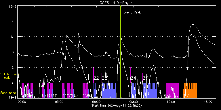 EIS Observation timeline overlay to GOES-Xray curve Code 1" 2" 40" 266" EIS Observations list for this event: STUDY ACRONYM ID DATE OBSERVED DESCRIPTION NOAA# TARGET 0 SK_DEEP_5x512_SLIT1 | 23613 | 2011/08/02 23:59:20 | Synoptic SOT Irradiance Scans | | Quiet Sun TIMELINE ID DATE OBSERVED FITS FILE XCEN (+W/-E) YCEN (+N/-S) DUR ----------------------------------------------------------------------------------------------------------------- 23613 | 2011/08/02 23:59:20.000 | eis_l0_20110802_235920.fits.gz | -6.89 | 316.76 | 10m7s 1 PRY_slot_contextLITE | 23614 | 2011/08/03 00:09:53 | Synoptic SOT Irradiance Scans | 1263 | Active Region TIMELINE ID DATE OBSERVED FITS FILE XCEN (+W/-E) YCEN (+N/-S) DUR ----------------------------------------------------------------------------------------------------------------- 23614 | 2011/08/03 00:09:53.000 | eis_l0_20110803_000953.fits.gz | -22.04 | 316.60 | 2m57s 2 SK_DEEP_5x512_SLIT1 | 23615 | 2011/08/03 00:24:21 | Synoptic SOT Irradiance Scans | | Quiet Sun TIMELINE ID DATE OBSERVED FITS FILE XCEN (+W/-E) YCEN (+N/-S) DUR ----------------------------------------------------------------------------------------------------------------- 23615 | 2011/08/03 00:24:21.000 | eis_l0_20110803_002421.fits.gz | -6.89 | 416.33 | 10m8s 3 PRY_slot_contextLITE | 23616 | 2011/08/03 00:34:54 | Synoptic SOT Irradiance Scans | 1263 | Active Region TIMELINE ID DATE OBSERVED FITS FILE XCEN (+W/-E) YCEN (+N/-S) DUR ----------------------------------------------------------------------------------------------------------------- 23616 | 2011/08/03 00:34:54.000 | eis_l0_20110803_003454.fits.gz | -22.04 | 416.40 | 2m56s 4 SK_DEEP_5x512_SLIT1 | 23653 | 2011/08/03 00:41:20 | Synoptic SOT Irradiance Scans | | Quiet Sun TIMELINE ID DATE OBSERVED FITS FILE XCEN (+W/-E) YCEN (+N/-S) DUR ----------------------------------------------------------------------------------------------------------------- 23653 | 2011/08/03 00:41:20.000 | eis_l0_20110803_004120.fits.gz | -6.97 | 416.56 | 10m8s 5 PRY_slot_contextLITE | 23654 | 2011/08/03 00:51:53 | Synoptic SOT Irradiance Scans | 1263 | Active Region TIMELINE ID DATE OBSERVED FITS FILE XCEN (+W/-E) YCEN (+N/-S) DUR ----------------------------------------------------------------------------------------------------------------- 23654 | 2011/08/03 00:51:53.000 | eis_l0_20110803_005153.fits.gz | -22.04 | 416.40 | 2m57s 6 SK_DEEP_5x512_SLIT1 | 23617 | 2011/08/03 01:36:21 | Synoptic SOT Irradiance Scans | | Quiet Sun TIMELINE ID DATE OBSERVED FITS FILE XCEN (+W/-E) YCEN (+N/-S) DUR ----------------------------------------------------------------------------------------------------------------- 23617 | 2011/08/03 01:36:21.000 | eis_l0_20110803_013621.fits.gz | -6.89 | 516.60 | 10m8s 7 PRY_slot_contextLITE | 23618 | 2011/08/03 01:46:54 | Synoptic SOT Irradiance Scans | | Active Region TIMELINE ID DATE OBSERVED FITS FILE XCEN (+W/-E) YCEN (+N/-S) DUR ----------------------------------------------------------------------------------------------------------------- 23618 | 2011/08/03 01:46:54.000 | eis_l0_20110803_014654.fits.gz | -22.12 | 516.44 | 2m56s 8 SK_DEEP_5x512_SLIT1 | 23619 | 2011/08/03 02:01:21 | Synoptic SOT Irradiance Scans | | Quiet Sun TIMELINE ID DATE OBSERVED FITS FILE XCEN (+W/-E) YCEN (+N/-S) DUR ----------------------------------------------------------------------------------------------------------------- 23619 | 2011/08/03 02:01:21.000 | eis_l0_20110803_020121.fits.gz | -6.82 | 616.63 | 10m8s 9 PRY_slot_contextLITE | 23620 | 2011/08/03 02:11:54 | Synoptic SOT Irradiance Scans | | Active Region TIMELINE ID DATE OBSERVED FITS FILE XCEN (+W/-E) YCEN (+N/-S) DUR ----------------------------------------------------------------------------------------------------------------- 23620 | 2011/08/03 02:11:54.000 | eis_l0_20110803_021154.fits.gz | -22.12 | 616.48 | 2m56s 10 SK_DEEP_5x512_SLIT1 | 23655 | 2011/08/03 02:17:20 | Synoptic SOT Irradiance Scans | | Quiet Sun TIMELINE ID DATE OBSERVED FITS FILE XCEN (+W/-E) YCEN (+N/-S) DUR ----------------------------------------------------------------------------------------------------------------- 23655 | 2011/08/03 02:17:20.000 | eis_l0_20110803_021720.fits.gz | -6.89 | 616.55 | 10m8s 11 PRY_slot_contextLITE | 23656 | 2011/08/03 02:27:53 | Synoptic SOT Irradiance Scans | | Active Region TIMELINE ID DATE OBSERVED FITS FILE XCEN (+W/-E) YCEN (+N/-S) DUR ----------------------------------------------------------------------------------------------------------------- 23656 | 2011/08/03 02:27:53.000 | eis_l0_20110803_022753.fits.gz | -22.04 | 616.63 | 2m56s 12 SK_DEEP_5x512_SLIT1 | 23621 | 2011/08/03 03:15:20 | Synoptic SOT Irradiance Scans | | Quiet Sun TIMELINE ID DATE OBSERVED FITS FILE XCEN (+W/-E) YCEN (+N/-S) DUR ----------------------------------------------------------------------------------------------------------------- 23621 | 2011/08/03 03:15:20.000 | eis_l0_20110803_031520.fits.gz | -6.89 | 716.74 | 10m8s 13 PRY_slot_contextLITE | 23622 | 2011/08/03 03:25:53 | Synoptic SOT Irradiance Scans | | Active Region TIMELINE ID DATE OBSERVED FITS FILE XCEN (+W/-E) YCEN (+N/-S) DUR ----------------------------------------------------------------------------------------------------------------- 23622 | 2011/08/03 03:25:53.000 | eis_l0_20110803_032553.fits.gz | -22.04 | 716.59 | 2m56s 14 SK_DEEP_5x512_SLIT1 | 23623 | 2011/08/03 03:40:20 | Synoptic SOT Irradiance Scans | | Quiet Sun TIMELINE ID DATE OBSERVED FITS FILE XCEN (+W/-E) YCEN (+N/-S) DUR ----------------------------------------------------------------------------------------------------------------- 23623 | 2011/08/03 03:40:20.000 | eis_l0_20110803_034020.fits.gz | -6.89 | 816.32 | 10m8s 15 PRY_slot_contextLITE | 23624 | 2011/08/03 03:50:53 | Synoptic SOT Irradiance Scans | | Active Region TIMELINE ID DATE OBSERVED FITS FILE XCEN (+W/-E) YCEN (+N/-S) DUR ----------------------------------------------------------------------------------