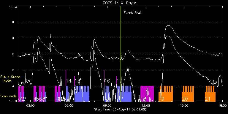 EIS Observation timeline overlay to GOES-Xray curve Code 1" 2" 40" 266" EIS Observations list for this event: STUDY ACRONYM ID DATE OBSERVED DESCRIPTION NOAA# TARGET 0 SK_DEEP_5x512_SLIT1 | 23619 | 2011/08/03 02:01:21 | Synoptic SOT Irradiance Scans | | Quiet Sun TIMELINE ID DATE OBSERVED FITS FILE XCEN (+W/-E) YCEN (+N/-S) DUR ----------------------------------------------------------------------------------------------------------------- 23619 | 2011/08/03 02:01:21.000 | eis_l0_20110803_020121.fits.gz | -6.82 | 616.63 | 10m8s 1 PRY_slot_contextLITE | 23620 | 2011/08/03 02:11:54 | Synoptic SOT Irradiance Scans | | Active Region TIMELINE ID DATE OBSERVED FITS FILE XCEN (+W/-E) YCEN (+N/-S) DUR ----------------------------------------------------------------------------------------------------------------- 23620 | 2011/08/03 02:11:54.000 | eis_l0_20110803_021154.fits.gz | -22.12 | 616.48 | 2m56s 2 SK_DEEP_5x512_SLIT1 | 23655 | 2011/08/03 02:17:20 | Synoptic SOT Irradiance Scans | | Quiet Sun TIMELINE ID DATE OBSERVED FITS FILE XCEN (+W/-E) YCEN (+N/-S) DUR ----------------------------------------------------------------------------------------------------------------- 23655 | 2011/08/03 02:17:20.000 | eis_l0_20110803_021720.fits.gz | -6.89 | 616.55 | 10m8s 3 PRY_slot_contextLITE | 23656 | 2011/08/03 02:27:53 | Synoptic SOT Irradiance Scans | | Active Region TIMELINE ID DATE OBSERVED FITS FILE XCEN (+W/-E) YCEN (+N/-S) DUR ----------------------------------------------------------------------------------------------------------------- 23656 | 2011/08/03 02:27:53.000 | eis_l0_20110803_022753.fits.gz | -22.04 | 616.63 | 2m56s 4 SK_DEEP_5x512_SLIT1 | 23621 | 2011/08/03 03:15:20 | Synoptic SOT Irradiance Scans | | Quiet Sun TIMELINE ID DATE OBSERVED FITS FILE XCEN (+W/-E) YCEN (+N/-S) DUR ----------------------------------------------------------------------------------------------------------------- 23621 | 2011/08/03 03:15:20.000 | eis_l0_20110803_031520.fits.gz | -6.89 | 716.74 | 10m8s 5 PRY_slot_contextLITE | 23622 | 2011/08/03 03:25:53 | Synoptic SOT Irradiance Scans | | Active Region TIMELINE ID DATE OBSERVED FITS FILE XCEN (+W/-E) YCEN (+N/-S) DUR ----------------------------------------------------------------------------------------------------------------- 23622 | 2011/08/03 03:25:53.000 | eis_l0_20110803_032553.fits.gz | -22.04 | 716.59 | 2m56s 6 SK_DEEP_5x512_SLIT1 | 23623 | 2011/08/03 03:40:20 | Synoptic SOT Irradiance Scans | | Quiet Sun TIMELINE ID DATE OBSERVED FITS FILE XCEN (+W/-E) YCEN (+N/-S) DUR ----------------------------------------------------------------------------------------------------------------- 23623 | 2011/08/03 03:40:20.000 | eis_l0_20110803_034020.fits.gz | -6.89 | 816.32 | 10m8s 7 PRY_slot_contextLITE | 23624 | 2011/08/03 03:50:53 | Synoptic SOT Irradiance Scans | | Active Region TIMELINE ID DATE OBSERVED FITS FILE XCEN (+W/-E) YCEN (+N/-S) DUR ----------------------------------------------------------------------------------------------------------------- 23624 | 2011/08/03 03:50:53.000 | eis_l0_20110803_035053.fits.gz | -22.12 | 816.24 | 2m56s 8 SK_DEEP_5x512_SLIT1 | 23657 | 2011/08/03 03:56:20 | Synoptic SOT Irradiance Scans | | Quiet Sun TIMELINE ID DATE OBSERVED FITS FILE XCEN (+W/-E) YCEN (+N/-S) DUR ----------------------------------------------------------------------------------------------------------------- 23657 | 2011/08/03 03:56:20.000 | eis_l0_20110803_035620.fits.gz | -6.89 | 816.39 | 10m8s 9 PRY_slot_contextLITE | 23658 | 2011/08/03 04:06:53 | Synoptic SOT Irradiance Scans | | Active Region TIMELINE ID DATE OBSERVED FITS FILE XCEN (+W/-E) YCEN (+N/-S) DUR ----------------------------------------------------------------------------------------------------------------- 23658 | 2011/08/03 04:06:53.000 | eis_l0_20110803_040653.fits.gz | -22.04 | 816.39 | 2m57s 10 SK_DEEP_5x512_SLIT1 | 23625 | 2011/08/03 04:53:21 | Synoptic SOT Irradiance Scans | | Quiet Sun TIMELINE ID DATE OBSERVED FITS FILE XCEN (+W/-E) YCEN (+N/-S) DUR ----------------------------------------------------------------------------------------------------------------- 23625 | 2011/08/03 04:53:21.000 | eis_l0_20110803_045321.fits.gz | -6.89 | 916.58 | 10m7s 11 PRY_slot_contextLITE | 23626 | 2011/08/03 05:03:54 | Synoptic SOT Irradiance Scans | | Active Region TIMELINE ID DATE OBSERVED FITS FILE XCEN (+W/-E) YCEN (+N/-S) DUR ----------------------------------------------------------------------------------------------------------------- 23626 | 2011/08/03 05:03:54.000 | eis_l0_20110803_050354.fits.gz | -22.04 | 916.35 | 2m56s 12 SK_DEEP_5x512_SLIT1 | 23659 | 2011/08/03 05:08:20 | Synoptic SOT Irradiance Scans | | Quiet Sun TIMELINE ID DATE OBSERVED FITS FILE XCEN (+W/-E) YCEN (+N/-S) DUR ----------------------------------------------------------------------------------------------------------------- 23659 | 2011/08/03 05:08:20.000 | eis_l0_20110803_050820.fits.gz | -6.89 | 916.43 | 10m7s 13 PRY_slot_contextLITE | 23660 | 2011/08/03 05:18:53 | Synoptic SOT Irradiance Scans | | Active Region TIMELINE ID DATE OBSERVED FITS FILE XCEN (+W/-E) YCEN (+N/-S) DUR ----------------------------------------------------------------------------------------------------------------- 23660 | 2011/08/03 05:18:53.000 | eis_l0_20110803_051853.fits.gz | -22.20 | 916.43 | 2m56s 14 Alignment_modify_v2 | 23627 | 2011/08/03 05:45:20 | Alignment study | | Quiet Sun TIMELINE ID DATE OBSERVED FITS FILE XCEN (+W/-E) YCEN (+N/-S) DUR ----------------------------------------------------------------------------------------------------------------- 23627 | 2011/08/03 05:45:20.000 | eis_l0_20110803_054520.fits.gz | -0.02 | 944.62 | 1m 23627 | 2011/08/03 05:46:45.000 | eis_l0_20110803_054645.fits.gz | -9.50 | 944.55 | 2m34s 23627 | 2011/08/03 05:49:52.000 | eis_l0_20110803_054952.fits.gz | -9.58 | 944.55 | 2m34s 23627 | 2011/08/03 05:53:00.000 | eis_l0_20110803_055300.fits.gz | -9.58 | 944.55 | 2m34s 23627 | 2011/0