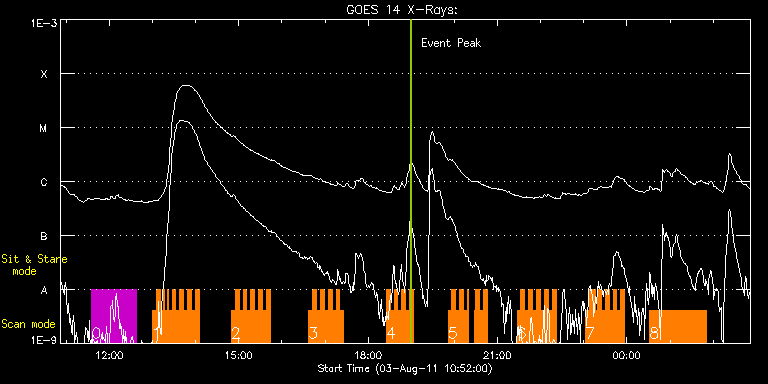 EIS Observation timeline overlay to GOES-Xray curve Code 1" 2" 40" 266" EIS Observations list for this event: STUDY ACRONYM ID DATE OBSERVED DESCRIPTION NOAA# TARGET 0 HPW021_VEL_120x512v1 | 23631 | 2011/08/03 11:35:20 | Active region studies | | Active Region TIMELINE ID DATE OBSERVED FITS FILE XCEN (+W/-E) YCEN (+N/-S) DUR ----------------------------------------------------------------------------------------------------------------- 23631 | 2011/08/03 11:35:20.000 | eis_l0_20110803_113520.fits.gz | -45.79 | 209.63 | 1h1m54s 1 IUU_SCAN_STEPS_002 | 23632 | 2011/08/03 12:59:57 | Active region studies | | Active Region TIMELINE ID DATE OBSERVED FITS FILE XCEN (+W/-E) YCEN (+N/-S) DUR ----------------------------------------------------------------------------------------------------------------- 23632 | 2011/08/03 12:59:57.000 | eis_l0_20110803_125957.fits.gz | -34.41 | 158.63 | 5m23s 23632 | 2011/08/03 13:05:23.000 | eis_l0_20110803_130523.fits.gz | -33.64 | 158.55 | 5m24s 23632 | 2011/08/03 13:10:50.000 | eis_l0_20110803_131050.fits.gz | -32.79 | 158.40 | 4m19s 23632 | 2011/08/03 13:15:32.000 | eis_l0_20110803_131532.fits.gz | -32.17 | 158.40 | 42s 23632 | 2011/08/03 13:16:17.000 | eis_l0_20110803_131617.fits.gz | -32.02 | 158.40 | 3m35s 23632 | 2011/08/03 13:20:37.000 | eis_l0_20110803_132037.fits.gz | -31.40 | 158.32 | 1m3s 23632 | 2011/08/03 13:21:44.000 | eis_l0_20110803_132144.fits.gz | -31.17 | 158.32 | 5m23s 23632 | 2011/08/03 13:27:10.000 | eis_l0_20110803_132710.fits.gz | -30.40 | 158.32 | 5m24s 23632 | 2011/08/03 13:32:37.000 | eis_l0_20110803_133237.fits.gz | -29.62 | 158.40 | 5m24s 23632 | 2011/08/03 13:38:04.000 | eis_l0_20110803_133804.fits.gz | -28.93 | 158.40 | 5m24s 23632 | 2011/08/03 13:43:31.000 | eis_l0_20110803_134331.fits.gz | -28.16 | 158.48 | 5m23s 23632 | 2011/08/03 13:48:58.000 | eis_l0_20110803_134858.fits.gz | -27.23 | 158.17 | 5m23s 23632 | 2011/08/03 13:54:24.000 | eis_l0_20110803_135424.fits.gz | -26.46 | 158.40 | 5m24s 23632 | 2011/08/03 13:59:51.000 | eis_l0_20110803_135951.fits.gz | -25.68 | 158.24 | 5m24s 2 IUU_SCAN_STEPS_002 | 23633 | 2011/08/03 14:49:40 | Active region studies | | Active Region TIMELINE ID DATE OBSERVED FITS FILE XCEN (+W/-E) YCEN (+N/-S) DUR ----------------------------------------------------------------------------------------------------------------- 23633 | 2011/08/03 14:49:40.000 | eis_l0_20110803_144940.fits.gz | -18.34 | 158.24 | 5m23s 23633 | 2011/08/03 14:55:07.000 | eis_l0_20110803_145507.fits.gz | -17.65 | 158.40 | 5m23s 23633 | 2011/08/03 15:00:33.000 | eis_l0_20110803_150033.fits.gz | -16.80 | 158.40 | 5m24s 23633 | 2011/08/03 15:06:00.000 | eis_l0_20110803_150600.fits.gz | -16.03 | 158.24 | 5m24s 23633 | 2011/08/03 15:11:27.000 | eis_l0_20110803_151127.fits.gz | -15.18 | 158.24 | 5m23s 23633 | 2011/08/03 15:16:54.000 | eis_l0_20110803_151654.fits.gz | -14.33 | 158.24 | 5m23s 23633 | 2011/08/03 15:22:21.000 | eis_l0_20110803_152221.fits.gz | -13.63 | 158.32 | 5m23s 23633 | 2011/08/03 15:27:47.000 | eis_l0_20110803_152747.fits.gz | -12.78 | 158.24 | 5m24s 23633 | 2011/08/03 15:33:14.000 | eis_l0_20110803_153314.fits.gz | -12.01 | 158.24 | 5m24s 23633 | 2011/08/03 15:38:41.000 | eis_l0_20110803_153841.fits.gz | -11.24 | 158.17 | 5m23s 3 IUU_SCAN_STEPS_002 | 23634 | 2011/08/03 16:37:14 | Active region studies | | Active Region TIMELINE ID DATE OBSERVED FITS FILE XCEN (+W/-E) YCEN (+N/-S) DUR ----------------------------------------------------------------------------------------------------------------- 23634 | 2011/08/03 16:37:14.000 | eis_l0_20110803_163714.fits.gz | -2.66 | 158.17 | 5m23s 23634 | 2011/08/03 16:42:40.000 | eis_l0_20110803_164240.fits.gz | -1.89 | 158.17 | 5m24s 23634 | 2011/08/03 16:48:07.000 | eis_l0_20110803_164807.fits.gz | -1.12 | 158.24 | 5m24s 23634 | 2011/08/03 16:53:34.000 | eis_l0_20110803_165334.fits.gz | -0.35 | 158.09 | 5m23s 23634 | 2011/08/03 16:59:01.000 | eis_l0_20110803_165901.fits.gz | 0.50 | 158.17 | 5m23s 23634 | 2011/08/03 17:04:28.000 | eis_l0_20110803_170428.fits.gz | 1.28 | 158.01 | 5m23s 23634 | 2011/08/03 17:09:54.000 | eis_l0_20110803_170954.fits.gz | 2.13 | 158.17 | 5m24s 23634 | 2011/08/03 17:15:21.000 | eis_l0_20110803_171521.fits.gz | 2.90 | 158.09 | 5m24s 23634 | 2011/08/03 17:20:48.000 | eis_l0_20110803_172048.fits.gz | 3.75 | 158.09 | 5m24s 4 IUU_SCAN_STEPS_002 | 23635 | 2011/08/03 18:25:13 | Active region studies | | Active Region TIMELINE ID DATE OBSERVED FITS FILE XCEN (+W/-E) YCEN (+N/-S) DUR ----------------------------------------------------------------------------------------------------------------- 23635 | 2011/08/03 18:25:13.000 | eis_l0_20110803_182513.fits.gz | 13.25 | 158.24 | 5m23s 23635 | 2011/08/03 18:30:40.000 | eis_l0_20110803_183040.fits.gz | 13.87 | 158.09 | 5m23s 23635 | 2011/08/03 18:36:07.000 | eis_l0_20110803_183607.fits.gz | 14.72 | 158.09 | 5m23s 23635 | 2011/08/03 18:41:33.000 | eis_l0_20110803_184133.fits.gz | 15.49 | 158.09 | 5m24s 23635 | 2011/08/03 18:47:00.000 | eis_l0_20110803_184700.fits.gz | 16.26 | 158.17 | 5m24s 23635 | 2011/08/03 18:52:27.000 | eis_l0_20110803_185227.fits.gz | 17.19 | 157.93 | 5m23s 23635 | 2011/08/03 18:57:54.000 | eis_l0_20110803_185754.fits.gz | 17.88 | 157.93 | 5m23s 5 IUU_SCAN_STEPS_002 | 23636 | 2011/08/03 19:51:13 | Active region studies | | Active Region TIMELINE ID DATE OBSERVED FITS FILE XCEN (+W/-E) YCEN (+N/-S) DUR ----------------------------------------------------------------------------------------------------------------- 23636 | 2011/08/03 19:51:13.000 | eis_l0_20110803_195113.fits.gz | 25.69 | 158.09 | 5m23s 23636 | 2011/08/03 19:56:40.000 | eis_l0_20110803_195640.fits.gz | 26.46 | 158.01 | 5m23s 23636 | 2011/08/03 20:02:07.000 | eis_l0_20110803_200207.fits.gz | 27.39 | 158.01 | 5m23s 23636 | 2011/08/03 20:07:33.000 | eis_l0_20110803_200733.fits.gz | 28.08 | 158.01 | 5m24s 23636 | 2011/08/03 20:13:00.000 | eis_l0_20110803_201300.fits.gz | 28.85 | 158.01 | 5m24s 23636 | 2011/08/03 20:18:27.000 | e