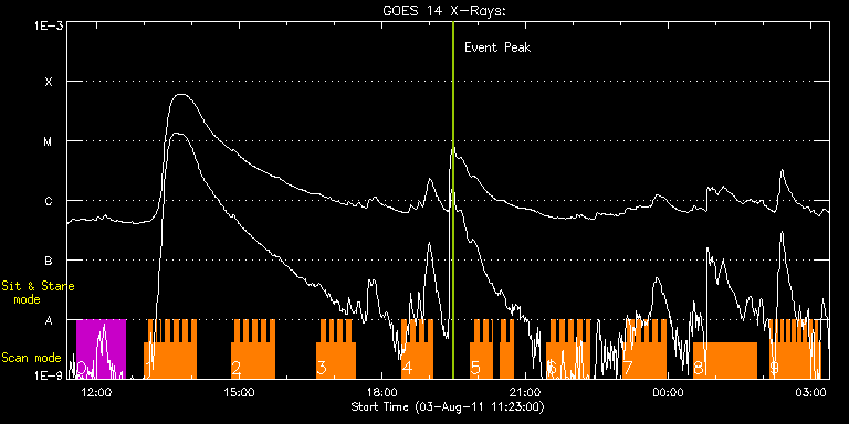 EIS Observation timeline overlay to GOES-Xray curve Code 1" 2" 40" 266" EIS Observations list for this event: STUDY ACRONYM ID DATE OBSERVED DESCRIPTION NOAA# TARGET 0 HPW021_VEL_120x512v1 | 23631 | 2011/08/03 11:35:20 | Active region studies | | Active Region TIMELINE ID DATE OBSERVED FITS FILE XCEN (+W/-E) YCEN (+N/-S) DUR ----------------------------------------------------------------------------------------------------------------- 23631 | 2011/08/03 11:35:20.000 | eis_l0_20110803_113520.fits.gz | -45.79 | 209.63 | 1h1m54s 1 IUU_SCAN_STEPS_002 | 23632 | 2011/08/03 12:59:57 | Active region studies | | Active Region TIMELINE ID DATE OBSERVED FITS FILE XCEN (+W/-E) YCEN (+N/-S) DUR ----------------------------------------------------------------------------------------------------------------- 23632 | 2011/08/03 12:59:57.000 | eis_l0_20110803_125957.fits.gz | -34.41 | 158.63 | 5m23s 23632 | 2011/08/03 13:05:23.000 | eis_l0_20110803_130523.fits.gz | -33.64 | 158.55 | 5m24s 23632 | 2011/08/03 13:10:50.000 | eis_l0_20110803_131050.fits.gz | -32.79 | 158.40 | 4m19s 23632 | 2011/08/03 13:15:32.000 | eis_l0_20110803_131532.fits.gz | -32.17 | 158.40 | 42s 23632 | 2011/08/03 13:16:17.000 | eis_l0_20110803_131617.fits.gz | -32.02 | 158.40 | 3m35s 23632 | 2011/08/03 13:20:37.000 | eis_l0_20110803_132037.fits.gz | -31.40 | 158.32 | 1m3s 23632 | 2011/08/03 13:21:44.000 | eis_l0_20110803_132144.fits.gz | -31.17 | 158.32 | 5m23s 23632 | 2011/08/03 13:27:10.000 | eis_l0_20110803_132710.fits.gz | -30.40 | 158.32 | 5m24s 23632 | 2011/08/03 13:32:37.000 | eis_l0_20110803_133237.fits.gz | -29.62 | 158.40 | 5m24s 23632 | 2011/08/03 13:38:04.000 | eis_l0_20110803_133804.fits.gz | -28.93 | 158.40 | 5m24s 23632 | 2011/08/03 13:43:31.000 | eis_l0_20110803_134331.fits.gz | -28.16 | 158.48 | 5m23s 23632 | 2011/08/03 13:48:58.000 | eis_l0_20110803_134858.fits.gz | -27.23 | 158.17 | 5m23s 23632 | 2011/08/03 13:54:24.000 | eis_l0_20110803_135424.fits.gz | -26.46 | 158.40 | 5m24s 23632 | 2011/08/03 13:59:51.000 | eis_l0_20110803_135951.fits.gz | -25.68 | 158.24 | 5m24s 2 IUU_SCAN_STEPS_002 | 23633 | 2011/08/03 14:49:40 | Active region studies | | Active Region TIMELINE ID DATE OBSERVED FITS FILE XCEN (+W/-E) YCEN (+N/-S) DUR ----------------------------------------------------------------------------------------------------------------- 23633 | 2011/08/03 14:49:40.000 | eis_l0_20110803_144940.fits.gz | -18.34 | 158.24 | 5m23s 23633 | 2011/08/03 14:55:07.000 | eis_l0_20110803_145507.fits.gz | -17.65 | 158.40 | 5m23s 23633 | 2011/08/03 15:00:33.000 | eis_l0_20110803_150033.fits.gz | -16.80 | 158.40 | 5m24s 23633 | 2011/08/03 15:06:00.000 | eis_l0_20110803_150600.fits.gz | -16.03 | 158.24 | 5m24s 23633 | 2011/08/03 15:11:27.000 | eis_l0_20110803_151127.fits.gz | -15.18 | 158.24 | 5m23s 23633 | 2011/08/03 15:16:54.000 | eis_l0_20110803_151654.fits.gz | -14.33 | 158.24 | 5m23s 23633 | 2011/08/03 15:22:21.000 | eis_l0_20110803_152221.fits.gz | -13.63 | 158.32 | 5m23s 23633 | 2011/08/03 15:27:47.000 | eis_l0_20110803_152747.fits.gz | -12.78 | 158.24 | 5m24s 23633 | 2011/08/03 15:33:14.000 | eis_l0_20110803_153314.fits.gz | -12.01 | 158.24 | 5m24s 23633 | 2011/08/03 15:38:41.000 | eis_l0_20110803_153841.fits.gz | -11.24 | 158.17 | 5m23s 3 IUU_SCAN_STEPS_002 | 23634 | 2011/08/03 16:37:14 | Active region studies | | Active Region TIMELINE ID DATE OBSERVED FITS FILE XCEN (+W/-E) YCEN (+N/-S) DUR ----------------------------------------------------------------------------------------------------------------- 23634 | 2011/08/03 16:37:14.000 | eis_l0_20110803_163714.fits.gz | -2.66 | 158.17 | 5m23s 23634 | 2011/08/03 16:42:40.000 | eis_l0_20110803_164240.fits.gz | -1.89 | 158.17 | 5m24s 23634 | 2011/08/03 16:48:07.000 | eis_l0_20110803_164807.fits.gz | -1.12 | 158.24 | 5m24s 23634 | 2011/08/03 16:53:34.000 | eis_l0_20110803_165334.fits.gz | -0.35 | 158.09 | 5m23s 23634 | 2011/08/03 16:59:01.000 | eis_l0_20110803_165901.fits.gz | 0.50 | 158.17 | 5m23s 23634 | 2011/08/03 17:04:28.000 | eis_l0_20110803_170428.fits.gz | 1.28 | 158.01 | 5m23s 23634 | 2011/08/03 17:09:54.000 | eis_l0_20110803_170954.fits.gz | 2.13 | 158.17 | 5m24s 23634 | 2011/08/03 17:15:21.000 | eis_l0_20110803_171521.fits.gz | 2.90 | 158.09 | 5m24s 23634 | 2011/08/03 17:20:48.000 | eis_l0_20110803_172048.fits.gz | 3.75 | 158.09 | 5m24s 4 IUU_SCAN_STEPS_002 | 23635 | 2011/08/03 18:25:13 | Active region studies | | Active Region TIMELINE ID DATE OBSERVED FITS FILE XCEN (+W/-E) YCEN (+N/-S) DUR ----------------------------------------------------------------------------------------------------------------- 23635 | 2011/08/03 18:25:13.000 | eis_l0_20110803_182513.fits.gz | 13.25 | 158.24 | 5m23s 23635 | 2011/08/03 18:30:40.000 | eis_l0_20110803_183040.fits.gz | 13.87 | 158.09 | 5m23s 23635 | 2011/08/03 18:36:07.000 | eis_l0_20110803_183607.fits.gz | 14.72 | 158.09 | 5m23s 23635 | 2011/08/03 18:41:33.000 | eis_l0_20110803_184133.fits.gz | 15.49 | 158.09 | 5m24s 23635 | 2011/08/03 18:47:00.000 | eis_l0_20110803_184700.fits.gz | 16.26 | 158.17 | 5m24s 23635 | 2011/08/03 18:52:27.000 | eis_l0_20110803_185227.fits.gz | 17.19 | 157.93 | 5m23s 23635 | 2011/08/03 18:57:54.000 | eis_l0_20110803_185754.fits.gz | 17.88 | 157.93 | 5m23s 5 IUU_SCAN_STEPS_002 | 23636 | 2011/08/03 19:51:13 | Active region studies | | Active Region TIMELINE ID DATE OBSERVED FITS FILE XCEN (+W/-E) YCEN (+N/-S) DUR ----------------------------------------------------------------------------------------------------------------- 23636 | 2011/08/03 19:51:13.000 | eis_l0_20110803_195113.fits.gz | 25.69 | 158.09 | 5m23s 23636 | 2011/08/03 19:56:40.000 | eis_l0_20110803_195640.fits.gz | 26.46 | 158.01 | 5m23s 23636 | 2011/08/03 20:02:07.000 | eis_l0_20110803_200207.fits.gz | 27.39 | 158.01 | 5m23s 23636 | 2011/08/03 20:07:33.000 | eis_l0_20110803_200733.fits.gz | 28.08 | 158.01 | 5m24s 23636 | 2011/08/03 20:13:00.000 | eis_l0_20110803_201300.fits.gz | 28.85 | 158.01 | 5m24s 23636 | 2011/08/03 20:18:27.000 | e