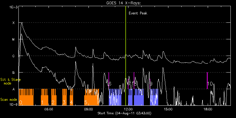EIS Observation timeline overlay to GOES-Xray curve Code 1" 2" 40" 266" EIS Observations list for this event: STUDY ACRONYM ID DATE OBSERVED DESCRIPTION NOAA# TARGET 0 VHH_HI_BRT_SCAN_EXT | 23641 | 2011/08/04 03:45:43 | Active region studies | 1263 | Active Region TIMELINE ID DATE OBSERVED FITS FILE XCEN (+W/-E) YCEN (+N/-S) DUR ----------------------------------------------------------------------------------------------------------------- 23641 | 2011/08/04 03:45:43.000 | eis_l0_20110804_034543.fits.gz | 95.82 | 158.32 | 3m32s 23641 | 2011/08/04 03:49:18.000 | eis_l0_20110804_034918.fits.gz | 96.29 | 158.24 | 3m31s 23641 | 2011/08/04 03:52:52.000 | eis_l0_20110804_035252.fits.gz | 96.90 | 158.24 | 3m32s 23641 | 2011/08/04 03:56:27.000 | eis_l0_20110804_035627.fits.gz | 97.44 | 158.32 | 3m32s 23641 | 2011/08/04 04:00:02.000 | eis_l0_20110804_040002.fits.gz | 97.98 | 158.24 | 3m32s 23641 | 2011/08/04 04:03:37.000 | eis_l0_20110804_040337.fits.gz | 98.45 | 158.24 | 3m32s 23641 | 2011/08/04 04:07:12.000 | eis_l0_20110804_040712.fits.gz | 98.99 | 158.24 | 3m31s 23641 | 2011/08/04 04:10:46.000 | eis_l0_20110804_041046.fits.gz | 99.61 | 158.24 | 3m32s 23641 | 2011/08/04 04:14:21.000 | eis_l0_20110804_041421.fits.gz | 100.07 | 158.24 | 3m32s 23641 | 2011/08/04 04:17:56.000 | eis_l0_20110804_041756.fits.gz | 100.53 | 158.17 | 3m32s 23641 | 2011/08/04 04:21:31.000 | eis_l0_20110804_042131.fits.gz | 101.07 | 158.24 | 3m32s 23641 | 2011/08/04 04:25:06.000 | eis_l0_20110804_042506.fits.gz | 101.61 | 158.24 | 3m32s 23641 | 2011/08/04 04:28:41.000 | eis_l0_20110804_042841.fits.gz | 102.08 | 158.24 | 3m31s 23641 | 2011/08/04 04:32:16.000 | eis_l0_20110804_043216.fits.gz | 102.62 | 158.24 | 3m31s 23641 | 2011/08/04 04:35:50.000 | eis_l0_20110804_043550.fits.gz | 103.16 | 158.24 | 3m32s 23641 | 2011/08/04 04:39:25.000 | eis_l0_20110804_043925.fits.gz | 103.70 | 158.17 | 52s 23641 | 2011/08/04 04:40:45.000 | eis_l0_20110804_044045.fits.gz | 103.86 | 158.24 | 2m12s 23641 | 2011/08/04 04:43:00.000 | eis_l0_20110804_044300.fits.gz | 104.24 | 158.24 | 3m31s 23641 | 2011/08/04 04:46:34.000 | eis_l0_20110804_044634.fits.gz | 104.71 | 158.24 | 3m32s 1 VHH_HI_BRT_SCAN_EXT | 23642 | 2011/08/04 05:24:13 | Active region studies | | Active Region TIMELINE ID DATE OBSERVED FITS FILE XCEN (+W/-E) YCEN (+N/-S) DUR ----------------------------------------------------------------------------------------------------------------- 23642 | 2011/08/04 05:24:13.000 | eis_l0_20110804_052413.fits.gz | 110.11 | 158.40 | 3m32s 23642 | 2011/08/04 05:27:48.000 | eis_l0_20110804_052748.fits.gz | 110.65 | 158.40 | 3m31s 23642 | 2011/08/04 05:31:22.000 | eis_l0_20110804_053122.fits.gz | 111.27 | 158.24 | 3m32s 23642 | 2011/08/04 05:34:57.000 | eis_l0_20110804_053457.fits.gz | 111.74 | 158.40 | 3m32s 23642 | 2011/08/04 05:38:32.000 | eis_l0_20110804_053832.fits.gz | 112.28 | 158.32 | 3m32s 23642 | 2011/08/04 05:42:07.000 | eis_l0_20110804_054207.fits.gz | 112.82 | 158.40 | 3m31s 23642 | 2011/08/04 05:45:41.000 | eis_l0_20110804_054541.fits.gz | 113.28 | 158.32 | 3m32s 23642 | 2011/08/04 05:49:16.000 | eis_l0_20110804_054916.fits.gz | 113.82 | 158.40 | 3m32s 23642 | 2011/08/04 05:52:51.000 | eis_l0_20110804_055251.fits.gz | 114.44 | 158.32 | 3m32s 2 VHH_HI_BRT_SCAN_EXT | 23643 | 2011/08/04 06:12:13 | Active region studies | | Active Region TIMELINE ID DATE OBSERVED FITS FILE XCEN (+W/-E) YCEN (+N/-S) DUR ----------------------------------------------------------------------------------------------------------------- 23643 | 2011/08/04 06:12:13.000 | eis_l0_20110804_061213.fits.gz | 117.22 | 158.32 | 3m31s 23643 | 2011/08/04 06:15:47.000 | eis_l0_20110804_061547.fits.gz | 117.68 | 158.40 | 3m32s 23643 | 2011/08/04 06:19:22.000 | eis_l0_20110804_061922.fits.gz | 118.22 | 158.32 | 3m32s 23643 | 2011/08/04 06:22:57.000 | eis_l0_20110804_062257.fits.gz | 118.84 | 158.32 | 3m32s 23643 | 2011/08/04 06:26:32.000 | eis_l0_20110804_062632.fits.gz | 119.23 | 158.32 | 3m31s 23643 | 2011/08/04 06:30:07.000 | eis_l0_20110804_063007.fits.gz | 119.69 | 158.40 | 3m31s 3 VHH_HI_BRT_SCAN_EXT | 23661 | 2011/08/04 07:02:13 | Active region studies | | Active Region TIMELINE ID DATE OBSERVED FITS FILE XCEN (+W/-E) YCEN (+N/-S) DUR ----------------------------------------------------------------------------------------------------------------- 23661 | 2011/08/04 07:02:13.000 | eis_l0_20110804_070213.fits.gz | 124.40 | 158.48 | 3m32s 23661 | 2011/08/04 07:05:48.000 | eis_l0_20110804_070548.fits.gz | 124.94 | 158.48 | 3m31s 23661 | 2011/08/04 07:09:22.000 | eis_l0_20110804_070922.fits.gz | 125.49 | 158.55 | 3m32s 23661 | 2011/08/04 07:12:57.000 | eis_l0_20110804_071257.fits.gz | 125.95 | 158.40 | 3m32s 23661 | 2011/08/04 07:16:32.000 | eis_l0_20110804_071632.fits.gz | 126.49 | 158.48 | 3m32s 4 VHH_HI_BRT_SCAN_EXT | 23662 | 2011/08/04 07:35:12 | Active region studies | | Active Region TIMELINE ID DATE OBSERVED FITS FILE XCEN (+W/-E) YCEN (+N/-S) DUR ----------------------------------------------------------------------------------------------------------------- 23662 | 2011/08/04 07:35:12.000 | eis_l0_20110804_073512.fits.gz | 129.19 | 158.40 | 3m32s 23662 | 2011/08/04 07:38:47.000 | eis_l0_20110804_073847.fits.gz | 129.66 | 158.40 | 3m32s 23662 | 2011/08/04 07:42:22.000 | eis_l0_20110804_074222.fits.gz | 130.27 | 158.48 | 3m32s 23662 | 2011/08/04 07:45:57.000 | eis_l0_20110804_074557.fits.gz | 130.66 | 158.55 | 3m32s 5 VHH_HI_BRT_SCAN_EXT | 23663 | 2011/08/04 08:41:13 | Active region studies | | Active Region TIMELINE ID DATE OBSERVED FITS FILE XCEN (+W/-E) YCEN (+N/-S) DUR ----------------------------------------------------------------------------------------------------------------- 23663 | 2011/08/04 08:41:13.000 | eis_l0_20110804_084113.fits.gz | 138.69 | 158.79 | 3m32s 23663 | 2011/08/04 08:44:48.000 | eis_l0_20110804_084448.fits.gz | 139.24 | 158.63 | 3m32s 23663 | 2011/08/04 08:48:23.000 | eis_l0_20110804_084823.fits.gz | 139.77 | 158.71 | 3m32s 23663 | 2
