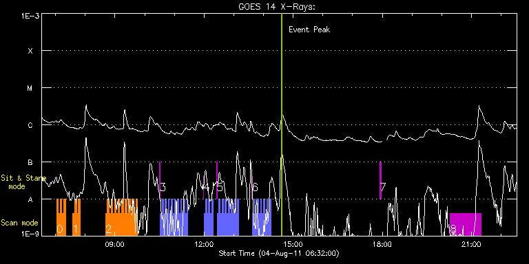 EIS Observation timeline overlay to GOES-Xray curve Code 1" 2" 40" 266" EIS Observations list for this event: STUDY ACRONYM ID DATE OBSERVED DESCRIPTION NOAA# TARGET 0 VHH_HI_BRT_SCAN_EXT | 23661 | 2011/08/04 07:02:13 | Active region studies | | Active Region TIMELINE ID DATE OBSERVED FITS FILE XCEN (+W/-E) YCEN (+N/-S) DUR ----------------------------------------------------------------------------------------------------------------- 23661 | 2011/08/04 07:02:13.000 | eis_l0_20110804_070213.fits.gz | 124.40 | 158.48 | 3m32s 23661 | 2011/08/04 07:05:48.000 | eis_l0_20110804_070548.fits.gz | 124.94 | 158.48 | 3m31s 23661 | 2011/08/04 07:09:22.000 | eis_l0_20110804_070922.fits.gz | 125.49 | 158.55 | 3m32s 23661 | 2011/08/04 07:12:57.000 | eis_l0_20110804_071257.fits.gz | 125.95 | 158.40 | 3m32s 23661 | 2011/08/04 07:16:32.000 | eis_l0_20110804_071632.fits.gz | 126.49 | 158.48 | 3m32s 1 VHH_HI_BRT_SCAN_EXT | 23662 | 2011/08/04 07:35:12 | Active region studies | | Active Region TIMELINE ID DATE OBSERVED FITS FILE XCEN (+W/-E) YCEN (+N/-S) DUR ----------------------------------------------------------------------------------------------------------------- 23662 | 2011/08/04 07:35:12.000 | eis_l0_20110804_073512.fits.gz | 129.19 | 158.40 | 3m32s 23662 | 2011/08/04 07:38:47.000 | eis_l0_20110804_073847.fits.gz | 129.66 | 158.40 | 3m32s 23662 | 2011/08/04 07:42:22.000 | eis_l0_20110804_074222.fits.gz | 130.27 | 158.48 | 3m32s 23662 | 2011/08/04 07:45:57.000 | eis_l0_20110804_074557.fits.gz | 130.66 | 158.55 | 3m32s 2 VHH_HI_BRT_SCAN_EXT | 23663 | 2011/08/04 08:41:13 | Active region studies | | Active Region TIMELINE ID DATE OBSERVED FITS FILE XCEN (+W/-E) YCEN (+N/-S) DUR ----------------------------------------------------------------------------------------------------------------- 23663 | 2011/08/04 08:41:13.000 | eis_l0_20110804_084113.fits.gz | 138.69 | 158.79 | 3m32s 23663 | 2011/08/04 08:44:48.000 | eis_l0_20110804_084448.fits.gz | 139.24 | 158.63 | 3m32s 23663 | 2011/08/04 08:48:23.000 | eis_l0_20110804_084823.fits.gz | 139.77 | 158.71 | 3m32s 23663 | 2011/08/04 08:51:58.000 | eis_l0_20110804_085158.fits.gz | 140.24 | 158.63 | 3m32s 23663 | 2011/08/04 08:55:33.000 | eis_l0_20110804_085533.fits.gz | 140.78 | 158.63 | 3m31s 23663 | 2011/08/04 08:59:08.000 | eis_l0_20110804_085908.fits.gz | 141.32 | 158.55 | 3m31s 23663 | 2011/08/04 09:02:42.000 | eis_l0_20110804_090242.fits.gz | 141.78 | 158.63 | 3m32s 23663 | 2011/08/04 09:06:17.000 | eis_l0_20110804_090617.fits.gz | 142.32 | 158.63 | 3m31s 23663 | 2011/08/04 09:09:51.000 | eis_l0_20110804_090951.fits.gz | 142.94 | 158.55 | 3m32s 23663 | 2011/08/04 09:13:26.000 | eis_l0_20110804_091326.fits.gz | 143.41 | 158.63 | 3m32s 23663 | 2011/08/04 09:17:01.000 | eis_l0_20110804_091701.fits.gz | 143.87 | 158.63 | 3m32s 23663 | 2011/08/04 09:20:36.000 | eis_l0_20110804_092036.fits.gz | 144.49 | 158.48 | 3m31s 23663 | 2011/08/04 09:24:11.000 | eis_l0_20110804_092411.fits.gz | 144.87 | 158.55 | 3m31s 23663 | 2011/08/04 09:27:45.000 | eis_l0_20110804_092745.fits.gz | 145.41 | 158.79 | 3m32s 23663 | 2011/08/04 09:31:20.000 | eis_l0_20110804_093120.fits.gz | 145.96 | 158.55 | 3m32s 23663 | 2011/08/04 09:34:54.000 | eis_l0_20110804_093454.fits.gz | 146.57 | 158.55 | 3m32s 23663 | 2011/08/04 09:38:29.000 | eis_l0_20110804_093829.fits.gz | 146.88 | 158.63 | 3m32s 23663 | 2011/08/04 09:42:04.000 | eis_l0_20110804_094204.fits.gz | 147.50 | 158.63 | 3m32s 3 Alignment_modify_v2 | 23664 | 2011/08/04 10:30:27 | Co Alignment Program | | Quiet Sun TIMELINE ID DATE OBSERVED FITS FILE XCEN (+W/-E) YCEN (+N/-S) DUR ----------------------------------------------------------------------------------------------------------------- 23664 | 2011/08/04 10:30:27.000 | eis_l0_20110804_103027.fits.gz | -0.10 | 944.55 | 1m 23664 | 2011/08/04 10:31:52.000 | eis_l0_20110804_103152.fits.gz | -9.50 | 944.47 | 2m34s 23664 | 2011/08/04 10:35:00.000 | eis_l0_20110804_103500.fits.gz | -9.50 | 944.47 | 2m34s 23664 | 2011/08/04 10:38:07.000 | eis_l0_20110804_103807.fits.gz | -9.50 | 944.55 | 2m34s 23664 | 2011/08/04 10:41:15.000 | eis_l0_20110804_104115.fits.gz | -9.58 | 944.55 | 2m34s 23664 | 2011/08/04 10:44:23.000 | eis_l0_20110804_104423.fits.gz | -9.50 | 944.39 | 2m34s 23664 | 2011/08/04 10:47:30.000 | eis_l0_20110804_104730.fits.gz | -9.58 | 944.47 | 2m34s 23664 | 2011/08/04 10:50:38.000 | eis_l0_20110804_105038.fits.gz | -9.66 | 944.47 | 2m34s 23664 | 2011/08/04 10:53:45.000 | eis_l0_20110804_105345.fits.gz | -9.58 | 944.55 | 2m34s 23664 | 2011/08/04 10:56:53.000 | eis_l0_20110804_105653.fits.gz | -9.58 | 944.70 | 2m34s 23664 | 2011/08/04 11:00:00.000 | eis_l0_20110804_110000.fits.gz | -9.50 | 944.62 | 2m34s 23664 | 2011/08/04 11:03:08.000 | eis_l0_20110804_110308.fits.gz | -9.50 | 944.55 | 2m34s 23664 | 2011/08/04 11:06:15.000 | eis_l0_20110804_110615.fits.gz | -9.58 | 944.55 | 2m34s 23664 | 2011/08/04 11:09:23.000 | eis_l0_20110804_110923.fits.gz | -9.50 | 944.55 | 2m34s 23664 | 2011/08/04 11:12:30.000 | eis_l0_20110804_111230.fits.gz | -9.58 | 944.62 | 2m34s 23664 | 2011/08/04 11:15:38.000 | eis_l0_20110804_111538.fits.gz | -9.50 | 944.62 | 2m34s 23664 | 2011/08/04 11:18:46.000 | eis_l0_20110804_111846.fits.gz | -9.58 | 944.55 | 2m34s 23664 | 2011/08/04 11:21:53.000 | eis_l0_20110804_112153.fits.gz | -9.50 | 944.55 | 2m34s 23664 | 2011/08/04 11:25:01.000 | eis_l0_20110804_112501.fits.gz | -9.50 | 944.55 | 2m34s 4 Alignment_modify_v2 | 23665 | 2011/08/04 11:58:20 | Co Alignment Program | | Quiet Sun TIMELINE ID DATE OBSERVED FITS FILE XCEN (+W/-E) YCEN (+N/-S) DUR ----------------------------------------------------------------------------------------------------------------- 23665 | 2011/08/04 11:58:20.000 | eis_l0_20110804_115820.fits.gz | -0.10 | 944.70 | 1m 23665 | 2011/08/04 11:59:45.000 | eis_l0_20110804_115945.fits.gz | -9.58 | 944.70 | 2m34s 23665 | 2011/08/04 12:02:53.000 | eis_l0_20110804_120253.fits.gz | -9.58 | 944.47 | 2m34s 23665 | 2011/08/04 12:06:01.000 | eis_l0_20