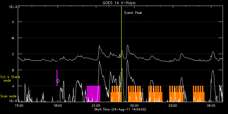 EIS Observation timeline overlay to GOES-Xray curve Code 1" 2" 40" 266" EIS Observations list for this event: STUDY ACRONYM ID DATE OBSERVED DESCRIPTION NOAA# TARGET 0 regcal074 | 23668 | 2011/08/04 17:55:12 | Dark exposures including overscan pixe | | Engineering TIMELINE ID DATE OBSERVED FITS FILE XCEN (+W/-E) YCEN (+N/-S) DUR ----------------------------------------------------------------------------------------------------------------- 23668 | 2011/08/04 17:55:12.000 | eis_l0_20110804_175512.fits.gz | 113.00 | 245.05 | 3m22s 1 HPW021_VEL_120x512v1 | 23712 | 2011/08/04 20:17:20 | Active Region Temperature and Flows | 1263 | Active Region TIMELINE ID DATE OBSERVED FITS FILE XCEN (+W/-E) YCEN (+N/-S) DUR ----------------------------------------------------------------------------------------------------------------- 23712 | 2011/08/04 20:17:20.000 | eis_l0_20110804_201720.fits.gz | 238.18 | 210.33 | 1h1m53s 2 HH_Flare+AR_180x152 | 23718 | 2011/08/04 22:08:26 | Flare monitoring | 1263 | Flare TIMELINE ID DATE OBSERVED FITS FILE XCEN (+W/-E) YCEN (+N/-S) DUR ----------------------------------------------------------------------------------------------------------------- 23718 | 2011/08/04 22:08:26.000 | eis_l0_20110804_220826.fits.gz | 252.20 | 188.64 | 5m18s 23718 | 2011/08/04 22:13:47.000 | eis_l0_20110804_221347.fits.gz | 252.82 | 188.64 | 5m18s 23718 | 2011/08/04 22:19:08.000 | eis_l0_20110804_221908.fits.gz | 253.51 | 188.56 | 5m17s 23718 | 2011/08/04 22:24:28.000 | eis_l0_20110804_222428.fits.gz | 254.36 | 188.56 | 5m18s 23718 | 2011/08/04 22:29:49.000 | eis_l0_20110804_222949.fits.gz | 255.14 | 188.64 | 5m18s 23718 | 2011/08/04 22:35:10.000 | eis_l0_20110804_223510.fits.gz | 255.83 | 188.64 | 5m18s 23718 | 2011/08/04 22:40:31.000 | eis_l0_20110804_224031.fits.gz | 256.68 | 188.72 | 5m18s 23718 | 2011/08/04 22:45:51.000 | eis_l0_20110804_224551.fits.gz | 257.45 | 188.79 | 5m18s 23718 | 2011/08/04 22:51:12.000 | eis_l0_20110804_225112.fits.gz | 258.15 | 188.72 | 5m19s 3 HH_Flare+AR_180x152 | 23719 | 2011/08/04 23:30:13 | Flare monitoring | 1263 | Flare TIMELINE ID DATE OBSERVED FITS FILE XCEN (+W/-E) YCEN (+N/-S) DUR ----------------------------------------------------------------------------------------------------------------- 23719 | 2011/08/04 23:30:13.000 | eis_l0_20110804_233013.fits.gz | 263.48 | 188.95 | 5m18s 23719 | 2011/08/04 23:35:33.000 | eis_l0_20110804_233533.fits.gz | 264.33 | 188.95 | 5m19s 23719 | 2011/08/04 23:40:54.000 | eis_l0_20110804_234054.fits.gz | 265.10 | 188.87 | 5m18s 23719 | 2011/08/04 23:46:15.000 | eis_l0_20110804_234615.fits.gz | 265.87 | 189.02 | 5m18s 23719 | 2011/08/04 23:51:36.000 | eis_l0_20110804_235136.fits.gz | 266.64 | 188.95 | 5m18s 23719 | 2011/08/04 23:56:57.000 | eis_l0_20110804_235657.fits.gz | 267.34 | 189.02 | 5m18s 23719 | 2011/08/05 00:02:18.000 | eis_l0_20110805_000218.fits.gz | 268.04 | 188.95 | 5m18s 23719 | 2011/08/05 00:07:38.000 | eis_l0_20110805_000738.fits.gz | 268.81 | 188.95 | 5m19s 23719 | 2011/08/05 00:13:00.000 | eis_l0_20110805_001300.fits.gz | 269.43 | 189.02 | 5m17s 23719 | 2011/08/05 00:18:20.000 | eis_l0_20110805_001820.fits.gz | 270.28 | 189.10 | 5m17s 23719 | 2011/08/05 00:23:40.000 | eis_l0_20110805_002340.fits.gz | 271.05 | 189.02 | 5m18s 23719 | 2011/08/05 00:29:01.000 | eis_l0_20110805_002901.fits.gz | 271.82 | 188.95 | 5m18s 4 HH_Flare+AR_180x152 | 23720 | 2011/08/05 01:05:44 | Flare monitoring | 1263 | Flare TIMELINE ID DATE OBSERVED FITS FILE XCEN (+W/-E) YCEN (+N/-S) DUR ----------------------------------------------------------------------------------------------------------------- 23720 | 2011/08/05 01:05:44.000 | eis_l0_20110805_010544.fits.gz | 276.92 | 189.26 | 5m17s 23720 | 2011/08/05 01:11:04.000 | eis_l0_20110805_011104.fits.gz | 277.69 | 189.33 | 5m18s 23720 | 2011/08/05 01:16:25.000 | eis_l0_20110805_011625.fits.gz | 278.39 | 189.33 | 5m17s 23720 | 2011/08/05 01:21:45.000 | eis_l0_20110805_012145.fits.gz | 279.24 | 189.18 | 5m19s 23720 | 2011/08/05 01:27:06.000 | eis_l0_20110805_012706.fits.gz | 279.86 | 189.41 | 5m19s 23720 | 2011/08/05 01:32:28.000 | eis_l0_20110805_013228.fits.gz | 280.63 | 189.33 | 5m17s 23720 | 2011/08/05 01:37:48.000 | eis_l0_20110805_013748.fits.gz | 281.32 | 189.41 | 5m17s 23720 | 2011/08/05 01:43:08.000 | eis_l0_20110805_014308.fits.gz | 282.10 | 189.41 | 5m17s 23720 | 2011/08/05 01:48:28.000 | eis_l0_20110805_014828.fits.gz | 282.87 | 189.33 | 5m18s 23720 | 2011/08/05 01:53:48.000 | eis_l0_20110805_015348.fits.gz | 283.64 | 189.33 | 5m18s 23720 | 2011/08/05 01:59:09.000 | eis_l0_20110805_015909.fits.gz | 284.41 | 189.41 | 5m17s 23720 | 2011/08/05 02:04:29.000 | eis_l0_20110805_020429.fits.gz | 285.18 | 189.41 | 5m18s 5 HH_Flare+AR_180x152 | 23721 | 2011/08/05 02:44:14 | Flare monitoring | 1263 | Flare TIMELINE ID DATE OBSERVED FITS FILE XCEN (+W/-E) YCEN (+N/-S) DUR ----------------------------------------------------------------------------------------------------------------- 23721 | 2011/08/05 02:44:14.000 | eis_l0_20110805_024414.fits.gz | 290.52 | 189.80 | 5m17s 23721 | 2011/08/05 02:49:34.000 | eis_l0_20110805_024934.fits.gz | 291.29 | 189.87 | 5m17s 23721 | 2011/08/05 02:54:54.000 | eis_l0_20110805_025454.fits.gz | 292.06 | 189.72 | 5m18s 23721 | 2011/08/05 03:00:14.000 | eis_l0_20110805_030014.fits.gz | 292.83 | 189.64 | 5m19s 23721 | 2011/08/05 03:05:35.000 | eis_l0_20110805_030535.fits.gz | 293.53 | 189.72 | 5m19s 23721 | 2011/08/05 03:10:57.000 | eis_l0_20110805_031057.fits.gz | 294.22 | 189.80 | 5m18s 23721 | 2011/08/05 03:16:17.000 | eis_l0_20110805_031617.fits.gz | 295.07 | 189.64 | 5m18s 23721 | 2011/08/05 03:21:38.000 | eis_l0_20110805_032138.fits.gz | 295.85 | 189.72 | 5m18s 23721 | 2011/08/05 03:26:58.000 | eis_l0_20110805_032658.fits.gz | 296.46 | 189.87 | 5m19s 23721 | 2011/08/05 03:32:20.000 | eis_l0_20110805_033220.fits.gz | 297.31 | 189.80 | 5m17s 23721 | 2011/08/05 03:37:40.000 | eis_l0_20110805_033740.fits.gz | 297.93 | 189.87 | 5m18s 23721 | 2