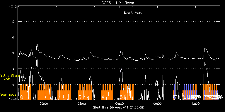 EIS Observation timeline overlay to GOES-Xray curve Code 1" 2" 40" 266" EIS Observations list for this event: STUDY ACRONYM ID DATE OBSERVED DESCRIPTION NOAA# TARGET 0 HH_Flare+AR_180x152 | 23718 | 2011/08/04 22:08:26 | Flare monitoring | 1263 | Flare TIMELINE ID DATE OBSERVED FITS FILE XCEN (+W/-E) YCEN (+N/-S) DUR ----------------------------------------------------------------------------------------------------------------- 23718 | 2011/08/04 22:08:26.000 | eis_l0_20110804_220826.fits.gz | 252.20 | 188.64 | 5m18s 23718 | 2011/08/04 22:13:47.000 | eis_l0_20110804_221347.fits.gz | 252.82 | 188.64 | 5m18s 23718 | 2011/08/04 22:19:08.000 | eis_l0_20110804_221908.fits.gz | 253.51 | 188.56 | 5m17s 23718 | 2011/08/04 22:24:28.000 | eis_l0_20110804_222428.fits.gz | 254.36 | 188.56 | 5m18s 23718 | 2011/08/04 22:29:49.000 | eis_l0_20110804_222949.fits.gz | 255.14 | 188.64 | 5m18s 23718 | 2011/08/04 22:35:10.000 | eis_l0_20110804_223510.fits.gz | 255.83 | 188.64 | 5m18s 23718 | 2011/08/04 22:40:31.000 | eis_l0_20110804_224031.fits.gz | 256.68 | 188.72 | 5m18s 23718 | 2011/08/04 22:45:51.000 | eis_l0_20110804_224551.fits.gz | 257.45 | 188.79 | 5m18s 23718 | 2011/08/04 22:51:12.000 | eis_l0_20110804_225112.fits.gz | 258.15 | 188.72 | 5m19s 1 HH_Flare+AR_180x152 | 23719 | 2011/08/04 23:30:13 | Flare monitoring | 1263 | Flare TIMELINE ID DATE OBSERVED FITS FILE XCEN (+W/-E) YCEN (+N/-S) DUR ----------------------------------------------------------------------------------------------------------------- 23719 | 2011/08/04 23:30:13.000 | eis_l0_20110804_233013.fits.gz | 263.48 | 188.95 | 5m18s 23719 | 2011/08/04 23:35:33.000 | eis_l0_20110804_233533.fits.gz | 264.33 | 188.95 | 5m19s 23719 | 2011/08/04 23:40:54.000 | eis_l0_20110804_234054.fits.gz | 265.10 | 188.87 | 5m18s 23719 | 2011/08/04 23:46:15.000 | eis_l0_20110804_234615.fits.gz | 265.87 | 189.02 | 5m18s 23719 | 2011/08/04 23:51:36.000 | eis_l0_20110804_235136.fits.gz | 266.64 | 188.95 | 5m18s 23719 | 2011/08/04 23:56:57.000 | eis_l0_20110804_235657.fits.gz | 267.34 | 189.02 | 5m18s 23719 | 2011/08/05 00:02:18.000 | eis_l0_20110805_000218.fits.gz | 268.04 | 188.95 | 5m18s 23719 | 2011/08/05 00:07:38.000 | eis_l0_20110805_000738.fits.gz | 268.81 | 188.95 | 5m19s 23719 | 2011/08/05 00:13:00.000 | eis_l0_20110805_001300.fits.gz | 269.43 | 189.02 | 5m17s 23719 | 2011/08/05 00:18:20.000 | eis_l0_20110805_001820.fits.gz | 270.28 | 189.10 | 5m17s 23719 | 2011/08/05 00:23:40.000 | eis_l0_20110805_002340.fits.gz | 271.05 | 189.02 | 5m18s 23719 | 2011/08/05 00:29:01.000 | eis_l0_20110805_002901.fits.gz | 271.82 | 188.95 | 5m18s 2 HH_Flare+AR_180x152 | 23720 | 2011/08/05 01:05:44 | Flare monitoring | 1263 | Flare TIMELINE ID DATE OBSERVED FITS FILE XCEN (+W/-E) YCEN (+N/-S) DUR ----------------------------------------------------------------------------------------------------------------- 23720 | 2011/08/05 01:05:44.000 | eis_l0_20110805_010544.fits.gz | 276.92 | 189.26 | 5m17s 23720 | 2011/08/05 01:11:04.000 | eis_l0_20110805_011104.fits.gz | 277.69 | 189.33 | 5m18s 23720 | 2011/08/05 01:16:25.000 | eis_l0_20110805_011625.fits.gz | 278.39 | 189.33 | 5m17s 23720 | 2011/08/05 01:21:45.000 | eis_l0_20110805_012145.fits.gz | 279.24 | 189.18 | 5m19s 23720 | 2011/08/05 01:27:06.000 | eis_l0_20110805_012706.fits.gz | 279.86 | 189.41 | 5m19s 23720 | 2011/08/05 01:32:28.000 | eis_l0_20110805_013228.fits.gz | 280.63 | 189.33 | 5m17s 23720 | 2011/08/05 01:37:48.000 | eis_l0_20110805_013748.fits.gz | 281.32 | 189.41 | 5m17s 23720 | 2011/08/05 01:43:08.000 | eis_l0_20110805_014308.fits.gz | 282.10 | 189.41 | 5m17s 23720 | 2011/08/05 01:48:28.000 | eis_l0_20110805_014828.fits.gz | 282.87 | 189.33 | 5m18s 23720 | 2011/08/05 01:53:48.000 | eis_l0_20110805_015348.fits.gz | 283.64 | 189.33 | 5m18s 23720 | 2011/08/05 01:59:09.000 | eis_l0_20110805_015909.fits.gz | 284.41 | 189.41 | 5m17s 23720 | 2011/08/05 02:04:29.000 | eis_l0_20110805_020429.fits.gz | 285.18 | 189.41 | 5m18s 3 HH_Flare+AR_180x152 | 23721 | 2011/08/05 02:44:14 | Flare monitoring | 1263 | Flare TIMELINE ID DATE OBSERVED FITS FILE XCEN (+W/-E) YCEN (+N/-S) DUR ----------------------------------------------------------------------------------------------------------------- 23721 | 2011/08/05 02:44:14.000 | eis_l0_20110805_024414.fits.gz | 290.52 | 189.80 | 5m17s 23721 | 2011/08/05 02:49:34.000 | eis_l0_20110805_024934.fits.gz | 291.29 | 189.87 | 5m17s 23721 | 2011/08/05 02:54:54.000 | eis_l0_20110805_025454.fits.gz | 292.06 | 189.72 | 5m18s 23721 | 2011/08/05 03:00:14.000 | eis_l0_20110805_030014.fits.gz | 292.83 | 189.64 | 5m19s 23721 | 2011/08/05 03:05:35.000 | eis_l0_20110805_030535.fits.gz | 293.53 | 189.72 | 5m19s 23721 | 2011/08/05 03:10:57.000 | eis_l0_20110805_031057.fits.gz | 294.22 | 189.80 | 5m18s 23721 | 2011/08/05 03:16:17.000 | eis_l0_20110805_031617.fits.gz | 295.07 | 189.64 | 5m18s 23721 | 2011/08/05 03:21:38.000 | eis_l0_20110805_032138.fits.gz | 295.85 | 189.72 | 5m18s 23721 | 2011/08/05 03:26:58.000 | eis_l0_20110805_032658.fits.gz | 296.46 | 189.87 | 5m19s 23721 | 2011/08/05 03:32:20.000 | eis_l0_20110805_033220.fits.gz | 297.31 | 189.80 | 5m17s 23721 | 2011/08/05 03:37:40.000 | eis_l0_20110805_033740.fits.gz | 297.93 | 189.87 | 5m18s 23721 | 2011/08/05 03:43:01.000 | eis_l0_20110805_034301.fits.gz | 298.78 | 189.87 | 5m17s 4 HH_Flare+AR_180x152 | 23722 | 2011/08/05 04:34:13 | Flare monitoring | 1263 | Flare TIMELINE ID DATE OBSERVED FITS FILE XCEN (+W/-E) YCEN (+N/-S) DUR ----------------------------------------------------------------------------------------------------------------- 23722 | 2011/08/05 04:34:13.000 | eis_l0_20110805_043413.fits.gz | 305.89 | 190.26 | 5m19s 23722 | 2011/08/05 04:39:34.000 | eis_l0_20110805_043934.fits.gz | 306.58 | 189.95 | 5m18s 23722 | 2011/08/05 04:44:55.000 | eis_l0_20110805_044455.fits.gz | 307.28 | 190.11 | 5m18s 23722 | 2011/08/05 04:50:16.000 | eis_l0_20110805_045016.fits.gz | 308.05 | 190.11 | 5m17s 23722 | 2011/08/05 04:55:36.000 | eis_l0_2011