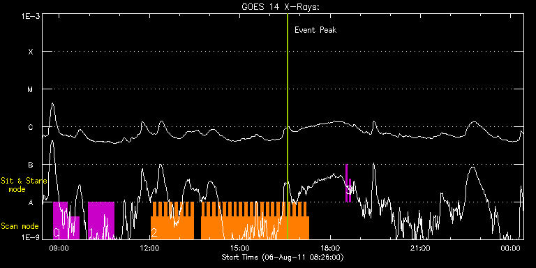 EIS Observation timeline overlay to GOES-Xray curve Code 1" 2" 40" 266" EIS Observations list for this event: STUDY ACRONYM ID DATE OBSERVED DESCRIPTION NOAA# TARGET 0 HH_FWHM_CAL_Norikura | 23715 | 2011/08/06 08:48:12 | Quiet Sun and Facular Region Propertie | 1263 | Active Region TIMELINE ID DATE OBSERVED FITS FILE XCEN (+W/-E) YCEN (+N/-S) DUR ----------------------------------------------------------------------------------------------------------------- 23715 | 2011/08/06 08:48:12.000 | eis_l0_20110806_084812.fits.gz | 528.22 | 159.87 | 27m39s 23715 | 2011/08/06 09:15:53.000 | eis_l0_20110806_091553.fits.gz | 531.54 | 160.18 | 24m12s 1 HH_FWHM_CAL_Norikura | 23727 | 2011/08/06 09:57:14 | Quiet Sun and Facular Region Propertie | 1263 | Active Region TIMELINE ID DATE OBSERVED FITS FILE XCEN (+W/-E) YCEN (+N/-S) DUR ----------------------------------------------------------------------------------------------------------------- 23727 | 2011/08/06 09:57:14.000 | eis_l0_20110806_095714.fits.gz | 536.41 | 160.56 | 51m53s 2 HH_Flare+AR_180x152 | 23728 | 2011/08/06 12:02:27 | Major flare Watch | 1263 | Flare TIMELINE ID DATE OBSERVED FITS FILE XCEN (+W/-E) YCEN (+N/-S) DUR ----------------------------------------------------------------------------------------------------------------- 23728 | 2011/08/06 12:02:27.000 | eis_l0_20110806_120227.fits.gz | 528.98 | 182.11 | 5m18s 23728 | 2011/08/06 12:07:48.000 | eis_l0_20110806_120748.fits.gz | 529.67 | 182.04 | 5m18s 23728 | 2011/08/06 12:13:09.000 | eis_l0_20110806_121309.fits.gz | 530.37 | 182.04 | 5m18s 23728 | 2011/08/06 12:18:29.000 | eis_l0_20110806_121829.fits.gz | 531.06 | 182.19 | 5m18s 23728 | 2011/08/06 12:23:50.000 | eis_l0_20110806_122350.fits.gz | 531.68 | 182.11 | 5m17s 23728 | 2011/08/06 12:29:10.000 | eis_l0_20110806_122910.fits.gz | 532.22 | 182.27 | 5m18s 23728 | 2011/08/06 12:34:31.000 | eis_l0_20110806_123431.fits.gz | 532.84 | 182.27 | 5m18s 23728 | 2011/08/06 12:39:52.000 | eis_l0_20110806_123952.fits.gz | 533.54 | 182.35 | 5m18s 23728 | 2011/08/06 12:45:13.000 | eis_l0_20110806_124513.fits.gz | 534.15 | 182.42 | 5m18s 23728 | 2011/08/06 12:50:34.000 | eis_l0_20110806_125034.fits.gz | 534.77 | 182.42 | 5m18s 23728 | 2011/08/06 12:55:54.000 | eis_l0_20110806_125554.fits.gz | 535.31 | 182.58 | 5m18s 23728 | 2011/08/06 13:01:15.000 | eis_l0_20110806_130115.fits.gz | 536.09 | 182.58 | 5m18s 23728 | 2011/08/06 13:06:35.000 | eis_l0_20110806_130635.fits.gz | 536.63 | 182.58 | 5m18s 23728 | 2011/08/06 13:11:56.000 | eis_l0_20110806_131156.fits.gz | 537.24 | 182.81 | 5m17s 23728 | 2011/08/06 13:17:16.000 | eis_l0_20110806_131716.fits.gz | 537.86 | 182.81 | 5m18s 23728 | 2011/08/06 13:22:37.000 | eis_l0_20110806_132237.fits.gz | 538.48 | 182.89 | 4m46s 23728 | 2011/08/06 13:43:26.000 | eis_l0_20110806_134326.fits.gz | 540.95 | 182.89 | 31s 23728 | 2011/08/06 13:44:00.000 | eis_l0_20110806_134400.fits.gz | 541.03 | 182.89 | 5m18s 23728 | 2011/08/06 13:49:20.000 | eis_l0_20110806_134920.fits.gz | 541.65 | 182.89 | 5m19s 23728 | 2011/08/06 13:54:42.000 | eis_l0_20110806_135442.fits.gz | 542.27 | 182.96 | 5m18s 23728 | 2011/08/06 14:00:03.000 | eis_l0_20110806_140003.fits.gz | 542.88 | 183.04 | 5m18s 23728 | 2011/08/06 14:05:24.000 | eis_l0_20110806_140524.fits.gz | 543.42 | 183.12 | 5m17s 23728 | 2011/08/06 14:10:44.000 | eis_l0_20110806_141044.fits.gz | 544.20 | 183.12 | 5m18s 23728 | 2011/08/06 14:16:05.000 | eis_l0_20110806_141605.fits.gz | 544.74 | 183.12 | 5m18s 23728 | 2011/08/06 14:21:26.000 | eis_l0_20110806_142126.fits.gz | 545.35 | 183.27 | 5m18s 23728 | 2011/08/06 14:26:47.000 | eis_l0_20110806_142647.fits.gz | 545.97 | 183.35 | 5m19s 23728 | 2011/08/06 14:32:08.000 | eis_l0_20110806_143208.fits.gz | 546.59 | 183.35 | 5m18s 23728 | 2011/08/06 14:37:29.000 | eis_l0_20110806_143729.fits.gz | 547.21 | 183.35 | 5m18s 23728 | 2011/08/06 14:42:50.000 | eis_l0_20110806_144250.fits.gz | 547.90 | 183.43 | 5m17s 23728 | 2011/08/06 14:48:10.000 | eis_l0_20110806_144810.fits.gz | 548.60 | 168.75 | 5m18s 23728 | 2011/08/06 14:53:30.000 | eis_l0_20110806_145330.fits.gz | 549.14 | 183.58 | 5m18s 23728 | 2011/08/06 14:58:51.000 | eis_l0_20110806_145851.fits.gz | 549.76 | 183.43 | 5m17s 23728 | 2011/08/06 15:04:11.000 | eis_l0_20110806_150411.fits.gz | 550.38 | 183.58 | 5m17s 23728 | 2011/08/06 15:09:31.000 | eis_l0_20110806_150931.fits.gz | 550.99 | 183.58 | 5m18s 23728 | 2011/08/06 15:14:52.000 | eis_l0_20110806_151452.fits.gz | 551.53 | 183.74 | 5m18s 23728 | 2011/08/06 15:20:13.000 | eis_l0_20110806_152013.fits.gz | 552.23 | 183.74 | 5m18s 23728 | 2011/08/06 15:25:34.000 | eis_l0_20110806_152534.fits.gz | 552.85 | 183.74 | 5m17s 23728 | 2011/08/06 15:30:54.000 | eis_l0_20110806_153054.fits.gz | 553.47 | 183.74 | 5m18s 23728 | 2011/08/06 15:36:15.000 | eis_l0_20110806_153615.fits.gz | 554.08 | 183.81 | 5m18s 23728 | 2011/08/06 15:41:35.000 | eis_l0_20110806_154135.fits.gz | 554.62 | 183.89 | 5m18s 23728 | 2011/08/06 15:46:56.000 | eis_l0_20110806_154656.fits.gz | 555.32 | 183.97 | 5m19s 23728 | 2011/08/06 15:52:18.000 | eis_l0_20110806_155218.fits.gz | 555.86 | 184.04 | 5m18s 23728 | 2011/08/06 15:57:39.000 | eis_l0_20110806_155739.fits.gz | 556.40 | 184.04 | 5m17s 23728 | 2011/08/06 16:02:59.000 | eis_l0_20110806_160259.fits.gz | 557.17 | 184.04 | 5m18s 23728 | 2011/08/06 16:08:20.000 | eis_l0_20110806_160820.fits.gz | 557.64 | 184.20 | 5m17s 23728 | 2011/08/06 16:13:40.000 | eis_l0_20110806_161340.fits.gz | 558.26 | 184.35 | 5m19s 23728 | 2011/08/06 16:19:01.000 | eis_l0_20110806_161901.fits.gz | 558.95 | 184.35 | 5m19s 23728 | 2011/08/06 16:24:22.000 | eis_l0_20110806_162422.fits.gz | 559.57 | 184.35 | 5m18s 23728 | 2011/08/06 16:29:43.000 | eis_l0_20110806_162943.fits.gz | 560.26 | 184.59 | 5m18s 23728 | 2011/08/06 16:35:04.000 | eis_l0_20110806_163504.fits.gz | 560.80 | 184.35 | 5m18s 23728 | 2011/08/06 16:40:25.000 | eis_l0_20110806_164025.fits.gz | 561.50 | 184.43 | 5m18s 23728 | 2011/08/06 16:45:46.000 | eis_l0_20110806_164546.f