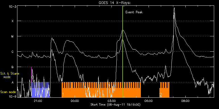 EIS Observation timeline overlay to GOES-Xray curve Code 1" 2" 40" 266" EIS Observations list for this event: STUDY ACRONYM ID DATE OBSERVED DESCRIPTION NOAA# TARGET 0 Alignment_modify_v2 | 23737 | 2011/08/08 20:27:19 | Hinode instrument alignment programme | | Quiet Sun TIMELINE ID DATE OBSERVED FITS FILE XCEN (+W/-E) YCEN (+N/-S) DUR ----------------------------------------------------------------------------------------------------------------- 23737 | 2011/08/08 20:27:19.000 | eis_l0_20110808_202719.fits.gz | -9854.52 | -9963.20 | 1m 23737 | 2011/08/08 20:28:45.000 | eis_l0_20110808_202845.fits.gz | -9893.96 | -9963.20 | 2m33s 23737 | 2011/08/08 20:31:52.000 | eis_l0_20110808_203152.fits.gz | -9893.96 | -9963.20 | 2m34s 23737 | 2011/08/08 20:35:00.000 | eis_l0_20110808_203500.fits.gz | -9893.96 | -9963.20 | 2m34s 23737 | 2011/08/08 20:38:07.000 | eis_l0_20110808_203807.fits.gz | -9893.96 | -9963.20 | 2m34s 23737 | 2011/08/08 20:41:14.000 | eis_l0_20110808_204114.fits.gz | -9893.96 | -9963.20 | 2m35s 23737 | 2011/08/08 20:44:22.000 | eis_l0_20110808_204422.fits.gz | -9893.96 | -9963.20 | 2m34s 23737 | 2011/08/08 20:47:30.000 | eis_l0_20110808_204730.fits.gz | -9893.96 | -9963.20 | 2m34s 23737 | 2011/08/08 20:50:37.000 | eis_l0_20110808_205037.fits.gz | -9893.96 | -9963.20 | 2m34s 23737 | 2011/08/08 20:53:45.000 | eis_l0_20110808_205345.fits.gz | -9893.96 | -9963.20 | 2m34s 23737 | 2011/08/08 20:56:52.000 | eis_l0_20110808_205652.fits.gz | -9893.96 | -9963.20 | 2m34s 23737 | 2011/08/08 21:00:00.000 | eis_l0_20110808_210000.fits.gz | -9893.96 | -9963.20 | 2m34s 23737 | 2011/08/08 21:03:07.000 | eis_l0_20110808_210307.fits.gz | -9893.96 | -9963.20 | 2m34s 23737 | 2011/08/08 21:06:15.000 | eis_l0_20110808_210615.fits.gz | -9893.96 | -9963.20 | 2m34s 23737 | 2011/08/08 21:09:22.000 | eis_l0_20110808_210922.fits.gz | -9893.96 | -9963.20 | 2m34s 23737 | 2011/08/08 21:12:30.000 | eis_l0_20110808_211230.fits.gz | -9893.96 | -9963.20 | 2m34s 23737 | 2011/08/08 21:15:37.000 | eis_l0_20110808_211537.fits.gz | -9893.96 | -9963.20 | 2m34s 23737 | 2011/08/08 21:18:45.000 | eis_l0_20110808_211845.fits.gz | -9893.96 | -9963.20 | 2m34s 23737 | 2011/08/08 21:21:53.000 | eis_l0_20110808_212153.fits.gz | -9893.96 | -9963.20 | 2m33s 23737 | 2011/08/08 21:25:00.000 | eis_l0_20110808_212500.fits.gz | -9893.96 | -9963.20 | 2m34s 23737 | 2011/08/08 21:28:08.000 | eis_l0_20110808_212808.fits.gz | -9893.96 | -9963.20 | 2m34s 23737 | 2011/08/08 21:31:15.000 | eis_l0_20110808_213115.fits.gz | -9893.96 | -9963.20 | 2m34s 23737 | 2011/08/08 21:34:23.000 | eis_l0_20110808_213423.fits.gz | -9893.96 | -9963.20 | 2m34s 23737 | 2011/08/08 21:37:30.000 | eis_l0_20110808_213730.fits.gz | -9893.96 | -9963.20 | 2m34s 23737 | 2011/08/08 21:40:38.000 | eis_l0_20110808_214038.fits.gz | -9893.96 | -9963.20 | 2m34s 23737 | 2011/08/08 21:43:45.000 | eis_l0_20110808_214345.fits.gz | -9893.96 | -9963.20 | 2m34s 23737 | 2011/08/08 21:46:53.000 | eis_l0_20110808_214653.fits.gz | -9893.96 | -9963.20 | 2m34s 23737 | 2011/08/08 21:50:01.000 | eis_l0_20110808_215001.fits.gz | -9893.96 | -9963.20 | 2m33s 23737 | 2011/08/08 21:53:08.000 | eis_l0_20110808_215308.fits.gz | -9893.96 | -9963.20 | 2m34s 1 HH_Flare+AR_180x152 | 23738 | 2011/08/08 22:56:32 | Major flare Watch | 1263 | Flare TIMELINE ID DATE OBSERVED FITS FILE XCEN (+W/-E) YCEN (+N/-S) DUR ----------------------------------------------------------------------------------------------------------------- 23738 | 2011/08/08 22:56:32.000 | eis_l0_20110808_225632.fits.gz | 842.06 | 223.36 | 5m18s 23738 | 2011/08/08 23:01:53.000 | eis_l0_20110808_230153.fits.gz | 842.29 | 223.29 | 5m19s 23738 | 2011/08/08 23:07:15.000 | eis_l0_20110808_230715.fits.gz | 842.53 | 223.44 | 5m17s 23738 | 2011/08/08 23:12:35.000 | eis_l0_20110808_231235.fits.gz | 842.84 | 223.60 | 5m18s 23738 | 2011/08/08 23:17:55.000 | eis_l0_20110808_231755.fits.gz | 843.14 | 223.60 | 5m19s 23738 | 2011/08/08 23:23:16.000 | eis_l0_20110808_232316.fits.gz | 843.45 | 223.60 | 5m18s 23738 | 2011/08/08 23:28:37.000 | eis_l0_20110808_232837.fits.gz | 843.68 | 223.83 | 5m18s 23738 | 2011/08/08 23:33:58.000 | eis_l0_20110808_233358.fits.gz | 844.07 | 223.83 | 5m18s 23738 | 2011/08/08 23:39:19.000 | eis_l0_20110808_233919.fits.gz | 844.38 | 223.90 | 5m18s 23738 | 2011/08/08 23:44:39.000 | eis_l0_20110808_234439.fits.gz | 844.53 | 223.83 | 1m56s 23738 | 2011/08/08 23:46:47.000 | eis_l0_20110808_234647.fits.gz | 844.77 | 224.06 | 3m10s 23738 | 2011/08/08 23:50:00.000 | eis_l0_20110808_235000.fits.gz | 844.84 | 224.06 | 5m18s 23738 | 2011/08/08 23:55:21.000 | eis_l0_20110808_235521.fits.gz | 845.08 | 224.14 | 5m19s 23738 | 2011/08/09 00:00:42.000 | eis_l0_20110809_000042.fits.gz | 845.39 | 224.14 | 5m18s 23738 | 2011/08/09 00:06:03.000 | eis_l0_20110809_000603.fits.gz | 845.69 | 224.37 | 5m18s 23738 | 2011/08/09 00:11:24.000 | eis_l0_20110809_001124.fits.gz | 845.92 | 224.45 | 5m18s 23738 | 2011/08/09 00:16:44.000 | eis_l0_20110809_001644.fits.gz | 846.23 | 224.52 | 5m19s 23738 | 2011/08/09 00:22:05.000 | eis_l0_20110809_002205.fits.gz | 846.54 | 224.60 | 5m19s 23738 | 2011/08/09 00:27:27.000 | eis_l0_20110809_002727.fits.gz | 846.85 | 224.60 | 5m17s 23738 | 2011/08/09 00:32:47.000 | eis_l0_20110809_003247.fits.gz | 847.16 | 224.60 | 5m17s 23738 | 2011/08/09 00:38:07.000 | eis_l0_20110809_003807.fits.gz | 847.39 | 224.68 | 5m18s 23738 | 2011/08/09 00:43:28.000 | eis_l0_20110809_004328.fits.gz | 847.62 | 224.75 | 5m17s 23738 | 2011/08/09 00:48:48.000 | eis_l0_20110809_004848.fits.gz | 847.93 | 224.83 | 5m18s 23738 | 2011/08/09 00:54:09.000 | eis_l0_20110809_005409.fits.gz | 848.16 | 224.99 | 5m18s 23738 | 2011/08/09 00:59:30.000 | eis_l0_20110809_005930.fits.gz | 848.47 | 224.99 | 5m18s 23738 | 2011/08/09 01:04:51.000 | eis_l0_20110809_010451.fits.gz | 848.78 | 225.14 | 5m17s 23738 | 2011/08/09 01:10:11.000 | eis_l0_20110809_011011.fits.gz | 849.02 | 225.29 | 5m17s 23738 | 2011/08/09 01:15:31.000 | eis_l0_20110809_011531.fits.gz | 849.3