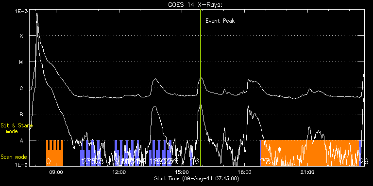 EIS Observation timeline overlay to GOES-Xray curve Code 1" 2" 40" 266" EIS Observations list for this event: STUDY ACRONYM ID DATE OBSERVED DESCRIPTION NOAA# TARGET 0 HH_Flare+AR_180x152 | 23740 | 2011/08/09 08:31:09 | Major flare Watch | | Flare TIMELINE ID DATE OBSERVED FITS FILE XCEN (+W/-E) YCEN (+N/-S) DUR ----------------------------------------------------------------------------------------------------------------- 23740 | 2011/08/09 08:31:09.000 | eis_l0_20110809_083109.fits.gz | 594.33 | -409.29 | 5m18s 23740 | 2011/08/09 08:36:30.000 | eis_l0_20110809_083630.fits.gz | 595.03 | -409.37 | 5m18s 23740 | 2011/08/09 08:41:51.000 | eis_l0_20110809_084151.fits.gz | 595.57 | -409.29 | 5m18s 23740 | 2011/08/09 08:47:11.000 | eis_l0_20110809_084711.fits.gz | 596.11 | -409.29 | 5m18s 23740 | 2011/08/09 08:52:32.000 | eis_l0_20110809_085232.fits.gz | 596.65 | -409.22 | 5m18s 23740 | 2011/08/09 08:57:52.000 | eis_l0_20110809_085752.fits.gz | 597.19 | -409.22 | 5m18s 23740 | 2011/08/09 09:03:13.000 | eis_l0_20110809_090313.fits.gz | 597.73 | -409.22 | 5m19s 23740 | 2011/08/09 09:08:35.000 | eis_l0_20110809_090835.fits.gz | 598.35 | -409.14 | 5m18s 23740 | 2011/08/09 09:13:56.000 | eis_l0_20110809_091356.fits.gz | 598.97 | -409.06 | 5m17s 1 full_sun_slot_scan_1 | 23746 | 2011/08/09 10:09:20 | Full Sun Scan | 1263 | Quiet Sun TIMELINE ID DATE OBSERVED FITS FILE XCEN (+W/-E) YCEN (+N/-S) DUR ----------------------------------------------------------------------------------------------------------------- 23746 | 2011/08/09 10:09:20.000 | eis_l0_20110809_100920.fits.gz | 920.76 | 185.58 | 2m32s 23746 | 2011/08/09 10:12:37.000 | eis_l0_20110809_101237.fits.gz | 920.76 | 185.58 | 2m10s 2 full_sun_slot_scan_1 | 23747 | 2011/08/09 10:14:52 | Full Sun Scan | | Quiet Sun TIMELINE ID DATE OBSERVED FITS FILE XCEN (+W/-E) YCEN (+N/-S) DUR ----------------------------------------------------------------------------------------------------------------- 23747 | 2011/08/09 10:14:52.000 | eis_l0_20110809_101452.fits.gz | 920.61 | -286.35 | 5m26s 3 full_sun_slot_scan_1 | 23748 | 2011/08/09 10:25:13 | Full Sun Scan | 1266 | Quiet Sun TIMELINE ID DATE OBSERVED FITS FILE XCEN (+W/-E) YCEN (+N/-S) DUR ----------------------------------------------------------------------------------------------------------------- 23748 | 2011/08/09 10:25:13.000 | eis_l0_20110809_102513.fits.gz | 452.64 | 185.42 | 5m28s 4 full_sun_slot_scan_1 | 23749 | 2011/08/09 10:30:46 | Full Sun Scan | 1267 | Quiet Sun TIMELINE ID DATE OBSERVED FITS FILE XCEN (+W/-E) YCEN (+N/-S) DUR ----------------------------------------------------------------------------------------------------------------- 23749 | 2011/08/09 10:30:46.000 | eis_l0_20110809_103046.fits.gz | 452.72 | -286.58 | 5m27s 5 full_sun_slot_scan_1 | 23750 | 2011/08/09 10:41:13 | Full Sun Scan | 1266 | Quiet Sun TIMELINE ID DATE OBSERVED FITS FILE XCEN (+W/-E) YCEN (+N/-S) DUR ----------------------------------------------------------------------------------------------------------------- 23750 | 2011/08/09 10:41:13.000 | eis_l0_20110809_104113.fits.gz | -15.32 | 185.50 | 5m28s 6 full_sun_slot_scan_1 | 23751 | 2011/08/09 10:46:46 | Full Sun Scan | 1267 | Quiet Sun TIMELINE ID DATE OBSERVED FITS FILE XCEN (+W/-E) YCEN (+N/-S) DUR ----------------------------------------------------------------------------------------------------------------- 23751 | 2011/08/09 10:46:46.000 | eis_l0_20110809_104646.fits.gz | -15.32 | -286.35 | 5m26s 7 full_sun_slot_scan_1 | 23752 | 2011/08/09 10:57:13 | Full Sun Scan | | Quiet Sun TIMELINE ID DATE OBSERVED FITS FILE XCEN (+W/-E) YCEN (+N/-S) DUR ----------------------------------------------------------------------------------------------------------------- 23752 | 2011/08/09 10:57:13.000 | eis_l0_20110809_105713.fits.gz | -483.37 | 185.58 | 5m28s 8 full_sun_slot_scan_1 | 23753 | 2011/08/09 11:02:46 | Full Sun Scan | | Quiet Sun TIMELINE ID DATE OBSERVED FITS FILE XCEN (+W/-E) YCEN (+N/-S) DUR ----------------------------------------------------------------------------------------------------------------- 23753 | 2011/08/09 11:02:46.000 | eis_l0_20110809_110246.fits.gz | -483.21 | -286.50 | 5m26s 9 full_sun_slot_scan_1 | 23770 | 2011/08/09 11:48:27 | Full Sun Scan | | Quiet Sun TIMELINE ID DATE OBSERVED FITS FILE XCEN (+W/-E) YCEN (+N/-S) DUR ----------------------------------------------------------------------------------------------------------------- 23770 | 2011/08/09 11:48:27.000 | eis_l0_20110809_114827.fits.gz | -9884.72 | -9777.20 | 4m43s 10 full_sun_slot_scan_1 | 23771 | 2011/08/09 11:53:15 | Full Sun Scan | | Quiet Sun TIMELINE ID DATE OBSERVED FITS FILE XCEN (+W/-E) YCEN (+N/-S) DUR ----------------------------------------------------------------------------------------------------------------- 23771 | 2011/08/09 11:53:15.000 | eis_l0_20110809_115315.fits.gz | -9884.72 | -10249.20 | 5m27s 11 full_sun_slot_scan_1 | 23754 | 2011/08/09 12:03:43 | Full Sun Scan | | Quiet Sun TIMELINE ID DATE OBSERVED FITS FILE XCEN (+W/-E) YCEN (+N/-S) DUR ----------------------------------------------------------------------------------------------------------------- 23754 | 2011/08/09 12:03:43.000 | eis_l0_20110809_120343.fits.gz | 730.04 | 655.55 | 5m28s 12 full_sun_slot_scan_1 | 23755 | 2011/08/09 12:13:43 | Full Sun Scan | | Quiet Sun TIMELINE ID DATE OBSERVED FITS FILE XCEN (+W/-E) YCEN (+N/-S) DUR ----------------------------------------------------------------------------------------------------------------- 23755 | 2011/08/09 12:13:43.000 | eis_l0_20110809_121343.fits.gz | 395.71 | 1032.67 | 5m27s 13 full_sun_slot_scan_1 | 23756 | 2011/08/09 12:19:15 | Full Sun Scan | | Quiet Sun TIMELINE ID DATE OBSERVED FITS FILE XCEN (+W/-E) YCEN (+N/-S) DUR ----------------------------------------------------------------------------------------------------------------- 23756 | 2011/08/09 12:19:15.000 | eis_l0_20110809_121915.fits.gz | 395.79 | 560.52 | 5m27s 14 ful
