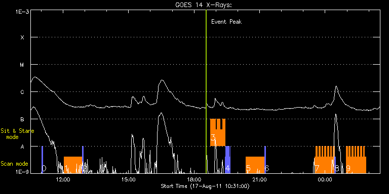 EIS Observation timeline overlay to GOES-Xray curve Code 1" 2" 40" 266" EIS Observations list for this event: STUDY ACRONYM ID DATE OBSERVED DESCRIPTION NOAA# TARGET 0 PRY_slot_contextLITE | 23855 | 2011/08/17 11:01:08 | TOO HOP 195 - Quiet Sun and Facular Re | | Active Region TIMELINE ID DATE OBSERVED FITS FILE XCEN (+W/-E) YCEN (+N/-S) DUR ----------------------------------------------------------------------------------------------------------------- 23855 | 2011/08/17 11:01:08.000 | eis_l0_20110817_110108.fits.gz | 204.60 | 248.93 | 2m56s 1 YKK_ARabund01 | 23867 | 2011/08/17 12:02:33 | Interchange reconnection AR-CH study ( | | Active Region TIMELINE ID DATE OBSERVED FITS FILE XCEN (+W/-E) YCEN (+N/-S) DUR ----------------------------------------------------------------------------------------------------------------- 23867 | 2011/08/17 12:02:33.000 | eis_l0_20110817_120233.fits.gz | 723.54 | -344.80 | 50m33s 2 PRY_slot_context_v3 | 23868 | 2011/08/17 12:53:17 | Interchange reconnection AR-CH study ( | | Active Region TIMELINE ID DATE OBSERVED FITS FILE XCEN (+W/-E) YCEN (+N/-S) DUR ----------------------------------------------------------------------------------------------------------------- 23868 | 2011/08/17 12:53:17.000 | eis_l0_20110817_125317.fits.gz | 700.84 | -418.18 | 2m57s 3 madj_qs_sns_15m | 23856 | 2011/08/17 18:45:33 | Observations of Chromosphere with BBSO | | Quiet Sun TIMELINE ID DATE OBSERVED FITS FILE XCEN (+W/-E) YCEN (+N/-S) DUR ----------------------------------------------------------------------------------------------------------------- 23856 | 2011/08/17 18:45:33.000 | eis_l0_20110817_184533.fits.gz | -732.82 | 176.71 | 13m8s 23856 | 2011/08/17 18:58:44.000 | eis_l0_20110817_185844.fits.gz | -731.50 | 176.40 | 3m29s 23856 | 2011/08/17 19:02:40.000 | eis_l0_20110817_190240.fits.gz | -731.27 | 176.40 | 9m12s 23856 | 2011/08/17 19:11:55.000 | eis_l0_20110817_191155.fits.gz | -730.34 | 176.32 | 6m7s 23856 | 2011/08/17 19:18:29.000 | eis_l0_20110817_191829.fits.gz | -729.72 | 176.24 | 6m34s 4 IUU_SLOT_136x400_Q65 | 23857 | 2011/08/17 19:25:14 | Observations of Chromosphere with BBSO | 1271 | Active Region TIMELINE ID DATE OBSERVED FITS FILE XCEN (+W/-E) YCEN (+N/-S) DUR ----------------------------------------------------------------------------------------------------------------- 23857 | 2011/08/17 19:25:14.000 | eis_l0_20110817_192514.fits.gz | -744.17 | 176.01 | 1m20s 23857 | 2011/08/17 19:26:43.000 | eis_l0_20110817_192643.fits.gz | -744.02 | 175.93 | 1m20s 23857 | 2011/08/17 19:28:11.000 | eis_l0_20110817_192811.fits.gz | -743.86 | 176.01 | 1m20s 23857 | 2011/08/17 19:29:40.000 | eis_l0_20110817_192940.fits.gz | -743.71 | 176.01 | 1m19s 23857 | 2011/08/17 19:31:08.000 | eis_l0_20110817_193108.fits.gz | -743.71 | 176.01 | 1m20s 23857 | 2011/08/17 19:32:36.000 | eis_l0_20110817_193236.fits.gz | -743.48 | 175.93 | 1m21s 23857 | 2011/08/17 19:34:05.000 | eis_l0_20110817_193405.fits.gz | -743.32 | 175.86 | 1m21s 23857 | 2011/08/17 19:35:34.000 | eis_l0_20110817_193534.fits.gz | -743.17 | 175.86 | 1m20s 23857 | 2011/08/17 19:37:02.000 | eis_l0_20110817_193702.fits.gz | -743.09 | 175.93 | 1m21s 23857 | 2011/08/17 19:38:31.000 | eis_l0_20110817_193831.fits.gz | -742.94 | 175.86 | 1m20s 5 YKK_ARabund01 | 23869 | 2011/08/17 20:22:33 | Interchange reconnection AR-CH study ( | | Active Region TIMELINE ID DATE OBSERVED FITS FILE XCEN (+W/-E) YCEN (+N/-S) DUR ----------------------------------------------------------------------------------------------------------------- 23869 | 2011/08/17 20:22:33.000 | eis_l0_20110817_202233.fits.gz | 761.70 | -338.15 | 50m33s 6 PRY_slot_context_v3 | 23870 | 2011/08/17 21:13:17 | Interchange reconnection AR-CH study ( | | Active Region TIMELINE ID DATE OBSERVED FITS FILE XCEN (+W/-E) YCEN (+N/-S) DUR ----------------------------------------------------------------------------------------------------------------- 23870 | 2011/08/17 21:13:17.000 | eis_l0_20110817_211317.fits.gz | 738.46 | -411.38 | 2m56s 7 CAM_ARTB_RHESSI_b_2 | 23858 | 2011/08/17 23:31:03 | Coordinated AR Observations with Hida | | Active Region TIMELINE ID DATE OBSERVED FITS FILE XCEN (+W/-E) YCEN (+N/-S) DUR ----------------------------------------------------------------------------------------------------------------- 23858 | 2011/08/17 23:31:03.000 | eis_l0_20110817_233103.fits.gz | 318.91 | 252.49 | 3m52s 23858 | 2011/08/17 23:34:58.000 | eis_l0_20110817_233458.fits.gz | 319.45 | 252.41 | 3m51s 23858 | 2011/08/17 23:38:52.000 | eis_l0_20110817_233852.fits.gz | 319.92 | 252.49 | 3m52s 23858 | 2011/08/17 23:42:47.000 | eis_l0_20110817_234247.fits.gz | 320.46 | 252.33 | 3m51s 23858 | 2011/08/17 23:46:41.000 | eis_l0_20110817_234641.fits.gz | 321.00 | 252.33 | 3m52s 23858 | 2011/08/17 23:50:36.000 | eis_l0_20110817_235036.fits.gz | 321.46 | 252.41 | 3m52s 23858 | 2011/08/17 23:54:30.000 | eis_l0_20110817_235430.fits.gz | 322.00 | 252.41 | 3m52s 23858 | 2011/08/17 23:58:25.000 | eis_l0_20110817_235825.fits.gz | 322.47 | 252.49 | 3m52s 23858 | 2011/08/18 00:02:20.000 | eis_l0_20110818_000220.fits.gz | 322.93 | 252.49 | 3m51s 23858 | 2011/08/18 00:06:14.000 | eis_l0_20110818_000614.fits.gz | 323.47 | 252.49 | 3m52s 23858 | 2011/08/18 00:10:09.000 | eis_l0_20110818_001009.fits.gz | 324.01 | 252.56 | 3m52s 23858 | 2011/08/18 00:14:03.000 | eis_l0_20110818_001403.fits.gz | 324.55 | 252.56 | 3m53s 23858 | 2011/08/18 00:17:58.000 | eis_l0_20110818_001758.fits.gz | 324.94 | 252.64 | 3m52s 23858 | 2011/08/18 00:21:53.000 | eis_l0_20110818_002153.fits.gz | 325.48 | 252.64 | 3m52s 8 PRY_slot_context_v3 | 23859 | 2011/08/18 00:25:56 | Context for HOP 128 | | Active Region TIMELINE ID DATE OBSERVED FITS FILE XCEN (+W/-E) YCEN (+N/-S) DUR ----------------------------------------------------------------------------------------------------------------- 23859 | 2011/08/18 00:25:56.000 | eis_l0_20110818_002556.fits.gz | 311.36 | 252.64 | 2m56s 9 CAM_ARTB_RHESSI_b_2 | 23860 | 2011/08/18 