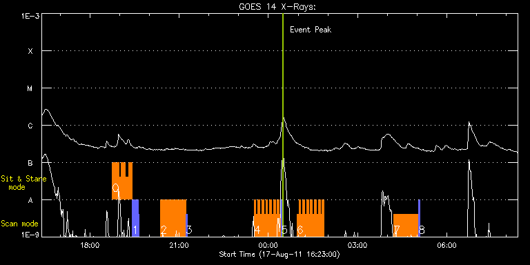 EIS Observation timeline overlay to GOES-Xray curve Code 1" 2" 40" 266" EIS Observations list for this event: STUDY ACRONYM ID DATE OBSERVED DESCRIPTION NOAA# TARGET 0 madj_qs_sns_15m | 23856 | 2011/08/17 18:45:33 | Observations of Chromosphere with BBSO | | Quiet Sun TIMELINE ID DATE OBSERVED FITS FILE XCEN (+W/-E) YCEN (+N/-S) DUR ----------------------------------------------------------------------------------------------------------------- 23856 | 2011/08/17 18:45:33.000 | eis_l0_20110817_184533.fits.gz | -732.82 | 176.71 | 13m8s 23856 | 2011/08/17 18:58:44.000 | eis_l0_20110817_185844.fits.gz | -731.50 | 176.40 | 3m29s 23856 | 2011/08/17 19:02:40.000 | eis_l0_20110817_190240.fits.gz | -731.27 | 176.40 | 9m12s 23856 | 2011/08/17 19:11:55.000 | eis_l0_20110817_191155.fits.gz | -730.34 | 176.32 | 6m7s 23856 | 2011/08/17 19:18:29.000 | eis_l0_20110817_191829.fits.gz | -729.72 | 176.24 | 6m34s 1 IUU_SLOT_136x400_Q65 | 23857 | 2011/08/17 19:25:14 | Observations of Chromosphere with BBSO | 1271 | Active Region TIMELINE ID DATE OBSERVED FITS FILE XCEN (+W/-E) YCEN (+N/-S) DUR ----------------------------------------------------------------------------------------------------------------- 23857 | 2011/08/17 19:25:14.000 | eis_l0_20110817_192514.fits.gz | -744.17 | 176.01 | 1m20s 23857 | 2011/08/17 19:26:43.000 | eis_l0_20110817_192643.fits.gz | -744.02 | 175.93 | 1m20s 23857 | 2011/08/17 19:28:11.000 | eis_l0_20110817_192811.fits.gz | -743.86 | 176.01 | 1m20s 23857 | 2011/08/17 19:29:40.000 | eis_l0_20110817_192940.fits.gz | -743.71 | 176.01 | 1m19s 23857 | 2011/08/17 19:31:08.000 | eis_l0_20110817_193108.fits.gz | -743.71 | 176.01 | 1m20s 23857 | 2011/08/17 19:32:36.000 | eis_l0_20110817_193236.fits.gz | -743.48 | 175.93 | 1m21s 23857 | 2011/08/17 19:34:05.000 | eis_l0_20110817_193405.fits.gz | -743.32 | 175.86 | 1m21s 23857 | 2011/08/17 19:35:34.000 | eis_l0_20110817_193534.fits.gz | -743.17 | 175.86 | 1m20s 23857 | 2011/08/17 19:37:02.000 | eis_l0_20110817_193702.fits.gz | -743.09 | 175.93 | 1m21s 23857 | 2011/08/17 19:38:31.000 | eis_l0_20110817_193831.fits.gz | -742.94 | 175.86 | 1m20s 2 YKK_ARabund01 | 23869 | 2011/08/17 20:22:33 | Interchange reconnection AR-CH study ( | | Active Region TIMELINE ID DATE OBSERVED FITS FILE XCEN (+W/-E) YCEN (+N/-S) DUR ----------------------------------------------------------------------------------------------------------------- 23869 | 2011/08/17 20:22:33.000 | eis_l0_20110817_202233.fits.gz | 761.70 | -338.15 | 50m33s 3 PRY_slot_context_v3 | 23870 | 2011/08/17 21:13:17 | Interchange reconnection AR-CH study ( | | Active Region TIMELINE ID DATE OBSERVED FITS FILE XCEN (+W/-E) YCEN (+N/-S) DUR ----------------------------------------------------------------------------------------------------------------- 23870 | 2011/08/17 21:13:17.000 | eis_l0_20110817_211317.fits.gz | 738.46 | -411.38 | 2m56s 4 CAM_ARTB_RHESSI_b_2 | 23858 | 2011/08/17 23:31:03 | Coordinated AR Observations with Hida | | Active Region TIMELINE ID DATE OBSERVED FITS FILE XCEN (+W/-E) YCEN (+N/-S) DUR ----------------------------------------------------------------------------------------------------------------- 23858 | 2011/08/17 23:31:03.000 | eis_l0_20110817_233103.fits.gz | 318.91 | 252.49 | 3m52s 23858 | 2011/08/17 23:34:58.000 | eis_l0_20110817_233458.fits.gz | 319.45 | 252.41 | 3m51s 23858 | 2011/08/17 23:38:52.000 | eis_l0_20110817_233852.fits.gz | 319.92 | 252.49 | 3m52s 23858 | 2011/08/17 23:42:47.000 | eis_l0_20110817_234247.fits.gz | 320.46 | 252.33 | 3m51s 23858 | 2011/08/17 23:46:41.000 | eis_l0_20110817_234641.fits.gz | 321.00 | 252.33 | 3m52s 23858 | 2011/08/17 23:50:36.000 | eis_l0_20110817_235036.fits.gz | 321.46 | 252.41 | 3m52s 23858 | 2011/08/17 23:54:30.000 | eis_l0_20110817_235430.fits.gz | 322.00 | 252.41 | 3m52s 23858 | 2011/08/17 23:58:25.000 | eis_l0_20110817_235825.fits.gz | 322.47 | 252.49 | 3m52s 23858 | 2011/08/18 00:02:20.000 | eis_l0_20110818_000220.fits.gz | 322.93 | 252.49 | 3m51s 23858 | 2011/08/18 00:06:14.000 | eis_l0_20110818_000614.fits.gz | 323.47 | 252.49 | 3m52s 23858 | 2011/08/18 00:10:09.000 | eis_l0_20110818_001009.fits.gz | 324.01 | 252.56 | 3m52s 23858 | 2011/08/18 00:14:03.000 | eis_l0_20110818_001403.fits.gz | 324.55 | 252.56 | 3m53s 23858 | 2011/08/18 00:17:58.000 | eis_l0_20110818_001758.fits.gz | 324.94 | 252.64 | 3m52s 23858 | 2011/08/18 00:21:53.000 | eis_l0_20110818_002153.fits.gz | 325.48 | 252.64 | 3m52s 5 PRY_slot_context_v3 | 23859 | 2011/08/18 00:25:56 | Context for HOP 128 | | Active Region TIMELINE ID DATE OBSERVED FITS FILE XCEN (+W/-E) YCEN (+N/-S) DUR ----------------------------------------------------------------------------------------------------------------- 23859 | 2011/08/18 00:25:56.000 | eis_l0_20110818_002556.fits.gz | 311.36 | 252.64 | 2m56s 6 CAM_ARTB_RHESSI_b_2 | 23860 | 2011/08/18 00:57:33 | Coordinated AR Observations with Hida | | Active Region TIMELINE ID DATE OBSERVED FITS FILE XCEN (+W/-E) YCEN (+N/-S) DUR ----------------------------------------------------------------------------------------------------------------- 23860 | 2011/08/18 00:57:33.000 | eis_l0_20110818_005733.fits.gz | 330.11 | 252.79 | 3m51s 23860 | 2011/08/18 01:01:27.000 | eis_l0_20110818_010127.fits.gz | 330.58 | 252.79 | 3m52s 23860 | 2011/08/18 01:05:22.000 | eis_l0_20110818_010522.fits.gz | 331.20 | 252.95 | 3m51s 23860 | 2011/08/18 01:09:16.000 | eis_l0_20110818_010916.fits.gz | 331.66 | 252.87 | 3m52s 23860 | 2011/08/18 01:13:10.000 | eis_l0_20110818_011310.fits.gz | 332.20 | 252.79 | 3m52s 23860 | 2011/08/18 01:17:05.000 | eis_l0_20110818_011705.fits.gz | 332.74 | 252.87 | 3m52s 23860 | 2011/08/18 01:21:00.000 | eis_l0_20110818_012100.fits.gz | 333.20 | 252.87 | 3m51s 23860 | 2011/08/18 01:24:54.000 | eis_l0_20110818_012454.fits.gz | 333.74 | 252.87 | 3m52s 23860 | 2011/08/18 01:28:49.000 | eis_l0_20110818_012849.fits.gz | 334.13 | 252.95 | 3m52s 23860 | 2011/08/18 01:32:43.000 | eis_l0_20110818_013243.fits.gz | 334.67 | 25