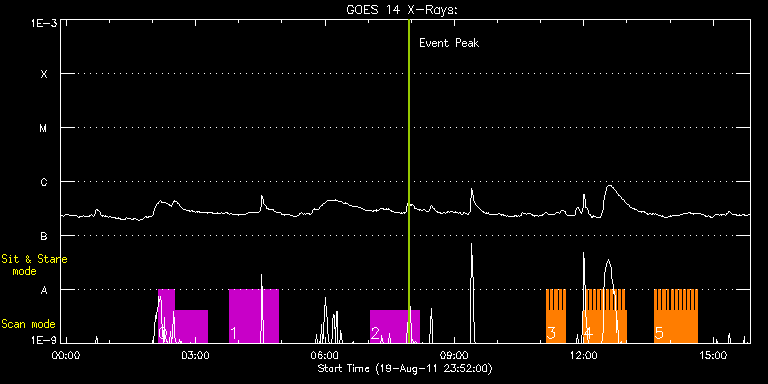 EIS Observation timeline overlay to GOES-Xray curve Code 1" 2" 40" 266" EIS Observations list for this event: STUDY ACRONYM ID DATE OBSERVED DESCRIPTION NOAA# TARGET 0 VHH_SlowAR_1h12_V2 | 23899 | 2011/08/20 02:08:13 | Multiple scans of active region | 1271 | Active Region TIMELINE ID DATE OBSERVED FITS FILE XCEN (+W/-E) YCEN (+N/-S) DUR ----------------------------------------------------------------------------------------------------------------- 23899 | 2011/08/20 02:08:13.000 | eis_l0_20110820_020813.fits.gz | -359.96 | 185.71 | 22m8s 23899 | 2011/08/20 02:30:54.000 | eis_l0_20110820_023054.fits.gz | -356.95 | 185.55 | 45m23s 1 VHH_SlowAR_1h12_V2 | 23900 | 2011/08/20 03:46:43 | Multiple scans of active region | 1271 | Active Region TIMELINE ID DATE OBSERVED FITS FILE XCEN (+W/-E) YCEN (+N/-S) DUR ----------------------------------------------------------------------------------------------------------------- 23900 | 2011/08/20 03:46:43.000 | eis_l0_20110820_034643.fits.gz | -346.52 | 185.01 | 1h8m4s 2 VHH_SlowAR_1h12_V2 | 23901 | 2011/08/20 07:03:43 | Multiple scans of active region | 1271 | Active Region TIMELINE ID DATE OBSERVED FITS FILE XCEN (+W/-E) YCEN (+N/-S) DUR ----------------------------------------------------------------------------------------------------------------- 23901 | 2011/08/20 07:03:43.000 | eis_l0_20110820_070343.fits.gz | -319.40 | 183.78 | 1h8m5s 3 HH_Flare_180x152f | 23978 | 2011/08/20 11:08:35 | AR117271 flare obs | | Flare TIMELINE ID DATE OBSERVED FITS FILE XCEN (+W/-E) YCEN (+N/-S) DUR ----------------------------------------------------------------------------------------------------------------- 23978 | 2011/08/20 11:08:35.000 | eis_l0_20110820_110835.fits.gz | -278.26 | 137.23 | 2m48s 23978 | 2011/08/20 11:11:26.000 | eis_l0_20110820_111126.fits.gz | -277.87 | 137.15 | 2m48s 23978 | 2011/08/20 11:14:17.000 | eis_l0_20110820_111417.fits.gz | -277.56 | 137.23 | 2m48s 23978 | 2011/08/20 11:17:08.000 | eis_l0_20110820_111708.fits.gz | -277.10 | 137.23 | 2m48s 23978 | 2011/08/20 11:19:59.000 | eis_l0_20110820_111959.fits.gz | -276.64 | 137.23 | 2m48s 23978 | 2011/08/20 11:22:50.000 | eis_l0_20110820_112250.fits.gz | -276.25 | 137.23 | 2m48s 23978 | 2011/08/20 11:25:41.000 | eis_l0_20110820_112541.fits.gz | -275.86 | 137.00 | 2m47s 23978 | 2011/08/20 11:28:31.000 | eis_l0_20110820_112831.fits.gz | -275.40 | 137.15 | 2m48s 23978 | 2011/08/20 11:31:22.000 | eis_l0_20110820_113122.fits.gz | -275.09 | 137.15 | 2m48s 4 HH_Flare_180x152f | 23954 | 2011/08/20 11:59:47 | AR11271 flare obs | | Flare TIMELINE ID DATE OBSERVED FITS FILE XCEN (+W/-E) YCEN (+N/-S) DUR ----------------------------------------------------------------------------------------------------------------- 23954 | 2011/08/20 11:59:47.000 | eis_l0_20110820_115947.fits.gz | -271.15 | 136.92 | 2m47s 23954 | 2011/08/20 12:02:37.000 | eis_l0_20110820_120237.fits.gz | -270.69 | 137.00 | 2m47s 23954 | 2011/08/20 12:05:27.000 | eis_l0_20110820_120527.fits.gz | -270.30 | 137.08 | 2m48s 23954 | 2011/08/20 12:08:18.000 | eis_l0_20110820_120818.fits.gz | -269.84 | 136.85 | 2m48s 23954 | 2011/08/20 12:11:09.000 | eis_l0_20110820_121109.fits.gz | -269.45 | 137.00 | 2m48s 23954 | 2011/08/20 12:13:59.000 | eis_l0_20110820_121359.fits.gz | -269.07 | 136.92 | 2m49s 23954 | 2011/08/20 12:16:50.000 | eis_l0_20110820_121650.fits.gz | -268.68 | 136.92 | 2m49s 23954 | 2011/08/20 12:19:42.000 | eis_l0_20110820_121942.fits.gz | -268.29 | 136.77 | 2m47s 23954 | 2011/08/20 12:22:32.000 | eis_l0_20110820_122232.fits.gz | -267.91 | 136.85 | 2m48s 23954 | 2011/08/20 12:25:22.000 | eis_l0_20110820_122522.fits.gz | -267.37 | 136.69 | 2m49s 23954 | 2011/08/20 12:28:13.000 | eis_l0_20110820_122813.fits.gz | -267.14 | 136.85 | 2m48s 23954 | 2011/08/20 12:31:04.000 | eis_l0_20110820_123104.fits.gz | -266.67 | 136.69 | 2m48s 23954 | 2011/08/20 12:33:54.000 | eis_l0_20110820_123354.fits.gz | -266.29 | 136.69 | 2m49s 23954 | 2011/08/20 12:36:46.000 | eis_l0_20110820_123646.fits.gz | -265.98 | 136.92 | 2m47s 23954 | 2011/08/20 12:39:36.000 | eis_l0_20110820_123936.fits.gz | -265.44 | 136.85 | 2m48s 23954 | 2011/08/20 12:42:27.000 | eis_l0_20110820_124227.fits.gz | -265.05 | 136.77 | 2m48s 23954 | 2011/08/20 12:45:18.000 | eis_l0_20110820_124518.fits.gz | -264.66 | 136.77 | 2m48s 23954 | 2011/08/20 12:48:08.000 | eis_l0_20110820_124808.fits.gz | -264.28 | 136.69 | 2m49s 23954 | 2011/08/20 12:50:59.000 | eis_l0_20110820_125059.fits.gz | -263.89 | 136.62 | 2m49s 23954 | 2011/08/20 12:53:50.000 | eis_l0_20110820_125350.fits.gz | -263.43 | 136.62 | 2m48s 23954 | 2011/08/20 12:56:41.000 | eis_l0_20110820_125641.fits.gz | -263.04 | 136.69 | 2m48s 5 HH_Flare_180x152f | 23955 | 2011/08/20 13:38:51 | AR11271 flare obs | | Flare TIMELINE ID DATE OBSERVED FITS FILE XCEN (+W/-E) YCEN (+N/-S) DUR ----------------------------------------------------------------------------------------------------------------- 23955 | 2011/08/20 13:38:51.000 | eis_l0_20110820_133851.fits.gz | -257.09 | 136.46 | 2m48s 23955 | 2011/08/20 13:41:42.000 | eis_l0_20110820_134142.fits.gz | -256.71 | 136.54 | 2m49s 23955 | 2011/08/20 13:44:33.000 | eis_l0_20110820_134433.fits.gz | -256.24 | 136.31 | 2m49s 23955 | 2011/08/20 13:47:24.000 | eis_l0_20110820_134724.fits.gz | -255.93 | 136.38 | 2m49s 23955 | 2011/08/20 13:50:15.000 | eis_l0_20110820_135015.fits.gz | -255.47 | 136.31 | 2m48s 23955 | 2011/08/20 13:53:06.000 | eis_l0_20110820_135306.fits.gz | -255.16 | 136.31 | 2m48s 23955 | 2011/08/20 13:55:57.000 | eis_l0_20110820_135557.fits.gz | -254.70 | 136.31 | 2m13s 23955 | 2011/08/20 13:59:15.000 | eis_l0_20110820_135915.fits.gz | -254.24 | 136.31 | 2m20s 23955 | 2011/08/20 14:01:38.000 | eis_l0_20110820_140138.fits.gz | -253.93 | 136.38 | 2m48s 23955 | 2011/08/20 14:04:29.000 | eis_l0_20110820_140429.fits.gz | -253.46 | 136.15 | 2m48s 23955 | 2011/08/20 14:07:19.000 | eis_l0_20110820_140719.fits.gz | -253.15 | 136.23 | 2m48s 23955 | 2011/08/20 14:10:10.000 | eis_l0_20110