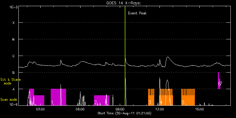 EIS Observation timeline overlay to GOES-Xray curve Code 1" 2" 40" 266" EIS Observations list for this event: STUDY ACRONYM ID DATE OBSERVED DESCRIPTION NOAA# TARGET 0 VHH_SlowAR_1h12_V2 | 23899 | 2011/08/20 02:08:13 | Multiple scans of active region | 1271 | Active Region TIMELINE ID DATE OBSERVED FITS FILE XCEN (+W/-E) YCEN (+N/-S) DUR ----------------------------------------------------------------------------------------------------------------- 23899 | 2011/08/20 02:08:13.000 | eis_l0_20110820_020813.fits.gz | -359.96 | 185.71 | 22m8s 23899 | 2011/08/20 02:30:54.000 | eis_l0_20110820_023054.fits.gz | -356.95 | 185.55 | 45m23s 1 VHH_SlowAR_1h12_V2 | 23900 | 2011/08/20 03:46:43 | Multiple scans of active region | 1271 | Active Region TIMELINE ID DATE OBSERVED FITS FILE XCEN (+W/-E) YCEN (+N/-S) DUR ----------------------------------------------------------------------------------------------------------------- 23900 | 2011/08/20 03:46:43.000 | eis_l0_20110820_034643.fits.gz | -346.52 | 185.01 | 1h8m4s 2 VHH_SlowAR_1h12_V2 | 23901 | 2011/08/20 07:03:43 | Multiple scans of active region | 1271 | Active Region TIMELINE ID DATE OBSERVED FITS FILE XCEN (+W/-E) YCEN (+N/-S) DUR ----------------------------------------------------------------------------------------------------------------- 23901 | 2011/08/20 07:03:43.000 | eis_l0_20110820_070343.fits.gz | -319.40 | 183.78 | 1h8m5s 3 HH_Flare_180x152f | 23978 | 2011/08/20 11:08:35 | AR117271 flare obs | | Flare TIMELINE ID DATE OBSERVED FITS FILE XCEN (+W/-E) YCEN (+N/-S) DUR ----------------------------------------------------------------------------------------------------------------- 23978 | 2011/08/20 11:08:35.000 | eis_l0_20110820_110835.fits.gz | -278.26 | 137.23 | 2m48s 23978 | 2011/08/20 11:11:26.000 | eis_l0_20110820_111126.fits.gz | -277.87 | 137.15 | 2m48s 23978 | 2011/08/20 11:14:17.000 | eis_l0_20110820_111417.fits.gz | -277.56 | 137.23 | 2m48s 23978 | 2011/08/20 11:17:08.000 | eis_l0_20110820_111708.fits.gz | -277.10 | 137.23 | 2m48s 23978 | 2011/08/20 11:19:59.000 | eis_l0_20110820_111959.fits.gz | -276.64 | 137.23 | 2m48s 23978 | 2011/08/20 11:22:50.000 | eis_l0_20110820_112250.fits.gz | -276.25 | 137.23 | 2m48s 23978 | 2011/08/20 11:25:41.000 | eis_l0_20110820_112541.fits.gz | -275.86 | 137.00 | 2m47s 23978 | 2011/08/20 11:28:31.000 | eis_l0_20110820_112831.fits.gz | -275.40 | 137.15 | 2m48s 23978 | 2011/08/20 11:31:22.000 | eis_l0_20110820_113122.fits.gz | -275.09 | 137.15 | 2m48s 4 HH_Flare_180x152f | 23954 | 2011/08/20 11:59:47 | AR11271 flare obs | | Flare TIMELINE ID DATE OBSERVED FITS FILE XCEN (+W/-E) YCEN (+N/-S) DUR ----------------------------------------------------------------------------------------------------------------- 23954 | 2011/08/20 11:59:47.000 | eis_l0_20110820_115947.fits.gz | -271.15 | 136.92 | 2m47s 23954 | 2011/08/20 12:02:37.000 | eis_l0_20110820_120237.fits.gz | -270.69 | 137.00 | 2m47s 23954 | 2011/08/20 12:05:27.000 | eis_l0_20110820_120527.fits.gz | -270.30 | 137.08 | 2m48s 23954 | 2011/08/20 12:08:18.000 | eis_l0_20110820_120818.fits.gz | -269.84 | 136.85 | 2m48s 23954 | 2011/08/20 12:11:09.000 | eis_l0_20110820_121109.fits.gz | -269.45 | 137.00 | 2m48s 23954 | 2011/08/20 12:13:59.000 | eis_l0_20110820_121359.fits.gz | -269.07 | 136.92 | 2m49s 23954 | 2011/08/20 12:16:50.000 | eis_l0_20110820_121650.fits.gz | -268.68 | 136.92 | 2m49s 23954 | 2011/08/20 12:19:42.000 | eis_l0_20110820_121942.fits.gz | -268.29 | 136.77 | 2m47s 23954 | 2011/08/20 12:22:32.000 | eis_l0_20110820_122232.fits.gz | -267.91 | 136.85 | 2m48s 23954 | 2011/08/20 12:25:22.000 | eis_l0_20110820_122522.fits.gz | -267.37 | 136.69 | 2m49s 23954 | 2011/08/20 12:28:13.000 | eis_l0_20110820_122813.fits.gz | -267.14 | 136.85 | 2m48s 23954 | 2011/08/20 12:31:04.000 | eis_l0_20110820_123104.fits.gz | -266.67 | 136.69 | 2m48s 23954 | 2011/08/20 12:33:54.000 | eis_l0_20110820_123354.fits.gz | -266.29 | 136.69 | 2m49s 23954 | 2011/08/20 12:36:46.000 | eis_l0_20110820_123646.fits.gz | -265.98 | 136.92 | 2m47s 23954 | 2011/08/20 12:39:36.000 | eis_l0_20110820_123936.fits.gz | -265.44 | 136.85 | 2m48s 23954 | 2011/08/20 12:42:27.000 | eis_l0_20110820_124227.fits.gz | -265.05 | 136.77 | 2m48s 23954 | 2011/08/20 12:45:18.000 | eis_l0_20110820_124518.fits.gz | -264.66 | 136.77 | 2m48s 23954 | 2011/08/20 12:48:08.000 | eis_l0_20110820_124808.fits.gz | -264.28 | 136.69 | 2m49s 23954 | 2011/08/20 12:50:59.000 | eis_l0_20110820_125059.fits.gz | -263.89 | 136.62 | 2m49s 23954 | 2011/08/20 12:53:50.000 | eis_l0_20110820_125350.fits.gz | -263.43 | 136.62 | 2m48s 23954 | 2011/08/20 12:56:41.000 | eis_l0_20110820_125641.fits.gz | -263.04 | 136.69 | 2m48s 5 HH_Flare_180x152f | 23955 | 2011/08/20 13:38:51 | AR11271 flare obs | | Flare TIMELINE ID DATE OBSERVED FITS FILE XCEN (+W/-E) YCEN (+N/-S) DUR ----------------------------------------------------------------------------------------------------------------- 23955 | 2011/08/20 13:38:51.000 | eis_l0_20110820_133851.fits.gz | -257.09 | 136.46 | 2m48s 23955 | 2011/08/20 13:41:42.000 | eis_l0_20110820_134142.fits.gz | -256.71 | 136.54 | 2m49s 23955 | 2011/08/20 13:44:33.000 | eis_l0_20110820_134433.fits.gz | -256.24 | 136.31 | 2m49s 23955 | 2011/08/20 13:47:24.000 | eis_l0_20110820_134724.fits.gz | -255.93 | 136.38 | 2m49s 23955 | 2011/08/20 13:50:15.000 | eis_l0_20110820_135015.fits.gz | -255.47 | 136.31 | 2m48s 23955 | 2011/08/20 13:53:06.000 | eis_l0_20110820_135306.fits.gz | -255.16 | 136.31 | 2m48s 23955 | 2011/08/20 13:55:57.000 | eis_l0_20110820_135557.fits.gz | -254.70 | 136.31 | 2m13s 23955 | 2011/08/20 13:59:15.000 | eis_l0_20110820_135915.fits.gz | -254.24 | 136.31 | 2m20s 23955 | 2011/08/20 14:01:38.000 | eis_l0_20110820_140138.fits.gz | -253.93 | 136.38 | 2m48s 23955 | 2011/08/20 14:04:29.000 | eis_l0_20110820_140429.fits.gz | -253.46 | 136.15 | 2m48s 23955 | 2011/08/20 14:07:19.000 | eis_l0_20110820_140719.fits.gz | -253.15 | 136.23 | 2m48s 23955 | 2011/08/20 14:10:10.000 | eis_l0_20110
