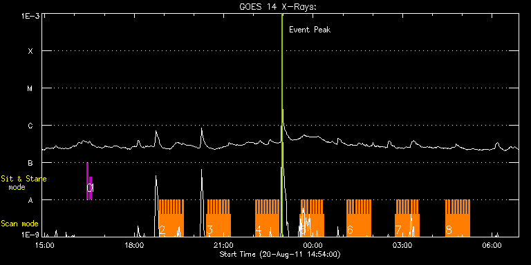EIS Observation timeline overlay to GOES-Xray curve Code 1" 2" 40" 266" EIS Observations list for this event: STUDY ACRONYM ID DATE OBSERVED DESCRIPTION NOAA# TARGET 0 regcal071 | 23907 | 2011/08/20 16:24:12 | Dark exposures, CCD bottom rows (100s | | Engineering TIMELINE ID DATE OBSERVED FITS FILE XCEN (+W/-E) YCEN (+N/-S) DUR ----------------------------------------------------------------------------------------------------------------- 23907 | 2011/08/20 16:24:12.000 | eis_l0_20110820_162412.fits.gz | -216.77 | -169.47 | 3m22s 1 regcal072 | 23908 | 2011/08/20 16:30:12 | Dark exposures, top CCD rows (100s exp | | Engineering TIMELINE ID DATE OBSERVED FITS FILE XCEN (+W/-E) YCEN (+N/-S) DUR ----------------------------------------------------------------------------------------------------------------- 23908 | 2011/08/20 16:30:12.000 | eis_l0_20110820_163012.fits.gz | -215.92 | 341.53 | 3m22s 2 HH_Flare_180x152f | 23956 | 2011/08/20 18:50:13 | AR11271 flare obs | 1271 | Flare TIMELINE ID DATE OBSERVED FITS FILE XCEN (+W/-E) YCEN (+N/-S) DUR ----------------------------------------------------------------------------------------------------------------- 23956 | 2011/08/20 18:50:13.000 | eis_l0_20110820_185013.fits.gz | -212.75 | 134.91 | 2m49s 23956 | 2011/08/20 18:53:04.000 | eis_l0_20110820_185304.fits.gz | -212.44 | 134.84 | 2m49s 23956 | 2011/08/20 18:55:56.000 | eis_l0_20110820_185556.fits.gz | -211.98 | 134.91 | 2m47s 23956 | 2011/08/20 18:58:46.000 | eis_l0_20110820_185846.fits.gz | -211.52 | 134.91 | 2m48s 23956 | 2011/08/20 19:01:37.000 | eis_l0_20110820_190137.fits.gz | -211.21 | 134.91 | 2m47s 23956 | 2011/08/20 19:04:27.000 | eis_l0_20110820_190427.fits.gz | -210.82 | 134.84 | 2m48s 23956 | 2011/08/20 19:07:18.000 | eis_l0_20110820_190718.fits.gz | -210.28 | 134.84 | 2m48s 23956 | 2011/08/20 19:10:09.000 | eis_l0_20110820_191009.fits.gz | -209.90 | 134.76 | 2m48s 23956 | 2011/08/20 19:13:00.000 | eis_l0_20110820_191300.fits.gz | -209.51 | 134.84 | 2m48s 23956 | 2011/08/20 19:15:50.000 | eis_l0_20110820_191550.fits.gz | -209.20 | 134.76 | 2m48s 23956 | 2011/08/20 19:18:41.000 | eis_l0_20110820_191841.fits.gz | -208.74 | 134.68 | 2m48s 23956 | 2011/08/20 19:21:32.000 | eis_l0_20110820_192132.fits.gz | -208.35 | 134.68 | 2m48s 23956 | 2011/08/20 19:24:22.000 | eis_l0_20110820_192422.fits.gz | -207.96 | 134.76 | 2m48s 23956 | 2011/08/20 19:27:13.000 | eis_l0_20110820_192713.fits.gz | -207.50 | 134.76 | 2m48s 23956 | 2011/08/20 19:30:04.000 | eis_l0_20110820_193004.fits.gz | -207.19 | 134.84 | 2m42s 23956 | 2011/08/20 19:32:55.000 | eis_l0_20110820_193255.fits.gz | -206.65 | 134.76 | 2m48s 23956 | 2011/08/20 19:35:45.000 | eis_l0_20110820_193545.fits.gz | -206.26 | 134.76 | 2m49s 3 HH_Flare_180x152f | 23957 | 2011/08/20 20:25:13 | AR11271 flare obs | 1271 | Flare TIMELINE ID DATE OBSERVED FITS FILE XCEN (+W/-E) YCEN (+N/-S) DUR ----------------------------------------------------------------------------------------------------------------- 23957 | 2011/08/20 20:25:13.000 | eis_l0_20110820_202513.fits.gz | -199.24 | 134.68 | 2m48s 23957 | 2011/08/20 20:28:04.000 | eis_l0_20110820_202804.fits.gz | -198.77 | 134.61 | 2m49s 23957 | 2011/08/20 20:30:56.000 | eis_l0_20110820_203056.fits.gz | -198.38 | 134.61 | 2m48s 23957 | 2011/08/20 20:33:46.000 | eis_l0_20110820_203346.fits.gz | -197.92 | 134.53 | 2m48s 23957 | 2011/08/20 20:36:37.000 | eis_l0_20110820_203637.fits.gz | -197.54 | 134.53 | 2m48s 23957 | 2011/08/20 20:39:28.000 | eis_l0_20110820_203928.fits.gz | -197.07 | 134.30 | 2m48s 23957 | 2011/08/20 20:42:18.000 | eis_l0_20110820_204218.fits.gz | -196.76 | 134.53 | 2m48s 23957 | 2011/08/20 20:45:09.000 | eis_l0_20110820_204509.fits.gz | -196.30 | 134.37 | 2m48s 23957 | 2011/08/20 20:48:00.000 | eis_l0_20110820_204800.fits.gz | -195.91 | 134.37 | 2m48s 23957 | 2011/08/20 20:50:51.000 | eis_l0_20110820_205051.fits.gz | -195.53 | 134.37 | 2m48s 23957 | 2011/08/20 20:53:42.000 | eis_l0_20110820_205342.fits.gz | -194.99 | 134.22 | 2m48s 23957 | 2011/08/20 20:56:32.000 | eis_l0_20110820_205632.fits.gz | -194.68 | 134.30 | 2m49s 23957 | 2011/08/20 20:59:24.000 | eis_l0_20110820_205924.fits.gz | -194.29 | 134.37 | 2m47s 23957 | 2011/08/20 21:02:14.000 | eis_l0_20110820_210214.fits.gz | -193.83 | 134.37 | 2m48s 23957 | 2011/08/20 21:05:05.000 | eis_l0_20110820_210505.fits.gz | -193.52 | 134.37 | 2m48s 23957 | 2011/08/20 21:07:56.000 | eis_l0_20110820_210756.fits.gz | -192.98 | 134.37 | 2m47s 23957 | 2011/08/20 21:10:46.000 | eis_l0_20110820_211046.fits.gz | -192.59 | 134.37 | 2m48s 4 HH_Flare_180x152f | 23958 | 2011/08/20 22:03:13 | AR11271 flare obs | 1271 | Flare TIMELINE ID DATE OBSERVED FITS FILE XCEN (+W/-E) YCEN (+N/-S) DUR ----------------------------------------------------------------------------------------------------------------- 23958 | 2011/08/20 22:03:13.000 | eis_l0_20110820_220313.fits.gz | -185.02 | 134.14 | 2m48s 23958 | 2011/08/20 22:06:04.000 | eis_l0_20110820_220604.fits.gz | -184.63 | 134.22 | 2m47s 23958 | 2011/08/20 22:08:54.000 | eis_l0_20110820_220854.fits.gz | -184.25 | 134.07 | 2m48s 23958 | 2011/08/20 22:11:45.000 | eis_l0_20110820_221145.fits.gz | -183.79 | 133.99 | 2m47s 23958 | 2011/08/20 22:14:35.000 | eis_l0_20110820_221435.fits.gz | -183.40 | 134.07 | 2m48s 23958 | 2011/08/20 22:17:26.000 | eis_l0_20110820_221726.fits.gz | -183.01 | 134.07 | 2m48s 23958 | 2011/08/20 22:20:16.000 | eis_l0_20110820_222016.fits.gz | -182.55 | 133.99 | 2m48s 23958 | 2011/08/20 22:23:07.000 | eis_l0_20110820_222307.fits.gz | -182.16 | 134.07 | 2m48s 23958 | 2011/08/20 22:25:58.000 | eis_l0_20110820_222558.fits.gz | -181.70 | 133.91 | 2m48s 23958 | 2011/08/20 22:28:49.000 | eis_l0_20110820_222849.fits.gz | -181.39 | 133.99 | 2m48s 23958 | 2011/08/20 22:31:40.000 | eis_l0_20110820_223140.fits.gz | -181.00 | 134.07 | 2m48s 23958 | 2011/08/20 22:34:31.000 | eis_l0_20110820_223431.fits.gz | -180.54 | 133.99 | 2m47s 23958 | 2011/08/20 22:37:21.000 | eis_l0_20110820_223721.fits.gz 