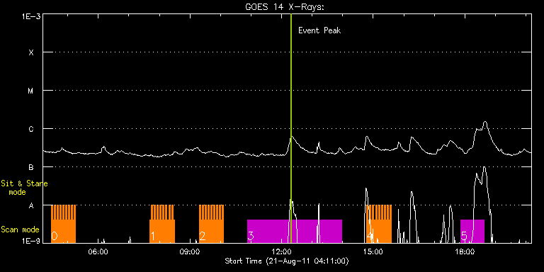 EIS Observation timeline overlay to GOES-Xray curve Code 1" 2" 40" 266" EIS Observations list for this event: STUDY ACRONYM ID DATE OBSERVED DESCRIPTION NOAA# TARGET 0 HH_Flare_180x152f | 23962 | 2011/08/21 04:27:01 | AR11271 flare obs | 1271 | Flare TIMELINE ID DATE OBSERVED FITS FILE XCEN (+W/-E) YCEN (+N/-S) DUR ----------------------------------------------------------------------------------------------------------------- 23962 | 2011/08/21 04:27:01.000 | eis_l0_20110821_042701.fits.gz | -129.25 | 132.75 | 2m48s 23962 | 2011/08/21 04:29:51.000 | eis_l0_20110821_042951.fits.gz | -128.86 | 132.83 | 2m48s 23962 | 2011/08/21 04:32:42.000 | eis_l0_20110821_043242.fits.gz | -128.55 | 132.83 | 2m48s 23962 | 2011/08/21 04:35:33.000 | eis_l0_20110821_043533.fits.gz | -128.17 | 132.83 | 2m48s 23962 | 2011/08/21 04:38:24.000 | eis_l0_20110821_043824.fits.gz | -127.63 | 132.91 | 2m49s 23962 | 2011/08/21 04:41:16.000 | eis_l0_20110821_044116.fits.gz | -127.32 | 132.83 | 2m48s 23962 | 2011/08/21 04:44:07.000 | eis_l0_20110821_044407.fits.gz | -126.85 | 132.83 | 2m48s 23962 | 2011/08/21 04:46:58.000 | eis_l0_20110821_044658.fits.gz | -126.47 | 132.83 | 2m48s 23962 | 2011/08/21 04:49:49.000 | eis_l0_20110821_044949.fits.gz | -126.08 | 132.75 | 2m48s 23962 | 2011/08/21 04:52:39.000 | eis_l0_20110821_045239.fits.gz | -125.62 | 132.83 | 2m49s 23962 | 2011/08/21 04:55:31.000 | eis_l0_20110821_045531.fits.gz | -125.23 | 132.83 | 2m48s 23962 | 2011/08/21 04:58:21.000 | eis_l0_20110821_045821.fits.gz | -124.85 | 132.68 | 2m48s 23962 | 2011/08/21 05:01:12.000 | eis_l0_20110821_050112.fits.gz | -124.38 | 132.60 | 2m48s 23962 | 2011/08/21 05:04:02.000 | eis_l0_20110821_050402.fits.gz | -123.92 | 132.75 | 2m49s 23962 | 2011/08/21 05:06:53.000 | eis_l0_20110821_050653.fits.gz | -123.61 | 132.68 | 2m48s 23962 | 2011/08/21 05:09:44.000 | eis_l0_20110821_050944.fits.gz | -123.15 | 132.75 | 2m48s 23962 | 2011/08/21 05:12:35.000 | eis_l0_20110821_051235.fits.gz | -122.68 | 132.60 | 2m48s 1 HH_Flare_180x152f | 23964 | 2011/08/21 07:41:04 | AR11271 flare obs | 1271 | Flare TIMELINE ID DATE OBSERVED FITS FILE XCEN (+W/-E) YCEN (+N/-S) DUR ----------------------------------------------------------------------------------------------------------------- 23964 | 2011/08/21 07:41:04.000 | eis_l0_20110821_074104.fits.gz | -100.98 | 132.29 | 2m48s 23964 | 2011/08/21 07:43:55.000 | eis_l0_20110821_074355.fits.gz | -100.74 | 132.44 | 2m47s 23964 | 2011/08/21 07:46:45.000 | eis_l0_20110821_074645.fits.gz | -100.20 | 132.37 | 2m48s 23964 | 2011/08/21 07:49:36.000 | eis_l0_20110821_074936.fits.gz | -99.82 | 132.29 | 2m47s 23964 | 2011/08/21 07:52:26.000 | eis_l0_20110821_075226.fits.gz | -99.35 | 132.29 | 2m48s 23964 | 2011/08/21 07:55:17.000 | eis_l0_20110821_075517.fits.gz | -98.89 | 132.21 | 2m48s 23964 | 2011/08/21 07:58:08.000 | eis_l0_20110821_075808.fits.gz | -98.50 | 132.13 | 2m48s 23964 | 2011/08/21 08:00:59.000 | eis_l0_20110821_080059.fits.gz | -98.12 | 132.37 | 2m48s 23964 | 2011/08/21 08:03:50.000 | eis_l0_20110821_080350.fits.gz | -97.73 | 132.29 | 2m47s 23964 | 2011/08/21 08:06:40.000 | eis_l0_20110821_080640.fits.gz | -97.27 | 132.29 | 2m48s 23964 | 2011/08/21 08:09:31.000 | eis_l0_20110821_080931.fits.gz | -96.88 | 132.29 | 2m47s 23964 | 2011/08/21 08:12:21.000 | eis_l0_20110821_081221.fits.gz | -96.42 | 132.21 | 2m48s 23964 | 2011/08/21 08:15:12.000 | eis_l0_20110821_081512.fits.gz | -96.03 | 132.13 | 2m48s 23964 | 2011/08/21 08:18:03.000 | eis_l0_20110821_081803.fits.gz | -95.65 | 132.21 | 2m48s 23964 | 2011/08/21 08:20:54.000 | eis_l0_20110821_082054.fits.gz | -95.18 | 132.21 | 2m48s 23964 | 2011/08/21 08:23:45.000 | eis_l0_20110821_082345.fits.gz | -94.80 | 132.13 | 2m47s 23964 | 2011/08/21 08:26:35.000 | eis_l0_20110821_082635.fits.gz | -94.41 | 132.21 | 2m48s 2 HH_Flare_180x152f | 23965 | 2011/08/21 09:18:06 | AR11271 flare obs | 1271 | Flare TIMELINE ID DATE OBSERVED FITS FILE XCEN (+W/-E) YCEN (+N/-S) DUR ----------------------------------------------------------------------------------------------------------------- 23965 | 2011/08/21 09:18:06.000 | eis_l0_20110821_091806.fits.gz | -86.84 | 132.13 | 2m48s 23965 | 2011/08/21 09:20:57.000 | eis_l0_20110821_092057.fits.gz | -86.38 | 132.29 | 2m49s 23965 | 2011/08/21 09:23:48.000 | eis_l0_20110821_092348.fits.gz | -85.99 | 132.21 | 2m49s 23965 | 2011/08/21 09:26:40.000 | eis_l0_20110821_092640.fits.gz | -85.60 | 132.21 | 2m48s 23965 | 2011/08/21 09:29:30.000 | eis_l0_20110821_092930.fits.gz | -85.06 | 132.13 | 2m48s 23965 | 2011/08/21 09:32:21.000 | eis_l0_20110821_093221.fits.gz | -84.75 | 132.13 | 2m48s 23965 | 2011/08/21 09:35:11.000 | eis_l0_20110821_093511.fits.gz | -84.37 | 132.21 | 2m49s 23965 | 2011/08/21 09:38:02.000 | eis_l0_20110821_093802.fits.gz | -83.90 | 132.06 | 2m48s 23965 | 2011/08/21 09:40:53.000 | eis_l0_20110821_094053.fits.gz | -83.36 | 131.90 | 2m48s 23965 | 2011/08/21 09:43:44.000 | eis_l0_20110821_094344.fits.gz | -83.05 | 132.13 | 2m48s 23965 | 2011/08/21 09:46:35.000 | eis_l0_20110821_094635.fits.gz | -82.51 | 131.98 | 2m47s 23965 | 2011/08/21 09:49:25.000 | eis_l0_20110821_094925.fits.gz | -82.20 | 131.90 | 2m48s 23965 | 2011/08/21 09:52:16.000 | eis_l0_20110821_095216.fits.gz | -81.90 | 131.98 | 2m48s 23965 | 2011/08/21 09:55:07.000 | eis_l0_20110821_095507.fits.gz | -81.36 | 131.98 | 2m47s 23965 | 2011/08/21 09:57:57.000 | eis_l0_20110821_095757.fits.gz | -81.05 | 132.13 | 2m48s 23965 | 2011/08/21 10:00:47.000 | eis_l0_20110821_100047.fits.gz | -80.51 | 131.98 | 2m48s 23965 | 2011/08/21 10:03:38.000 | eis_l0_20110821_100338.fits.gz | -80.20 | 131.98 | 2m48s 3 HPW021_VEL_360x512v1 | 23909 | 2011/08/21 10:52:51 | AR11271 flare obs | 1271 | Active Region TIMELINE ID DATE OBSERVED FITS FILE XCEN (+W/-E) YCEN (+N/-S) DUR ----------------------------------------------------------------------------------------------------------------- 23909 | 2011/08/21 10:52:51.000 | eis_l0_20110821_105251.fits.gz | -70.95 | 131.98 | 3h5m43s 4 HH_Flar
