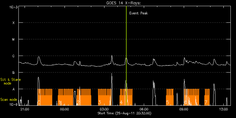 EIS Observation timeline overlay to GOES-Xray curve Code 1" 2" 40" 266" EIS Observations list for this event: STUDY ACRONYM ID DATE OBSERVED DESCRIPTION NOAA# TARGET 0 HH_Flare_180x152f | 24014 | 2011/08/25 21:58:13 | AR 11271 flare obs | 1271 | Flare TIMELINE ID DATE OBSERVED FITS FILE XCEN (+W/-E) YCEN (+N/-S) DUR ----------------------------------------------------------------------------------------------------------------- 24014 | 2011/08/25 21:58:13.000 | eis_l0_20110825_215813.fits.gz | 722.79 | 202.10 | 2m48s 24014 | 2011/08/25 22:01:04.000 | eis_l0_20110825_220104.fits.gz | 722.94 | 202.10 | 2m48s 24014 | 2011/08/25 22:03:54.000 | eis_l0_20110825_220354.fits.gz | 723.17 | 202.17 | 2m49s 24014 | 2011/08/25 22:06:45.000 | eis_l0_20110825_220645.fits.gz | 723.41 | 202.25 | 2m48s 24014 | 2011/08/25 22:09:36.000 | eis_l0_20110825_220936.fits.gz | 723.71 | 202.25 | 2m47s 24014 | 2011/08/25 22:12:26.000 | eis_l0_20110825_221226.fits.gz | 723.87 | 202.40 | 2m49s 24014 | 2011/08/25 22:15:17.000 | eis_l0_20110825_221517.fits.gz | 724.18 | 202.25 | 2m48s 24014 | 2011/08/25 22:18:08.000 | eis_l0_20110825_221808.fits.gz | 724.41 | 202.33 | 2m48s 24014 | 2011/08/25 22:20:59.000 | eis_l0_20110825_222059.fits.gz | 724.72 | 202.40 | 2m48s 24014 | 2011/08/25 22:23:50.000 | eis_l0_20110825_222350.fits.gz | 724.95 | 202.48 | 2m48s 24014 | 2011/08/25 22:26:41.000 | eis_l0_20110825_222641.fits.gz | 725.26 | 202.48 | 2m48s 24014 | 2011/08/25 22:29:31.000 | eis_l0_20110825_222931.fits.gz | 725.41 | 202.56 | 2m48s 24014 | 2011/08/25 22:32:22.000 | eis_l0_20110825_223222.fits.gz | 725.72 | 202.56 | 2m48s 24014 | 2011/08/25 22:35:13.000 | eis_l0_20110825_223513.fits.gz | 725.95 | 202.64 | 2m47s 24014 | 2011/08/25 22:38:03.000 | eis_l0_20110825_223803.fits.gz | 726.26 | 202.64 | 2m48s 24014 | 2011/08/25 22:40:54.000 | eis_l0_20110825_224054.fits.gz | 726.49 | 202.64 | 2m48s 24014 | 2011/08/25 22:43:44.000 | eis_l0_20110825_224344.fits.gz | 726.65 | 202.87 | 2m48s 24014 | 2011/08/25 22:46:35.000 | eis_l0_20110825_224635.fits.gz | 726.88 | 202.87 | 2m48s 24014 | 2011/08/25 22:49:26.000 | eis_l0_20110825_224926.fits.gz | 727.27 | 202.79 | 2m48s 24014 | 2011/08/25 22:52:16.000 | eis_l0_20110825_225216.fits.gz | 727.42 | 202.95 | 2m48s 24014 | 2011/08/25 22:55:07.000 | eis_l0_20110825_225507.fits.gz | 727.73 | 202.87 | 2m48s 24014 | 2011/08/25 22:57:58.000 | eis_l0_20110825_225758.fits.gz | 727.96 | 203.02 | 2m47s 24014 | 2011/08/25 23:00:48.000 | eis_l0_20110825_230048.fits.gz | 728.12 | 203.10 | 2m48s 1 HH_Flare_180x152f | 24015 | 2011/08/25 23:30:13 | AR 11271 flare obs | 1271 | Flare TIMELINE ID DATE OBSERVED FITS FILE XCEN (+W/-E) YCEN (+N/-S) DUR ----------------------------------------------------------------------------------------------------------------- 24015 | 2011/08/25 23:30:13.000 | eis_l0_20110825_233013.fits.gz | 730.74 | 203.41 | 2m48s 24015 | 2011/08/25 23:33:04.000 | eis_l0_20110825_233304.fits.gz | 731.05 | 203.56 | 2m48s 24015 | 2011/08/25 23:35:54.000 | eis_l0_20110825_233554.fits.gz | 731.28 | 203.41 | 2m49s 24015 | 2011/08/25 23:38:46.000 | eis_l0_20110825_233846.fits.gz | 731.52 | 203.64 | 2m47s 24015 | 2011/08/25 23:41:36.000 | eis_l0_20110825_234136.fits.gz | 731.83 | 203.56 | 2m48s 24015 | 2011/08/25 23:44:27.000 | eis_l0_20110825_234427.fits.gz | 732.06 | 203.56 | 2m48s 24015 | 2011/08/25 23:47:17.000 | eis_l0_20110825_234717.fits.gz | 732.29 | 203.56 | 2m48s 24015 | 2011/08/25 23:50:08.000 | eis_l0_20110825_235008.fits.gz | 732.60 | 203.56 | 2m48s 24015 | 2011/08/25 23:52:59.000 | eis_l0_20110825_235259.fits.gz | 732.60 | 203.64 | 2m48s 24015 | 2011/08/25 23:55:50.000 | eis_l0_20110825_235550.fits.gz | 732.91 | 203.87 | 2m48s 24015 | 2011/08/25 23:58:40.000 | eis_l0_20110825_235840.fits.gz | 733.37 | 203.64 | 2m48s 24015 | 2011/08/26 00:01:31.000 | eis_l0_20110826_000131.fits.gz | 733.53 | 203.79 | 2m48s 24015 | 2011/08/26 00:04:22.000 | eis_l0_20110826_000422.fits.gz | 733.76 | 203.79 | 2m47s 24015 | 2011/08/26 00:07:12.000 | eis_l0_20110826_000712.fits.gz | 734.07 | 203.87 | 2m49s 24015 | 2011/08/26 00:10:03.000 | eis_l0_20110826_001003.fits.gz | 734.30 | 203.95 | 2m48s 24015 | 2011/08/26 00:12:54.000 | eis_l0_20110826_001254.fits.gz | 734.53 | 204.10 | 2m47s 24015 | 2011/08/26 00:15:44.000 | eis_l0_20110826_001544.fits.gz | 734.76 | 204.03 | 2m49s 24015 | 2011/08/26 00:18:35.000 | eis_l0_20110826_001835.fits.gz | 734.99 | 204.03 | 2m48s 24015 | 2011/08/26 00:21:26.000 | eis_l0_20110826_002126.fits.gz | 735.30 | 204.10 | 2m48s 24015 | 2011/08/26 00:24:17.000 | eis_l0_20110826_002417.fits.gz | 735.46 | 204.26 | 2m48s 24015 | 2011/08/26 00:27:08.000 | eis_l0_20110826_002708.fits.gz | 735.77 | 204.26 | 2m48s 24015 | 2011/08/26 00:29:59.000 | eis_l0_20110826_002959.fits.gz | 736.00 | 204.18 | 2m48s 24015 | 2011/08/26 00:32:49.000 | eis_l0_20110826_003249.fits.gz | 736.23 | 204.26 | 2m48s 24015 | 2011/08/26 00:35:40.000 | eis_l0_20110826_003540.fits.gz | 736.38 | 204.34 | 2m48s 2 HH_Flare_180x152f | 24016 | 2011/08/26 00:55:13 | AR 11271 flare obs | 1271 | Flare TIMELINE ID DATE OBSERVED FITS FILE XCEN (+W/-E) YCEN (+N/-S) DUR ----------------------------------------------------------------------------------------------------------------- 24016 | 2011/08/26 00:55:13.000 | eis_l0_20110826_005513.fits.gz | 738.16 | 204.57 | 2m49s 24016 | 2011/08/26 00:58:05.000 | eis_l0_20110826_005805.fits.gz | 738.39 | 204.64 | 2m48s 24016 | 2011/08/26 01:00:56.000 | eis_l0_20110826_010056.fits.gz | 738.70 | 204.72 | 2m48s 24016 | 2011/08/26 01:03:47.000 | eis_l0_20110826_010347.fits.gz | 738.93 | 204.72 | 2m48s 24016 | 2011/08/26 01:06:38.000 | eis_l0_20110826_010638.fits.gz | 739.16 | 204.88 | 2m48s 24016 | 2011/08/26 01:09:29.000 | eis_l0_20110826_010929.fits.gz | 739.47 | 204.80 | 2m47s 24016 | 2011/08/26 01:12:19.000 | eis_l0_20110826_011219.fits.gz | 739.70 | 204.88 | 2m48s 24016 | 2011/08/26 01:15:10.000 | eis_l0_20110826_011510.fits.gz | 739.94 | 204.95 | 2m48s 24016 | 2011/08/26 01:18:00.000