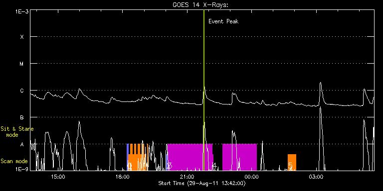EIS Observation timeline overlay to GOES-Xray curve Code 1" 2" 40" 266" EIS Observations list for this event: STUDY ACRONYM ID DATE OBSERVED DESCRIPTION NOAA# TARGET 0 PRY_slot_context_v3 | 24057 | 2011/08/29 18:12:33 | HOP 199 - origin of penumbral fine str | 1277 | Active Region TIMELINE ID DATE OBSERVED FITS FILE XCEN (+W/-E) YCEN (+N/-S) DUR ----------------------------------------------------------------------------------------------------------------- 24057 | 2011/08/29 18:12:33.000 | eis_l0_20110829_181233.fits.gz | -424.27 | 95.52 | 2m56s 1 IUU_SCAN_STEPS_002 | 24058 | 2011/08/29 18:15:54 | HOP 199 - origin of penumbral fine str | 1277 | Active Region TIMELINE ID DATE OBSERVED FITS FILE XCEN (+W/-E) YCEN (+N/-S) DUR ----------------------------------------------------------------------------------------------------------------- 24058 | 2011/08/29 18:15:54.000 | eis_l0_20110829_181554.fits.gz | -410.07 | 95.44 | 5m23s 24058 | 2011/08/29 18:21:21.000 | eis_l0_20110829_182121.fits.gz | -409.37 | 95.52 | 5m23s 24058 | 2011/08/29 18:26:47.000 | eis_l0_20110829_182647.fits.gz | -408.60 | 95.44 | 5m24s 24058 | 2011/08/29 18:32:14.000 | eis_l0_20110829_183214.fits.gz | -407.90 | 95.29 | 5m23s 24058 | 2011/08/29 18:37:41.000 | eis_l0_20110829_183741.fits.gz | -407.21 | 95.29 | 5m23s 24058 | 2011/08/29 18:43:08.000 | eis_l0_20110829_184308.fits.gz | -406.36 | 95.36 | 5m23s 24058 | 2011/08/29 18:48:34.000 | eis_l0_20110829_184834.fits.gz | -405.74 | 95.06 | 5m24s 24058 | 2011/08/29 18:54:01.000 | eis_l0_20110829_185401.fits.gz | -404.97 | 95.21 | 5m23s 24058 | 2011/08/29 18:59:28.000 | eis_l0_20110829_185928.fits.gz | -404.27 | 95.21 | 5m1s 24058 | 2011/08/29 19:09:36.000 | eis_l0_20110829_190936.fits.gz | -402.81 | 95.06 | 42s 2 PRY_slot_context_v3 | 24054 | 2011/08/29 20:02:19 | | 1277 | Active Region TIMELINE ID DATE OBSERVED FITS FILE XCEN (+W/-E) YCEN (+N/-S) DUR ----------------------------------------------------------------------------------------------------------------- 24054 | 2011/08/29 20:02:19.000 | eis_l0_20110829_200219.fits.gz | -365.87 | 126.73 | 2m56s 3 HPW021_VEL_240x512v1 | 24055 | 2011/08/29 20:05:26 | Large scan of active region (1 of 2) | 1277 | Active Region TIMELINE ID DATE OBSERVED FITS FILE XCEN (+W/-E) YCEN (+N/-S) DUR ----------------------------------------------------------------------------------------------------------------- 24055 | 2011/08/29 20:05:26.000 | eis_l0_20110829_200526.fits.gz | -230.70 | 126.80 | 2h3m47s 4 HPW021_VEL_240x512v1 | 24056 | 2011/08/29 22:09:46 | Large scan of active region (2 of 2) | 1277 | Active Region TIMELINE ID DATE OBSERVED FITS FILE XCEN (+W/-E) YCEN (+N/-S) DUR ----------------------------------------------------------------------------------------------------------------- 24056 | 2011/08/29 22:09:46.000 | eis_l0_20110829_220946.fits.gz | -453.17 | 126.11 | 3m4s 24056 | 2011/08/29 22:39:41.000 | eis_l0_20110829_223941.fits.gz | -449.00 | 125.95 | 1h33m53s 5 Hunter_loop_fe8 | 24053 | 2011/08/30 01:41:25 | Hunter study for finding bright loop f | 1277 | Active Region TIMELINE ID DATE OBSERVED FITS FILE XCEN (+W/-E) YCEN (+N/-S) DUR ----------------------------------------------------------------------------------------------------------------- 24053 | 2011/08/30 01:41:25.000 | eis_l0_20110830_014125.fits.gz | -304.84 | 124.72 | 22m40s : Check study information : Download file : View thumbnails For this event, also check for: