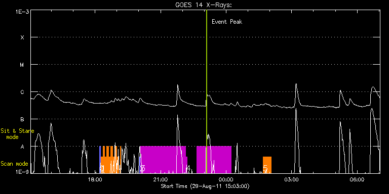 EIS Observation timeline overlay to GOES-Xray curve Code 1" 2" 40" 266" EIS Observations list for this event: STUDY ACRONYM ID DATE OBSERVED DESCRIPTION NOAA# TARGET 0 PRY_slot_context_v3 | 24057 | 2011/08/29 18:12:33 | HOP 199 - origin of penumbral fine str | 1277 | Active Region TIMELINE ID DATE OBSERVED FITS FILE XCEN (+W/-E) YCEN (+N/-S) DUR ----------------------------------------------------------------------------------------------------------------- 24057 | 2011/08/29 18:12:33.000 | eis_l0_20110829_181233.fits.gz | -424.27 | 95.52 | 2m56s 1 IUU_SCAN_STEPS_002 | 24058 | 2011/08/29 18:15:54 | HOP 199 - origin of penumbral fine str | 1277 | Active Region TIMELINE ID DATE OBSERVED FITS FILE XCEN (+W/-E) YCEN (+N/-S) DUR ----------------------------------------------------------------------------------------------------------------- 24058 | 2011/08/29 18:15:54.000 | eis_l0_20110829_181554.fits.gz | -410.07 | 95.44 | 5m23s 24058 | 2011/08/29 18:21:21.000 | eis_l0_20110829_182121.fits.gz | -409.37 | 95.52 | 5m23s 24058 | 2011/08/29 18:26:47.000 | eis_l0_20110829_182647.fits.gz | -408.60 | 95.44 | 5m24s 24058 | 2011/08/29 18:32:14.000 | eis_l0_20110829_183214.fits.gz | -407.90 | 95.29 | 5m23s 24058 | 2011/08/29 18:37:41.000 | eis_l0_20110829_183741.fits.gz | -407.21 | 95.29 | 5m23s 24058 | 2011/08/29 18:43:08.000 | eis_l0_20110829_184308.fits.gz | -406.36 | 95.36 | 5m23s 24058 | 2011/08/29 18:48:34.000 | eis_l0_20110829_184834.fits.gz | -405.74 | 95.06 | 5m24s 24058 | 2011/08/29 18:54:01.000 | eis_l0_20110829_185401.fits.gz | -404.97 | 95.21 | 5m23s 24058 | 2011/08/29 18:59:28.000 | eis_l0_20110829_185928.fits.gz | -404.27 | 95.21 | 5m1s 24058 | 2011/08/29 19:09:36.000 | eis_l0_20110829_190936.fits.gz | -402.81 | 95.06 | 42s 2 PRY_slot_context_v3 | 24054 | 2011/08/29 20:02:19 | | 1277 | Active Region TIMELINE ID DATE OBSERVED FITS FILE XCEN (+W/-E) YCEN (+N/-S) DUR ----------------------------------------------------------------------------------------------------------------- 24054 | 2011/08/29 20:02:19.000 | eis_l0_20110829_200219.fits.gz | -365.87 | 126.73 | 2m56s 3 HPW021_VEL_240x512v1 | 24055 | 2011/08/29 20:05:26 | Large scan of active region (1 of 2) | 1277 | Active Region TIMELINE ID DATE OBSERVED FITS FILE XCEN (+W/-E) YCEN (+N/-S) DUR ----------------------------------------------------------------------------------------------------------------- 24055 | 2011/08/29 20:05:26.000 | eis_l0_20110829_200526.fits.gz | -230.70 | 126.80 | 2h3m47s 4 HPW021_VEL_240x512v1 | 24056 | 2011/08/29 22:09:46 | Large scan of active region (2 of 2) | 1277 | Active Region TIMELINE ID DATE OBSERVED FITS FILE XCEN (+W/-E) YCEN (+N/-S) DUR ----------------------------------------------------------------------------------------------------------------- 24056 | 2011/08/29 22:09:46.000 | eis_l0_20110829_220946.fits.gz | -453.17 | 126.11 | 3m4s 24056 | 2011/08/29 22:39:41.000 | eis_l0_20110829_223941.fits.gz | -449.00 | 125.95 | 1h33m53s 5 Hunter_loop_fe8 | 24053 | 2011/08/30 01:41:25 | Hunter study for finding bright loop f | 1277 | Active Region TIMELINE ID DATE OBSERVED FITS FILE XCEN (+W/-E) YCEN (+N/-S) DUR ----------------------------------------------------------------------------------------------------------------- 24053 | 2011/08/30 01:41:25.000 | eis_l0_20110830_014125.fits.gz | -304.84 | 124.72 | 22m40s : Check study information : Download file : View thumbnails For this event, also check for: