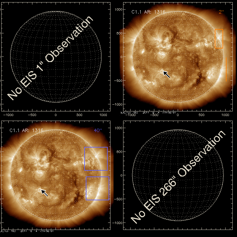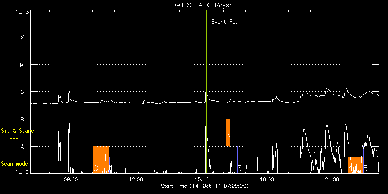 EIS Observation timeline overlay to GOES-Xray curve Code 1" 2" 40" 266" EIS Observations list for this event: STUDY ACRONYM ID DATE OBSERVED DESCRIPTION NOAA# TARGET 0 eis_swap_ar | 24563 | 2011/10/14 10:02:40 | HOP204: Tracking the outflow with Prob | 1309 | Active Region TIMELINE ID DATE OBSERVED FITS FILE XCEN (+W/-E) YCEN (+N/-S) DUR ----------------------------------------------------------------------------------------------------------------- 24563 | 2011/10/14 10:02:40.000 | eis_l0_20111014_100240.fits.gz | 870.86 | 377.48 | 42m12s 1 PRY_slot_context_v3 | 24564 | 2011/10/14 10:45:04 | context img for HOP204 | 1309 | Active Region TIMELINE ID DATE OBSERVED FITS FILE XCEN (+W/-E) YCEN (+N/-S) DUR ----------------------------------------------------------------------------------------------------------------- 24564 | 2011/10/14 10:45:04.000 | eis_l0_20111014_104504.fits.gz | 849.81 | 341.48 | 2m56s 2 EL_WHI_CH_limb | 24568 | 2011/10/14 16:07:45 | HOP201: CME heating and current sheets | | Coronal Hole TIMELINE ID DATE OBSERVED FITS FILE XCEN (+W/-E) YCEN (+N/-S) DUR ----------------------------------------------------------------------------------------------------------------- 24568 | 2011/10/14 16:07:45.000 | eis_l0_20111014_160745.fits.gz | 1020.15 | -271.54 | 10m1s 3 PRY_slot_context_v3 | 24573 | 2011/10/14 16:38:17 | context img for HOP201 | 1313 | Active Region TIMELINE ID DATE OBSERVED FITS FILE XCEN (+W/-E) YCEN (+N/-S) DUR ----------------------------------------------------------------------------------------------------------------- 24573 | 2011/10/14 16:38:17.000 | eis_l0_20111014_163817.fits.gz | 882.95 | -282.92 | 2m56s 4 eis_swap_ar | 24565 | 2011/10/14 21:42:33 | HOP204: Tracking the outflow with Prob | 1309 | Active Region TIMELINE ID DATE OBSERVED FITS FILE XCEN (+W/-E) YCEN (+N/-S) DUR ----------------------------------------------------------------------------------------------------------------- 24565 | 2011/10/14 21:42:33.000 | eis_l0_20111014_214233.fits.gz | 870.86 | 377.71 | 42m12s 5 PRY_slot_context_v3 | 24566 | 2011/10/14 22:24:56 | context img for HOP204 | 1309 | Active Region TIMELINE ID DATE OBSERVED FITS FILE XCEN (+W/-E) YCEN (+N/-S) DUR ----------------------------------------------------------------------------------------------------------------- 24566 | 2011/10/14 22:24:56.000 | eis_l0_20111014_222456.fits.gz | 849.81 | 341.48 | 2m57s : Check study information : Download file : View thumbnails For this event, also check for: