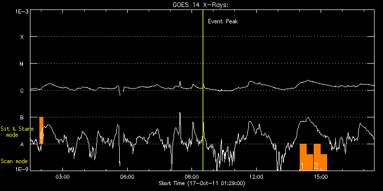EIS Observation timeline overlay to GOES-Xray curve Code 1" 2" 40" 266" EIS Observations list for this event: STUDY ACRONYM ID DATE OBSERVED DESCRIPTION NOAA# TARGET 0 EL_WHI_CH_limb | 24610 | 2011/10/17 01:55:12 | AR 11314 monitoring | | Coronal Hole TIMELINE ID DATE OBSERVED FITS FILE XCEN (+W/-E) YCEN (+N/-S) DUR ----------------------------------------------------------------------------------------------------------------- 24610 | 2011/10/17 01:55:12.000 | eis_l0_20111017_015512.fits.gz | 118.20 | 231.72 | 10m1s 1 BP_response1_2raster | 24587 | 2011/10/17 14:02:12 | HOP 203 - Properties of RBEs with Hino | | Quiet Sun TIMELINE ID DATE OBSERVED FITS FILE XCEN (+W/-E) YCEN (+N/-S) DUR ----------------------------------------------------------------------------------------------------------------- 24587 | 2011/10/17 14:02:12.000 | eis_l0_20111017_140212.fits.gz | -13.71 | -1.74 | 18m2s 24587 | 2011/10/17 14:20:17.000 | eis_l0_20111017_142017.fits.gz | -10.85 | -1.50 | 18m2s 2 BP_response1_2raster | 24593 | 2011/10/17 14:40:52 | HOP 203 - Properties of RBEs with Hino | | Quiet Sun TIMELINE ID DATE OBSERVED FITS FILE XCEN (+W/-E) YCEN (+N/-S) DUR ----------------------------------------------------------------------------------------------------------------- 24593 | 2011/10/17 14:40:52.000 | eis_l0_20111017_144052.fits.gz | -7.69 | -1.35 | 18m2s 24593 | 2011/10/17 14:58:57.000 | eis_l0_20111017_145857.fits.gz | -4.83 | -1.35 | 17m18s : Check study information : Download file : View thumbnails For this event, also check for: