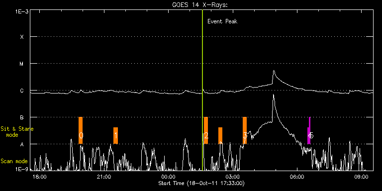 EIS Observation timeline overlay to GOES-Xray curve Code 1" 2" 40" 266" EIS Observations list for this event: STUDY ACRONYM ID DATE OBSERVED DESCRIPTION NOAA# TARGET 0 EL_WHI_CH_limb | 24626 | 2011/10/18 19:49:45 | HOP 201 - CME heating and current shee | | Coronal Hole TIMELINE ID DATE OBSERVED FITS FILE XCEN (+W/-E) YCEN (+N/-S) DUR ----------------------------------------------------------------------------------------------------------------- 24626 | 2011/10/18 19:49:45.000 | eis_l0_20111018_194945.fits.gz | -1140.47 | 279.35 | 10m 1 EL_WHI_CH_limb | 24627 | 2011/10/18 21:27:14 | HOP 201 - CME heating and current shee | | Coronal Hole TIMELINE ID DATE OBSERVED FITS FILE XCEN (+W/-E) YCEN (+N/-S) DUR ----------------------------------------------------------------------------------------------------------------- 24627 | 2011/10/18 21:27:14.000 | eis_l0_20111018_212714.fits.gz | -1140.47 | 279.35 | 10m1s 2 EL_WHI_CH_limb | 24630 | 2011/10/19 01:39:45 | HOP 201 - CME heating and current shee | | Coronal Hole TIMELINE ID DATE OBSERVED FITS FILE XCEN (+W/-E) YCEN (+N/-S) DUR ----------------------------------------------------------------------------------------------------------------- 24630 | 2011/10/19 01:39:45.000 | eis_l0_20111019_013945.fits.gz | -1140.47 | 279.51 | 10m 24630 | 2011/10/19 02:20:18.000 | eis_l0_20111019_022018.fits.gz | -1140.39 | 279.43 | 10m1s 3 EL_WHI_CH_limb | 24631 | 2011/10/19 03:27:47 | HOP 201 - CME heating and current shee | | Coronal Hole TIMELINE ID DATE OBSERVED FITS FILE XCEN (+W/-E) YCEN (+N/-S) DUR ----------------------------------------------------------------------------------------------------------------- 24631 | 2011/10/19 03:27:47.000 | eis_l0_20111019_032747.fits.gz | -1140.54 | 279.51 | 10m 4 regcal071 | 24612 | 2011/10/19 06:28:42 | Dark exposures, CCD bottom rows (100s | | Engineering TIMELINE ID DATE OBSERVED FITS FILE XCEN (+W/-E) YCEN (+N/-S) DUR ----------------------------------------------------------------------------------------------------------------- 24612 | 2011/10/19 06:28:42.000 | eis_l0_20111019_062842.fits.gz | 14.43 | -305.73 | 3m22s 5 regcal072 | 24613 | 2011/10/19 06:33:02 | Dark exposures, top CCD rows (100s exp | | Engineering TIMELINE ID DATE OBSERVED FITS FILE XCEN (+W/-E) YCEN (+N/-S) DUR ----------------------------------------------------------------------------------------------------------------- 24613 | 2011/10/19 06:33:02.000 | eis_l0_20111019_063302.fits.gz | 14.51 | 205.50 | 3m22s : Check study information : Download file : View thumbnails For this event, also check for: