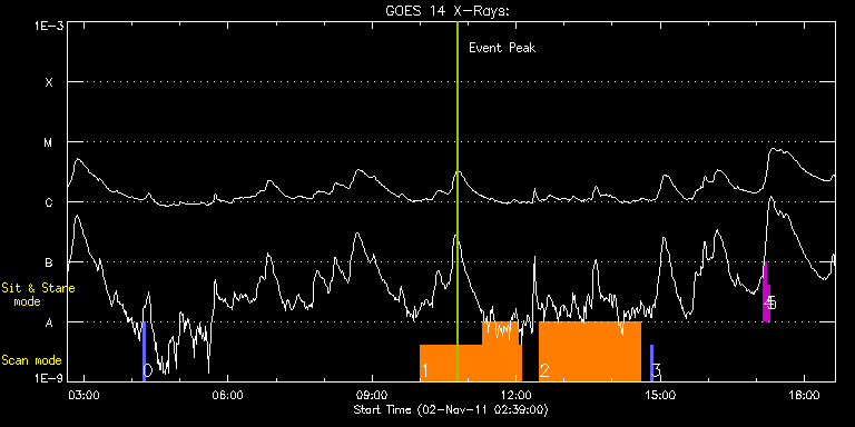 EIS Observation timeline overlay to GOES-Xray curve Code 1" 2" 40" 266" EIS Observations list for this event: STUDY ACRONYM ID DATE OBSERVED DESCRIPTION NOAA# TARGET 0 PRY_slot_context_v3 | 24880 | 2011/11/02 04:13:01 | Limb Active Region Study - Context | | Active Region TIMELINE ID DATE OBSERVED FITS FILE XCEN (+W/-E) YCEN (+N/-S) DUR ----------------------------------------------------------------------------------------------------------------- 24880 | 2011/11/02 04:13:01.000 | eis_l0_20111102_041301.fits.gz | -9884.69 | -9963.20 | 10s 24880 | 2011/11/02 04:13:37.000 | eis_l0_20111102_041337.fits.gz | -9884.69 | -9963.20 | 46s 24880 | 2011/11/02 04:14:36.000 | eis_l0_20111102_041436.fits.gz | -9884.69 | -9963.20 | 1m21s 1 cam_ar_limb_lite_v2 | 24877 | 2011/11/02 10:00:03 | Limb Active Region Study - Temperature | | Active Region TIMELINE ID DATE OBSERVED FITS FILE XCEN (+W/-E) YCEN (+N/-S) DUR ----------------------------------------------------------------------------------------------------------------- 24877 | 2011/11/02 10:00:03.000 | eis_l0_20111102_100003.fits.gz | -9869.70 | -9963.20 | 1h18m33s 24877 | 2011/11/02 11:18:38.000 | eis_l0_20111102_111838.fits.gz | -9869.70 | -9963.20 | 44m19s 24877 | 2011/11/02 12:02:59.000 | eis_l0_20111102_120259.fits.gz | -9869.70 | -9963.20 | 3m5s 2 cam_ar_limb_lite_v2 | 24878 | 2011/11/02 12:29:18 | Limb Active Region Study - Temperature | | Active Region TIMELINE ID DATE OBSERVED FITS FILE XCEN (+W/-E) YCEN (+N/-S) DUR ----------------------------------------------------------------------------------------------------------------- 24878 | 2011/11/02 12:29:18.000 | eis_l0_20111102_122918.fits.gz | -9869.70 | -9963.20 | 2h6m 3 PRY_slot_context_v3 | 24882 | 2011/11/02 14:48:16 | Limb Active Region Study - Context | | Active Region TIMELINE ID DATE OBSERVED FITS FILE XCEN (+W/-E) YCEN (+N/-S) DUR ----------------------------------------------------------------------------------------------------------------- 24882 | 2011/11/02 14:48:16.000 | eis_l0_20111102_144816.fits.gz | -9884.69 | -9963.20 | 2m57s 4 regcal071 | 24854 | 2011/11/02 17:09:11 | Dark exposures, CCD bottom rows (100s | | Engineering TIMELINE ID DATE OBSERVED FITS FILE XCEN (+W/-E) YCEN (+N/-S) DUR ----------------------------------------------------------------------------------------------------------------- 24854 | 2011/11/02 17:09:11.000 | eis_l0_20111102_170911.fits.gz | -9854.89 | -10268.20 | 3m22s 5 regcal072 | 24855 | 2011/11/02 17:12:59 | Dark exposures, top CCD rows (100s exp | | Engineering TIMELINE ID DATE OBSERVED FITS FILE XCEN (+W/-E) YCEN (+N/-S) DUR ----------------------------------------------------------------------------------------------------------------- 24855 | 2011/11/02 17:12:59.000 | eis_l0_20111102_171259.fits.gz | -9854.89 | -9757.20 | 3m22s : Check study information : Download file : View thumbnails For this event, also check for: