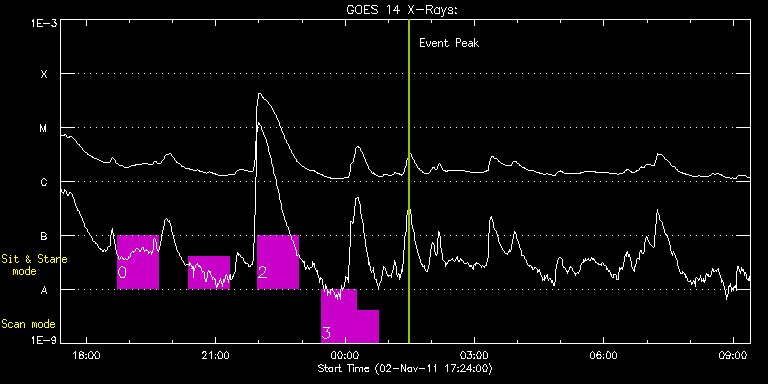 EIS Observation timeline overlay to GOES-Xray curve Code 1" 2" 40" 266" EIS Observations list for this event: STUDY ACRONYM ID DATE OBSERVED DESCRIPTION NOAA# TARGET 0 HPW021_VEL_001x512v1 | 24858 | 2011/11/02 18:43:47 | Exploratory Sit-n-Stare AR Study | | Active Region TIMELINE ID DATE OBSERVED FITS FILE XCEN (+W/-E) YCEN (+N/-S) DUR ----------------------------------------------------------------------------------------------------------------- 24858 | 2011/11/02 18:43:47.000 | eis_l0_20111102_184347.fits.gz | -9869.46 | -10063.20 | 56m43s 1 HPW021_VEL_001x512v1 | 24859 | 2011/11/02 20:22:09 | Exploratory Sit-n-Stare AR Study | | Active Region TIMELINE ID DATE OBSERVED FITS FILE XCEN (+W/-E) YCEN (+N/-S) DUR ----------------------------------------------------------------------------------------------------------------- 24859 | 2011/11/02 20:22:09.000 | eis_l0_20111102_202209.fits.gz | -9869.46 | -10063.20 | 56m43s 2 HPW021_VEL_001x512v1 | 24860 | 2011/11/02 21:58:42 | Exploratory Sit-n-Stare AR Study | | Active Region TIMELINE ID DATE OBSERVED FITS FILE XCEN (+W/-E) YCEN (+N/-S) DUR ----------------------------------------------------------------------------------------------------------------- 24860 | 2011/11/02 21:58:42.000 | eis_l0_20111102_215842.fits.gz | -9869.46 | -10063.20 | 56m43s 3 HPW021_VEL_240x512v1 | 24861 | 2011/11/02 23:27:18 | AR Region Studies - Velocity studies | | Active Region TIMELINE ID DATE OBSERVED FITS FILE XCEN (+W/-E) YCEN (+N/-S) DUR ----------------------------------------------------------------------------------------------------------------- 24861 | 2011/11/02 23:27:18.000 | eis_l0_20111102_232718.fits.gz | -9869.71 | -10103.20 | 48m28s 24861 | 2011/11/03 00:15:48.000 | eis_l0_20111103_001548.fits.gz | -9869.71 | -10103.20 | 30m55s : Check study information : Download file : View thumbnails For this event, also check for: