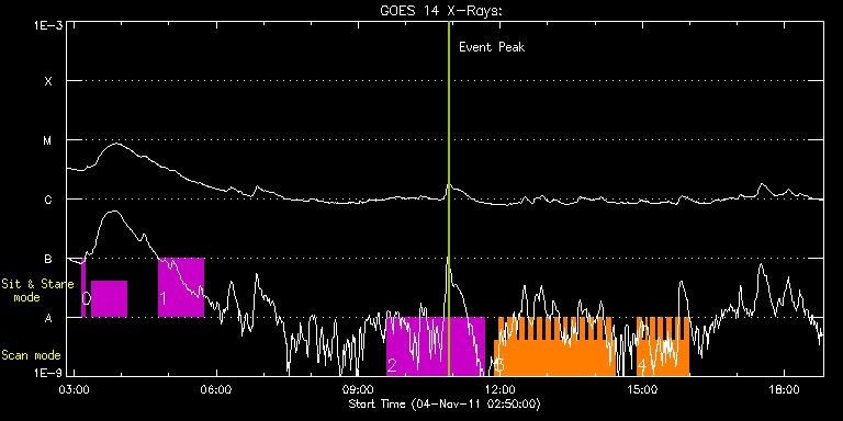 EIS Observation timeline overlay to GOES-Xray curve Code 1" 2" 40" 266" EIS Observations list for this event: STUDY ACRONYM ID DATE OBSERVED DESCRIPTION NOAA# TARGET 0 HPW021_VEL_001x512v1 | 24893 | 2011/11/04 03:09:13 | Exploratory Sit-n-Stare Active Region | | Active Region TIMELINE ID DATE OBSERVED FITS FILE XCEN (+W/-E) YCEN (+N/-S) DUR ----------------------------------------------------------------------------------------------------------------- 24893 | 2011/11/04 03:09:13.000 | eis_l0_20111104_030913.fits.gz | -787.30 | 170.72 | 4m6s 24893 | 2011/11/04 03:22:37.000 | eis_l0_20111104_032237.fits.gz | -786.21 | 170.64 | 43m18s 1 HPW021_VEL_001x512v1 | 24894 | 2011/11/04 04:46:43 | Exploratory Sit-n-Stare Active Region | | Active Region TIMELINE ID DATE OBSERVED FITS FILE XCEN (+W/-E) YCEN (+N/-S) DUR ----------------------------------------------------------------------------------------------------------------- 24894 | 2011/11/04 04:46:43.000 | eis_l0_20111104_044643.fits.gz | -779.80 | 169.79 | 56m42s 2 HPW021_VEL_240x512v1 | 24896 | 2011/11/04 09:36:21 | Active Region Studies - Velocity | 1339 | Active Region TIMELINE ID DATE OBSERVED FITS FILE XCEN (+W/-E) YCEN (+N/-S) DUR ----------------------------------------------------------------------------------------------------------------- 24896 | 2011/11/04 09:36:21.000 | eis_l0_20111104_093621.fits.gz | -756.95 | 167.63 | 2h3m47s 3 IUU_SCAN_STEPS_002 | 24903 | 2011/11/04 11:52:34 | Active Region Studies - Dynamics | 1339 | Active Region TIMELINE ID DATE OBSERVED FITS FILE XCEN (+W/-E) YCEN (+N/-S) DUR ----------------------------------------------------------------------------------------------------------------- 24903 | 2011/11/04 11:52:34.000 | eis_l0_20111104_115234.fits.gz | -746.76 | 266.62 | 5m24s 24903 | 2011/11/04 11:58:01.000 | eis_l0_20111104_115801.fits.gz | -746.22 | 266.39 | 5m23s 24903 | 2011/11/04 12:03:28.000 | eis_l0_20111104_120328.fits.gz | -745.83 | 266.39 | 5m23s 24903 | 2011/11/04 12:08:54.000 | eis_l0_20111104_120854.fits.gz | -745.37 | 266.39 | 5m24s 24903 | 2011/11/04 12:14:21.000 | eis_l0_20111104_121421.fits.gz | -744.90 | 266.39 | 42s 24903 | 2011/11/04 12:15:26.000 | eis_l0_20111104_121526.fits.gz | -744.75 | 266.31 | 4m19s 24903 | 2011/11/04 12:19:48.000 | eis_l0_20111104_121948.fits.gz | -744.36 | 266.31 | 5m23s 24903 | 2011/11/04 12:25:15.000 | eis_l0_20111104_122515.fits.gz | -743.90 | 266.31 | 5m23s 24903 | 2011/11/04 12:30:42.000 | eis_l0_20111104_123042.fits.gz | -743.51 | 266.31 | 5m23s 24903 | 2011/11/04 12:36:08.000 | eis_l0_20111104_123608.fits.gz | -743.05 | 266.16 | 5m24s 24903 | 2011/11/04 12:41:35.000 | eis_l0_20111104_124135.fits.gz | -742.59 | 266.31 | 5m23s 24903 | 2011/11/04 12:47:02.000 | eis_l0_20111104_124702.fits.gz | -742.12 | 266.16 | 5m23s 24903 | 2011/11/04 12:52:29.000 | eis_l0_20111104_125229.fits.gz | -741.58 | 266.16 | 5m23s 24903 | 2011/11/04 12:57:55.000 | eis_l0_20111104_125755.fits.gz | -741.20 | 266.16 | 5m24s 24903 | 2011/11/04 13:03:22.000 | eis_l0_20111104_130322.fits.gz | -740.65 | 266.00 | 5m24s 24903 | 2011/11/04 13:08:49.000 | eis_l0_20111104_130849.fits.gz | -740.19 | 266.08 | 5m23s 24903 | 2011/11/04 13:14:16.000 | eis_l0_20111104_131416.fits.gz | -739.65 | 265.85 | 5m23s 24903 | 2011/11/04 13:19:43.000 | eis_l0_20111104_131943.fits.gz | -739.11 | 265.85 | 5m23s 24903 | 2011/11/04 13:25:09.000 | eis_l0_20111104_132509.fits.gz | -738.72 | 265.70 | 5m24s 24903 | 2011/11/04 13:30:36.000 | eis_l0_20111104_133036.fits.gz | -738.26 | 265.77 | 5m24s 24903 | 2011/11/04 13:36:03.000 | eis_l0_20111104_133603.fits.gz | -737.80 | 265.77 | 5m23s 24903 | 2011/11/04 13:41:30.000 | eis_l0_20111104_134130.fits.gz | -737.33 | 265.62 | 5m23s 24903 | 2011/11/04 13:46:56.000 | eis_l0_20111104_134656.fits.gz | -736.87 | 265.62 | 5m24s 24903 | 2011/11/04 13:52:23.000 | eis_l0_20111104_135223.fits.gz | -736.41 | 265.70 | 5m24s 24903 | 2011/11/04 13:57:50.000 | eis_l0_20111104_135750.fits.gz | -735.86 | 265.70 | 5m23s 24903 | 2011/11/04 14:03:17.000 | eis_l0_20111104_140317.fits.gz | -735.40 | 265.54 | 5m23s 24903 | 2011/11/04 14:08:43.000 | eis_l0_20111104_140843.fits.gz | -734.86 | 265.39 | 5m24s 24903 | 2011/11/04 14:14:10.000 | eis_l0_20111104_141410.fits.gz | -734.40 | 265.39 | 5m24s 24903 | 2011/11/04 14:19:37.000 | eis_l0_20111104_141937.fits.gz | -733.93 | 265.46 | 5m23s 4 IUU_SCAN_STEPS_002 | 24902 | 2011/11/04 14:53:09 | Active Region Studies - Dynamics | | Active Region TIMELINE ID DATE OBSERVED FITS FILE XCEN (+W/-E) YCEN (+N/-S) DUR ----------------------------------------------------------------------------------------------------------------- 24902 | 2011/11/04 14:53:09.000 | eis_l0_20111104_145309.fits.gz | -731.00 | 265.23 | 5m23s 24902 | 2011/11/04 14:58:36.000 | eis_l0_20111104_145836.fits.gz | -730.53 | 265.15 | 5m23s 24902 | 2011/11/04 15:04:02.000 | eis_l0_20111104_150402.fits.gz | -729.99 | 265.08 | 1m47s 24902 | 2011/11/04 15:06:12.000 | eis_l0_20111104_150612.fits.gz | -729.92 | 265.15 | 3m14s 24902 | 2011/11/04 15:09:29.000 | eis_l0_20111104_150929.fits.gz | -729.53 | 265.00 | 4m41s 24902 | 2011/11/04 15:14:56.000 | eis_l0_20111104_151456.fits.gz | -729.07 | 265.08 | 20s 24902 | 2011/11/04 15:15:40.000 | eis_l0_20111104_151540.fits.gz | -728.99 | 265.08 | 41s 24902 | 2011/11/04 15:17:06.000 | eis_l0_20111104_151706.fits.gz | -728.91 | 265.00 | 3m14s 24902 | 2011/11/04 15:20:23.000 | eis_l0_20111104_152023.fits.gz | -728.60 | 264.92 | 5m24s 24902 | 2011/11/04 15:25:50.000 | eis_l0_20111104_152550.fits.gz | -728.14 | 264.92 | 5m23s 24902 | 2011/11/04 15:31:17.000 | eis_l0_20111104_153117.fits.gz | -727.60 | 264.92 | 5m23s 24902 | 2011/11/04 15:36:43.000 | eis_l0_20111104_153643.fits.gz | -727.14 | 264.77 | 5m24s 24902 | 2011/11/04 15:42:10.000 | eis_l0_20111104_154210.fits.gz | -726.59 | 264.77 | 5m24s 24902 | 2011/11/04 15:47:37.000 | eis_l0_20111104_154737.fits.gz | -726.21 | 264.85 | 5m23s 24902 | 2011/11/04 15:53:04.000 | eis_l0_20111104_155304.fits.gz | 