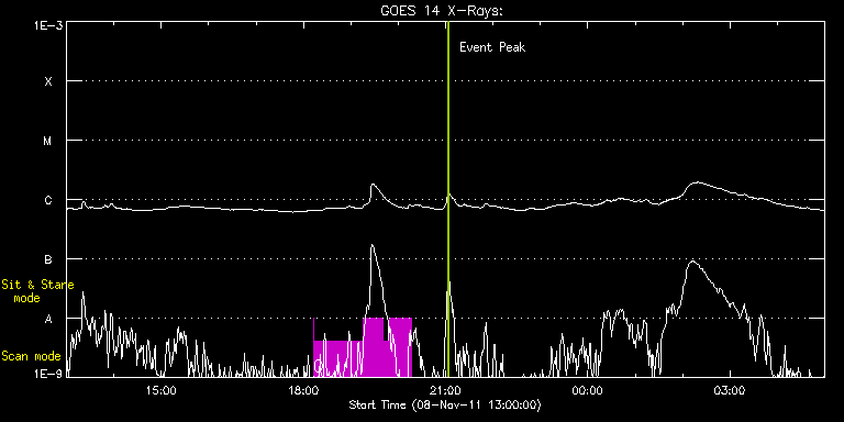 EIS Observation timeline overlay to GOES-Xray curve Code 1" 2" 40" 266" EIS Observations list for this event: STUDY ACRONYM ID DATE OBSERVED DESCRIPTION NOAA# TARGET 0 HPW021_VEL_240x512v1 | 24934 | 2011/11/08 18:12:34 | Detailed scan of AR 11339 at disk cent | 1339 | Active Region TIMELINE ID DATE OBSERVED FITS FILE XCEN (+W/-E) YCEN (+N/-S) DUR ----------------------------------------------------------------------------------------------------------------- 24934 | 2011/11/08 18:12:34.000 | eis_l0_20111108_181234.fits.gz | 45.26 | 245.61 | 1m 24934 | 2011/11/08 18:13:36.000 | eis_l0_20111108_181336.fits.gz | 45.34 | 245.46 | 1h1m52s 24934 | 2011/11/08 19:15:30.000 | eis_l0_20111108_191530.fits.gz | 54.45 | 245.53 | 25m46s 24934 | 2011/11/08 19:41:18.000 | eis_l0_20111108_194118.fits.gz | 58.16 | 245.61 | 7m11s 24934 | 2011/11/08 19:48:31.000 | eis_l0_20111108_194831.fits.gz | 59.24 | 245.69 | 27m50s : Check study information : Download file : View thumbnails For this event, also check for: