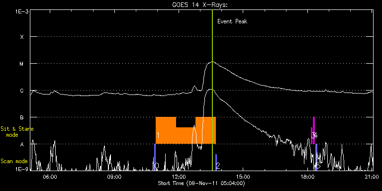 EIS Observation timeline overlay to GOES-Xray curve Code 1" 2" 40" 266" EIS Observations list for this event: STUDY ACRONYM ID DATE OBSERVED DESCRIPTION NOAA# TARGET 0 PRY_slot_context_v3 | 24931 | 2011/11/09 10:52:20 | Context image | 1339 | Active Region TIMELINE ID DATE OBSERVED FITS FILE XCEN (+W/-E) YCEN (+N/-S) DUR ----------------------------------------------------------------------------------------------------------------- 24931 | 2011/11/09 10:52:20.000 | eis_l0_20111109_105220.fits.gz | 175.67 | 247.93 | 2m56s 1 FLAREDOP_EIS | 24932 | 2011/11/09 10:55:41 | Rapid Cadence Sit-and-Stare Flare Obse | | Flare TIMELINE ID DATE OBSERVED FITS FILE XCEN (+W/-E) YCEN (+N/-S) DUR ----------------------------------------------------------------------------------------------------------------- 24932 | 2011/11/09 10:55:41.000 | eis_l0_20111109_105541.fits.gz | 190.87 | 247.93 | 55m50s 24932 | 2011/11/09 11:51:33.000 | eis_l0_20111109_115133.fits.gz | 198.90 | 248.01 | 55m51s 24932 | 2011/11/09 12:47:26.000 | eis_l0_20111109_124726.fits.gz | 206.86 | 248.55 | 55m50s 2 PRY_slot_context_v3 | 24933 | 2011/11/09 13:43:27 | Context image | 1339 | Active Region TIMELINE ID DATE OBSERVED FITS FILE XCEN (+W/-E) YCEN (+N/-S) DUR ----------------------------------------------------------------------------------------------------------------- 24933 | 2011/11/09 13:43:27.000 | eis_l0_20111109_134327.fits.gz | 200.15 | 248.55 | 2m56s 3 regcal071 | 24927 | 2011/11/09 18:09:51 | Dark exposures, CCD bottom rows (100s | | Engineering TIMELINE ID DATE OBSERVED FITS FILE XCEN (+W/-E) YCEN (+N/-S) DUR ----------------------------------------------------------------------------------------------------------------- 24927 | 2011/11/09 18:09:51.000 | eis_l0_20111109_180951.fits.gz | 14.59 | -305.58 | 3m22s 4 regcal072 | 24928 | 2011/11/09 18:16:11 | Dark exposures, top CCD rows (100s exp | | Engineering TIMELINE ID DATE OBSERVED FITS FILE XCEN (+W/-E) YCEN (+N/-S) DUR ----------------------------------------------------------------------------------------------------------------- 24928 | 2011/11/09 18:16:11.000 | eis_l0_20111109_181611.fits.gz | 268.66 | 455.40 | 3m22s 5 PRY_slot_context_v3 | 24929 | 2011/11/09 18:23:13 | Context image of AR | 1339 | Active Region TIMELINE ID DATE OBSERVED FITS FILE XCEN (+W/-E) YCEN (+N/-S) DUR ----------------------------------------------------------------------------------------------------------------- 24929 | 2011/11/09 18:23:13.000 | eis_l0_20111109_182313.fits.gz | 239.94 | 249.47 | 2m57s : Check study information : Download file : View thumbnails For this event, also check for: