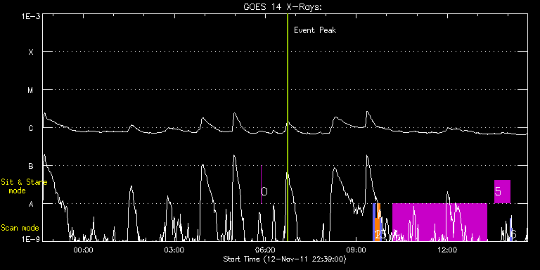 EIS Observation timeline overlay to GOES-Xray curve Code 1" 2" 40" 266" EIS Observations list for this event: STUDY ACRONYM ID DATE OBSERVED DESCRIPTION NOAA# TARGET 0 regcal077 | 24968 | 2011/11/13 05:51:35 | Flatfield, 2 exposures, led 80ms, full | | Engineering TIMELINE ID DATE OBSERVED FITS FILE XCEN (+W/-E) YCEN (+N/-S) DUR ----------------------------------------------------------------------------------------------------------------- 24968 | 2011/11/13 05:51:35.000 | eis_l0_20111113_055135.fits.gz | -368.56 | 262.89 | 4s 1 PRY_slot_context_v3 | 24948 | 2011/11/13 09:33:34 | Context image for HOP-176 | 1339 | Active Region TIMELINE ID DATE OBSERVED FITS FILE XCEN (+W/-E) YCEN (+N/-S) DUR ----------------------------------------------------------------------------------------------------------------- 24948 | 2011/11/13 09:33:34.000 | eis_l0_20111113_093334.fits.gz | 828.41 | 284.08 | 2m56s 2 cam_artb_rhessi_lite | 24949 | 2011/11/13 09:36:55 | HOP-176: Small scale jets on the solar | | Active Region TIMELINE ID DATE OBSERVED FITS FILE XCEN (+W/-E) YCEN (+N/-S) DUR ----------------------------------------------------------------------------------------------------------------- 24949 | 2011/11/13 09:36:55.000 | eis_l0_20111113_093655.fits.gz | 843.22 | 284.23 | 4m49s 24949 | 2011/11/13 09:41:50.000 | eis_l0_20111113_094150.fits.gz | 843.46 | 284.23 | 4m49s 3 PRY_slot_context_v3 | 24950 | 2011/11/13 09:46:53 | Context image for HOP-176 | 1339 | Active Region TIMELINE ID DATE OBSERVED FITS FILE XCEN (+W/-E) YCEN (+N/-S) DUR ----------------------------------------------------------------------------------------------------------------- 24950 | 2011/11/13 09:46:53.000 | eis_l0_20111113_094653.fits.gz | 829.10 | 284.16 | 2m56s 4 HPW021_VEL_360x512v1 | 24951 | 2011/11/13 10:12:19 | HOP-205; Line shift vs Temperature wit | 1339 | Active Region TIMELINE ID DATE OBSERVED FITS FILE XCEN (+W/-E) YCEN (+N/-S) DUR ----------------------------------------------------------------------------------------------------------------- 24951 | 2011/11/13 10:12:19.000 | eis_l0_20111113_101219.fits.gz | 845.47 | 284.54 | 3h5m43s 5 RED_SUM_EIS_SNS_OL | 24952 | 2011/11/13 13:33:40 | HOP-205; Line shift vs Temperature wit | | Quiet Sun TIMELINE ID DATE OBSERVED FITS FILE XCEN (+W/-E) YCEN (+N/-S) DUR ----------------------------------------------------------------------------------------------------------------- 24952 | 2011/11/13 13:33:40.000 | eis_l0_20111113_133340.fits.gz | 804.88 | -658.49 | 30m23s 6 PRY_slot_context_v3 | 24953 | 2011/11/13 14:04:28 | HOP-205; Line shift vs Temperature wit | 1345 | Active Region TIMELINE ID DATE OBSERVED FITS FILE XCEN (+W/-E) YCEN (+N/-S) DUR ----------------------------------------------------------------------------------------------------------------- 24953 | 2011/11/13 14:04:28.000 | eis_l0_20111113_140428.fits.gz | 704.79 | -658.49 | 2m56s : Check study information : Download file : View thumbnails For this event, also check for: