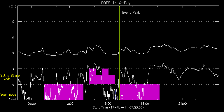 EIS Observation timeline overlay to GOES-Xray curve Code 1" 2" 40" 266" EIS Observations list for this event: STUDY ACRONYM ID DATE OBSERVED DESCRIPTION NOAA# TARGET 0 HPW021_VEL_360x512v1 | 24988 | 2011/11/17 10:00:41 | HOP205 AR study | 1346 | Active Region TIMELINE ID DATE OBSERVED FITS FILE XCEN (+W/-E) YCEN (+N/-S) DUR ----------------------------------------------------------------------------------------------------------------- 24988 | 2011/11/17 10:00:41.000 | eis_l0_20111117_100041.fits.gz | -161.45 | -392.18 | 3h5m42s 1 RED_SUM_EIS_SNS_OL | 24989 | 2011/11/17 13:33:41 | HOP205 OFF-limb study | | Quiet Sun TIMELINE ID DATE OBSERVED FITS FILE XCEN (+W/-E) YCEN (+N/-S) DUR ----------------------------------------------------------------------------------------------------------------- 24989 | 2011/11/17 13:33:41.000 | eis_l0_20111117_133341.fits.gz | 760.00 | -730.40 | 30m22s 24989 | 2011/11/17 14:04:13.000 | eis_l0_20111117_140413.fits.gz | 41.29 | -403.02 | 30m23s 24989 | 2011/11/17 14:34:46.000 | eis_l0_20111117_143446.fits.gz | 759.92 | -730.55 | 30m23s 24989 | 2011/11/17 15:05:19.000 | eis_l0_20111117_150519.fits.gz | 760.00 | -730.55 | 30m23s 2 PRY_slot_context_v3 | 24990 | 2011/11/17 15:36:07 | HOP205 OFF-limb study | | Active Region TIMELINE ID DATE OBSERVED FITS FILE XCEN (+W/-E) YCEN (+N/-S) DUR ----------------------------------------------------------------------------------------------------------------- 24990 | 2011/11/17 15:36:07.000 | eis_l0_20111117_153607.fits.gz | 669.82 | -690.55 | 2m56s 3 HPW021_VEL_360x512v1 | 24991 | 2011/11/17 16:03:21 | AR observation with SUMER for calibrat | 1346 | Active Region TIMELINE ID DATE OBSERVED FITS FILE XCEN (+W/-E) YCEN (+N/-S) DUR ----------------------------------------------------------------------------------------------------------------- 24991 | 2011/11/17 16:03:21.000 | eis_l0_20111117_160321.fits.gz | -110.00 | -391.61 | 3h5m42s : Check study information : Download file : View thumbnails For this event, also check for: