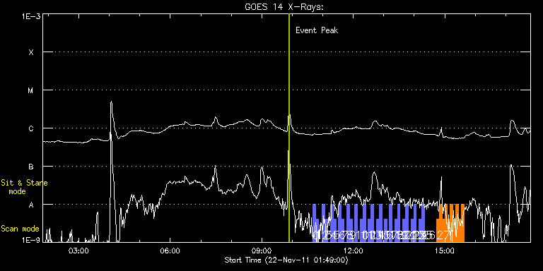 EIS Observation timeline overlay to GOES-Xray curve Code 1" 2" 40" 266" EIS Observations list for this event: STUDY ACRONYM ID DATE OBSERVED DESCRIPTION NOAA# TARGET 0 full_sun_slot_scan_1 | 25007 | 2011/11/22 10:40:20 | HOP130 Full sun slot | | Quiet Sun TIMELINE ID DATE OBSERVED FITS FILE XCEN (+W/-E) YCEN (+N/-S) DUR ----------------------------------------------------------------------------------------------------------------- 25007 | 2011/11/22 10:40:20.000 | eis_l0_20111122_104020.fits.gz | 920.72 | 185.50 | 5m27s 1 full_sun_slot_scan_1 | 25008 | 2011/11/22 10:45:53 | HOP130 Full sun slot | 1346 | Quiet Sun TIMELINE ID DATE OBSERVED FITS FILE XCEN (+W/-E) YCEN (+N/-S) DUR ----------------------------------------------------------------------------------------------------------------- 25008 | 2011/11/22 10:45:53.000 | eis_l0_20111122_104553.fits.gz | 920.72 | -286.50 | 5m26s 2 full_sun_slot_scan_1 | 25053 | 2011/11/22 10:59:14 | HOP130 Full sun slot | 1357 | Quiet Sun TIMELINE ID DATE OBSERVED FITS FILE XCEN (+W/-E) YCEN (+N/-S) DUR ----------------------------------------------------------------------------------------------------------------- 25053 | 2011/11/22 10:59:14.000 | eis_l0_20111122_105914.fits.gz | 452.75 | 185.50 | 5m27s 3 full_sun_slot_scan_1 | 25054 | 2011/11/22 11:04:46 | HOP130 Full sun slot | | Quiet Sun TIMELINE ID DATE OBSERVED FITS FILE XCEN (+W/-E) YCEN (+N/-S) DUR ----------------------------------------------------------------------------------------------------------------- 25054 | 2011/11/22 11:04:46.000 | eis_l0_20111122_110446.fits.gz | 452.75 | -286.50 | 5m27s 4 full_sun_slot_scan_1 | 25055 | 2011/11/22 11:15:15 | HOP130 Full sun slot | 1353 | Quiet Sun TIMELINE ID DATE OBSERVED FITS FILE XCEN (+W/-E) YCEN (+N/-S) DUR ----------------------------------------------------------------------------------------------------------------- 25055 | 2011/11/22 11:15:15.000 | eis_l0_20111122_111515.fits.gz | -15.21 | 185.50 | 5m27s 5 full_sun_slot_scan_1 | 25056 | 2011/11/22 11:20:47 | HOP130 Full sun slot | 1352 | Quiet Sun TIMELINE ID DATE OBSERVED FITS FILE XCEN (+W/-E) YCEN (+N/-S) DUR ----------------------------------------------------------------------------------------------------------------- 25056 | 2011/11/22 11:20:47.000 | eis_l0_20111122_112047.fits.gz | -15.21 | -286.58 | 5m26s 6 full_sun_slot_scan_1 | 25057 | 2011/11/22 11:31:14 | HOP130 Full sun slot | 1353 | Quiet Sun TIMELINE ID DATE OBSERVED FITS FILE XCEN (+W/-E) YCEN (+N/-S) DUR ----------------------------------------------------------------------------------------------------------------- 25057 | 2011/11/22 11:31:14.000 | eis_l0_20111122_113114.fits.gz | -483.26 | 185.50 | 5m27s 7 full_sun_slot_scan_1 | 25058 | 2011/11/22 11:36:46 | HOP130 Full sun slot | 1354 | Quiet Sun TIMELINE ID DATE OBSERVED FITS FILE XCEN (+W/-E) YCEN (+N/-S) DUR ----------------------------------------------------------------------------------------------------------------- 25058 | 2011/11/22 11:36:46.000 | eis_l0_20111122_113646.fits.gz | -483.18 | -286.58 | 5m27s 8 full_sun_slot_scan_1 | 25059 | 2011/11/22 11:47:14 | HOP130 Full sun slot | | Quiet Sun TIMELINE ID DATE OBSERVED FITS FILE XCEN (+W/-E) YCEN (+N/-S) DUR ----------------------------------------------------------------------------------------------------------------- 25059 | 2011/11/22 11:47:14.000 | eis_l0_20111122_114714.fits.gz | -9884.69 | -9777.20 | 5m27s 9 full_sun_slot_scan_1 | 25060 | 2011/11/22 11:52:46 | HOP130 Full sun slot | | Quiet Sun TIMELINE ID DATE OBSERVED FITS FILE XCEN (+W/-E) YCEN (+N/-S) DUR ----------------------------------------------------------------------------------------------------------------- 25060 | 2011/11/22 11:52:46.000 | eis_l0_20111122_115246.fits.gz | -9884.69 | -10249.20 | 5m27s 10 full_sun_slot_scan_1 | 25061 | 2011/11/22 12:03:14 | HOP130 Full sun slot | | Quiet Sun TIMELINE ID DATE OBSERVED FITS FILE XCEN (+W/-E) YCEN (+N/-S) DUR ----------------------------------------------------------------------------------------------------------------- 25061 | 2011/11/22 12:03:14.000 | eis_l0_20111122_120314.fits.gz | 799.90 | 655.71 | 5m27s 11 full_sun_slot_scan_1 | 25062 | 2011/11/22 12:13:14 | HOP130 Full sun slot | | Quiet Sun TIMELINE ID DATE OBSERVED FITS FILE XCEN (+W/-E) YCEN (+N/-S) DUR ----------------------------------------------------------------------------------------------------------------- 25062 | 2011/11/22 12:13:14.000 | eis_l0_20111122_121314.fits.gz | 395.82 | 1032.67 | 5m27s 12 full_sun_slot_scan_1 | 25063 | 2011/11/22 12:18:46 | HOP130 Full sun slot | | Quiet Sun TIMELINE ID DATE OBSERVED FITS FILE XCEN (+W/-E) YCEN (+N/-S) DUR ----------------------------------------------------------------------------------------------------------------- 25063 | 2011/11/22 12:18:46.000 | eis_l0_20111122_121846.fits.gz | 395.82 | 560.67 | 5m27s 13 full_sun_slot_scan_1 | 25064 | 2011/11/22 12:29:14 | HOP130 Full sun slot | | Quiet Sun TIMELINE ID DATE OBSERVED FITS FILE XCEN (+W/-E) YCEN (+N/-S) DUR ----------------------------------------------------------------------------------------------------------------- 25064 | 2011/11/22 12:29:14.000 | eis_l0_20111122_122914.fits.gz | -15.29 | 1126.45 | 5m27s 14 full_sun_slot_scan_1 | 25065 | 2011/11/22 12:34:46 | HOP130 Full sun slot | | Quiet Sun TIMELINE ID DATE OBSERVED FITS FILE XCEN (+W/-E) YCEN (+N/-S) DUR ----------------------------------------------------------------------------------------------------------------- 25065 | 2011/11/22 12:34:46.000 | eis_l0_20111122_123446.fits.gz | -15.29 | 654.61 | 5m27s 15 full_sun_slot_scan_1 | 25066 | 2011/11/22 12:45:14 | HOP130 Full sun slot | | Quiet Sun TIMELINE ID DATE OBSERVED FITS FILE XCEN (+W/-E) YCEN (+N/-S) DUR ----------------------------------------------------------------------------------------------------------------- 25066 | 2011/11/22 12:45:14.000 | eis_l0_20111122_124514.fits.gz | -426.15 | 1032.44 | 5m27s 16 
