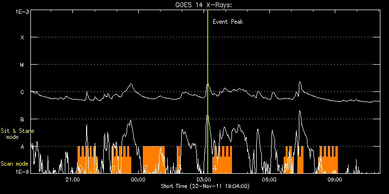 EIS Observation timeline overlay to GOES-Xray curve Code 1" 2" 40" 266" EIS Observations list for this event: STUDY ACRONYM ID DATE OBSERVED DESCRIPTION NOAA# TARGET 0 HH_Flare+AR_180x152 | 25087 | 2011/11/22 21:14:03 | Flare Hunting and AR study | 1354 | Flare TIMELINE ID DATE OBSERVED FITS FILE XCEN (+W/-E) YCEN (+N/-S) DUR ----------------------------------------------------------------------------------------------------------------- 25087 | 2011/11/22 21:14:03.000 | eis_l0_20111122_211403.fits.gz | -167.92 | -306.25 | 5m18s 25087 | 2011/11/22 21:19:24.000 | eis_l0_20111122_211924.fits.gz | -167.07 | -306.25 | 5m18s 25087 | 2011/11/22 21:24:45.000 | eis_l0_20111122_212445.fits.gz | -166.29 | -306.17 | 5m18s 25087 | 2011/11/22 21:30:06.000 | eis_l0_20111122_213006.fits.gz | -165.52 | -306.25 | 5m18s 25087 | 2011/11/22 21:35:27.000 | eis_l0_20111122_213527.fits.gz | -164.67 | -306.09 | 5m18s 25087 | 2011/11/22 21:40:47.000 | eis_l0_20111122_214047.fits.gz | -163.90 | -306.17 | 5m18s 25087 | 2011/11/22 21:46:08.000 | eis_l0_20111122_214608.fits.gz | -163.13 | -306.25 | 5m18s 25087 | 2011/11/22 21:51:29.000 | eis_l0_20111122_215129.fits.gz | -162.35 | -306.17 | 5m18s 25087 | 2011/11/22 21:56:50.000 | eis_l0_20111122_215650.fits.gz | -161.51 | -306.17 | 5m18s 25087 | 2011/11/22 22:02:11.000 | eis_l0_20111122_220211.fits.gz | -160.81 | -306.17 | 5m17s 1 HH_Flare+AR_180x152 | 25088 | 2011/11/22 22:46:28 | Flare Hunting and AR study | 1354 | Flare TIMELINE ID DATE OBSERVED FITS FILE XCEN (+W/-E) YCEN (+N/-S) DUR ----------------------------------------------------------------------------------------------------------------- 25088 | 2011/11/22 22:46:28.000 | eis_l0_20111122_224628.fits.gz | -154.32 | -306.17 | 5m19s 25088 | 2011/11/22 22:51:49.000 | eis_l0_20111122_225149.fits.gz | -153.47 | -306.09 | 5m18s 25088 | 2011/11/22 22:57:10.000 | eis_l0_20111122_225710.fits.gz | -152.62 | -306.17 | 5m18s 25088 | 2011/11/22 23:02:31.000 | eis_l0_20111122_230231.fits.gz | -151.93 | -306.17 | 5m18s 25088 | 2011/11/22 23:07:51.000 | eis_l0_20111122_230751.fits.gz | -151.00 | -306.32 | 5m18s 25088 | 2011/11/22 23:13:12.000 | eis_l0_20111122_231312.fits.gz | -150.30 | -306.09 | 5m17s 25088 | 2011/11/22 23:18:32.000 | eis_l0_20111122_231832.fits.gz | -149.46 | -306.17 | 5m18s 25088 | 2011/11/22 23:23:52.000 | eis_l0_20111122_232352.fits.gz | -148.76 | -306.25 | 5m18s 25088 | 2011/11/22 23:29:13.000 | eis_l0_20111122_232913.fits.gz | -147.83 | -306.09 | 5m17s 25088 | 2011/11/22 23:34:33.000 | eis_l0_20111122_233433.fits.gz | -147.14 | -306.17 | 5m18s 2 DRW_Alf_01 | 25078 | 2011/11/23 00:12:44 | HOP128 AR | 1352 | Active Region TIMELINE ID DATE OBSERVED FITS FILE XCEN (+W/-E) YCEN (+N/-S) DUR ----------------------------------------------------------------------------------------------------------------- 25078 | 2011/11/23 00:12:44.000 | eis_l0_20111123_001244.fits.gz | 188.24 | -454.72 | 1m8s 25078 | 2011/11/23 00:13:55.000 | eis_l0_20111123_001355.fits.gz | 188.47 | -454.56 | 1m8s 25078 | 2011/11/23 00:15:06.000 | eis_l0_20111123_001506.fits.gz | 188.63 | -454.56 | 1m8s 25078 | 2011/11/23 00:16:17.000 | eis_l0_20111123_001617.fits.gz | 188.78 | -454.72 | 1m9s 25078 | 2011/11/23 00:17:28.000 | eis_l0_20111123_001728.fits.gz | 188.94 | -454.64 | 1m9s 25078 | 2011/11/23 00:18:40.000 | eis_l0_20111123_001840.fits.gz | 189.09 | -454.64 | 1m8s 25078 | 2011/11/23 00:19:51.000 | eis_l0_20111123_001951.fits.gz | 189.25 | -454.56 | 1m8s 25078 | 2011/11/23 00:21:02.000 | eis_l0_20111123_002102.fits.gz | 189.32 | -454.56 | 1m8s 25078 | 2011/11/23 00:22:13.000 | eis_l0_20111123_002213.fits.gz | 189.48 | -454.64 | 1m8s 25078 | 2011/11/23 00:23:24.000 | eis_l0_20111123_002324.fits.gz | 189.71 | -454.64 | 1m8s 25078 | 2011/11/23 00:24:35.000 | eis_l0_20111123_002435.fits.gz | 189.87 | -454.64 | 1m9s 25078 | 2011/11/23 00:25:46.000 | eis_l0_20111123_002546.fits.gz | 190.02 | -454.56 | 1m9s 25078 | 2011/11/23 00:26:57.000 | eis_l0_20111123_002657.fits.gz | 190.17 | -454.56 | 1m9s 25078 | 2011/11/23 00:28:09.000 | eis_l0_20111123_002809.fits.gz | 190.40 | -454.72 | 1m8s 25078 | 2011/11/23 00:29:20.000 | eis_l0_20111123_002920.fits.gz | 190.48 | -454.72 | 1m9s 25078 | 2011/11/23 00:30:31.000 | eis_l0_20111123_003031.fits.gz | 190.71 | -454.64 | 1m9s 25078 | 2011/11/23 00:31:43.000 | eis_l0_20111123_003143.fits.gz | 190.79 | -454.72 | 1m8s 25078 | 2011/11/23 00:32:54.000 | eis_l0_20111123_003254.fits.gz | 190.95 | -454.64 | 1m8s 25078 | 2011/11/23 00:34:05.000 | eis_l0_20111123_003405.fits.gz | 191.02 | -454.56 | 1m8s 25078 | 2011/11/23 00:35:16.000 | eis_l0_20111123_003516.fits.gz | 191.26 | -454.64 | 1m9s 25078 | 2011/11/23 00:36:28.000 | eis_l0_20111123_003628.fits.gz | 191.49 | -454.56 | 1m8s 25078 | 2011/11/23 00:37:39.000 | eis_l0_20111123_003739.fits.gz | 191.64 | -454.64 | 1m8s 25078 | 2011/11/23 00:38:50.000 | eis_l0_20111123_003850.fits.gz | 191.80 | -454.64 | 1m9s 25078 | 2011/11/23 00:40:01.000 | eis_l0_20111123_004001.fits.gz | 191.95 | -454.64 | 1m9s 25078 | 2011/11/23 00:41:13.000 | eis_l0_20111123_004113.fits.gz | 192.10 | -454.64 | 1m8s 25078 | 2011/11/23 00:42:24.000 | eis_l0_20111123_004224.fits.gz | 192.26 | -454.56 | 1m8s 25078 | 2011/11/23 00:43:35.000 | eis_l0_20111123_004335.fits.gz | 192.34 | -454.72 | 1m8s 25078 | 2011/11/23 00:44:46.000 | eis_l0_20111123_004446.fits.gz | 192.57 | -454.72 | 1m9s 25078 | 2011/11/23 00:45:57.000 | eis_l0_20111123_004557.fits.gz | 192.65 | -454.64 | 1m9s 25078 | 2011/11/23 00:47:09.000 | eis_l0_20111123_004709.fits.gz | 192.88 | -454.56 | 1m8s 25078 | 2011/11/23 00:48:20.000 | eis_l0_20111123_004820.fits.gz | 192.96 | -454.64 | 1m8s 25078 | 2011/11/23 00:49:31.000 | eis_l0_20111123_004931.fits.gz | 193.19 | -454.64 | 1m9s 25078 | 2011/11/23 00:50:42.000 | eis_l0_20111123_005042.fits.gz | 193.34 | -454.64 | 1m9s 25078 | 2011/11/23 00:51:54.000 | eis_l0_20111123_005154.fits.gz | 193.49 | -454.56 | 1m8s 25078 | 2011/11/23 00:53:05.000 | eis_l0_20111123_005305.fits.gz | 193