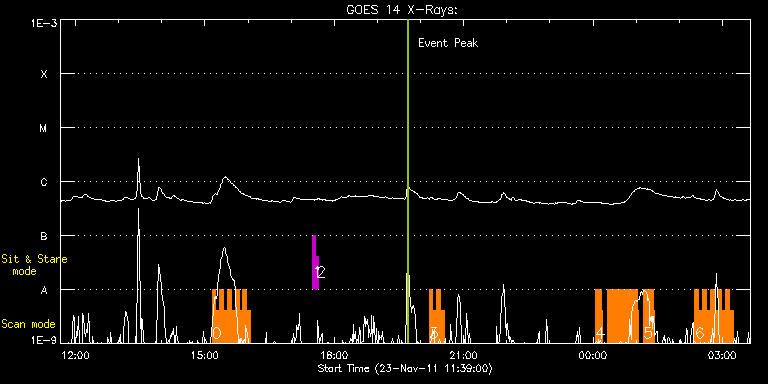 EIS Observation timeline overlay to GOES-Xray curve Code 1" 2" 40" 266" EIS Observations list for this event: STUDY ACRONYM ID DATE OBSERVED DESCRIPTION NOAA# TARGET 0 HH_Flare+AR_180x152 | 25093 | 2011/11/23 15:10:01 | Flare Hunting and AR study | 1354 | Flare TIMELINE ID DATE OBSERVED FITS FILE XCEN (+W/-E) YCEN (+N/-S) DUR ----------------------------------------------------------------------------------------------------------------- 25093 | 2011/11/23 15:10:01.000 | eis_l0_20111123_151001.fits.gz | -7.94 | -305.24 | 5m18s 25093 | 2011/11/23 15:15:22.000 | eis_l0_20111123_151522.fits.gz | -7.09 | -305.40 | 5m18s 25093 | 2011/11/23 15:20:43.000 | eis_l0_20111123_152043.fits.gz | -6.39 | -305.24 | 5m18s 25093 | 2011/11/23 15:26:04.000 | eis_l0_20111123_152604.fits.gz | -5.47 | -305.40 | 5m18s 25093 | 2011/11/23 15:31:25.000 | eis_l0_20111123_153125.fits.gz | -4.69 | -305.40 | 5m18s 25093 | 2011/11/23 15:36:46.000 | eis_l0_20111123_153646.fits.gz | -3.92 | -305.24 | 5m17s 25093 | 2011/11/23 15:42:06.000 | eis_l0_20111123_154206.fits.gz | -3.07 | -305.24 | 5m18s 25093 | 2011/11/23 15:47:27.000 | eis_l0_20111123_154727.fits.gz | -2.30 | -305.24 | 5m18s 25093 | 2011/11/23 15:52:47.000 | eis_l0_20111123_155247.fits.gz | -1.45 | -305.32 | 5m19s 25093 | 2011/11/23 15:58:08.000 | eis_l0_20111123_155808.fits.gz | -0.75 | -305.24 | 5m18s 1 regcal071 | 25080 | 2011/11/23 17:30:11 | Dark exposures, CCD bottom rows (100s | | Engineering TIMELINE ID DATE OBSERVED FITS FILE XCEN (+W/-E) YCEN (+N/-S) DUR ----------------------------------------------------------------------------------------------------------------- 25080 | 2011/11/23 17:30:11.000 | eis_l0_20111123_173011.fits.gz | 30.04 | -610.16 | 3m22s 2 regcal072 | 25081 | 2011/11/23 17:35:11 | Dark exposures, top CCD rows (100s exp | | Engineering TIMELINE ID DATE OBSERVED FITS FILE XCEN (+W/-E) YCEN (+N/-S) DUR ----------------------------------------------------------------------------------------------------------------- 25081 | 2011/11/23 17:35:11.000 | eis_l0_20111123_173511.fits.gz | 30.58 | -99.09 | 3m22s 3 HH_Flare+AR_180x152 | 25086 | 2011/11/23 20:11:53 | Flare Hunting and AR study | | Flare TIMELINE ID DATE OBSERVED FITS FILE XCEN (+W/-E) YCEN (+N/-S) DUR ----------------------------------------------------------------------------------------------------------------- 25086 | 2011/11/23 20:11:53.000 | eis_l0_20111123_201153.fits.gz | 37.25 | -304.86 | 5m18s 25086 | 2011/11/23 20:17:14.000 | eis_l0_20111123_201714.fits.gz | 38.03 | -304.86 | 5m18s 25086 | 2011/11/23 20:22:35.000 | eis_l0_20111123_202235.fits.gz | 38.80 | -304.86 | 5m17s 25086 | 2011/11/23 20:27:55.000 | eis_l0_20111123_202755.fits.gz | 39.57 | -304.86 | 5m18s 4 DRW_Alf_01 | 25082 | 2011/11/24 00:03:14 | HOP128 AR | | Active Region TIMELINE ID DATE OBSERVED FITS FILE XCEN (+W/-E) YCEN (+N/-S) DUR ----------------------------------------------------------------------------------------------------------------- 25082 | 2011/11/24 00:03:14.000 | eis_l0_20111124_000314.fits.gz | 373.56 | -450.93 | 1m8s 25082 | 2011/11/24 00:04:25.000 | eis_l0_20111124_000425.fits.gz | 373.64 | -450.70 | 1m9s 25082 | 2011/11/24 00:05:37.000 | eis_l0_20111124_000537.fits.gz | 373.79 | -450.70 | 1m8s 25082 | 2011/11/24 00:06:48.000 | eis_l0_20111124_000648.fits.gz | 373.95 | -450.78 | 1m8s 25082 | 2011/11/24 00:07:59.000 | eis_l0_20111124_000759.fits.gz | 374.10 | -450.62 | 1m8s 25082 | 2011/11/24 00:09:10.000 | eis_l0_20111124_000910.fits.gz | 374.26 | -450.70 | 1m8s 25082 | 2011/11/24 00:10:21.000 | eis_l0_20111124_001021.fits.gz | 374.41 | -450.85 | 1m8s 25082 | 2011/11/24 00:11:32.000 | eis_l0_20111124_001132.fits.gz | 374.56 | -450.78 | 1m9s 25082 | 2011/11/24 00:19:52.000 | eis_l0_20111124_001952.fits.gz | 375.49 | -450.78 | 1m8s 25082 | 2011/11/24 00:21:03.000 | eis_l0_20111124_002103.fits.gz | 375.72 | -450.78 | 1m8s 25082 | 2011/11/24 00:22:14.000 | eis_l0_20111124_002214.fits.gz | 375.80 | -450.62 | 1m9s 25082 | 2011/11/24 00:23:25.000 | eis_l0_20111124_002325.fits.gz | 375.95 | -450.62 | 1m9s 25082 | 2011/11/24 00:24:37.000 | eis_l0_20111124_002437.fits.gz | 376.11 | -450.70 | 1m8s 25082 | 2011/11/24 00:25:48.000 | eis_l0_20111124_002548.fits.gz | 376.34 | -450.70 | 1m8s 25082 | 2011/11/24 00:26:59.000 | eis_l0_20111124_002659.fits.gz | 376.42 | -450.70 | 1m9s 25082 | 2011/11/24 00:28:10.000 | eis_l0_20111124_002810.fits.gz | 376.49 | -450.55 | 1m9s 25082 | 2011/11/24 00:29:22.000 | eis_l0_20111124_002922.fits.gz | 376.73 | -450.70 | 1m8s 25082 | 2011/11/24 00:30:33.000 | eis_l0_20111124_003033.fits.gz | 376.80 | -450.62 | 1m8s 25082 | 2011/11/24 00:31:44.000 | eis_l0_20111124_003144.fits.gz | 377.04 | -450.70 | 1m8s 25082 | 2011/11/24 00:32:55.000 | eis_l0_20111124_003255.fits.gz | 377.11 | -450.70 | 1m8s 25082 | 2011/11/24 00:34:06.000 | eis_l0_20111124_003406.fits.gz | 377.35 | -450.70 | 1m9s 25082 | 2011/11/24 00:35:17.000 | eis_l0_20111124_003517.fits.gz | 377.42 | -450.70 | 1m9s 25082 | 2011/11/24 00:36:29.000 | eis_l0_20111124_003629.fits.gz | 377.58 | -450.62 | 1m8s 25082 | 2011/11/24 00:37:40.000 | eis_l0_20111124_003740.fits.gz | 377.73 | -450.62 | 1m8s 25082 | 2011/11/24 00:38:51.000 | eis_l0_20111124_003851.fits.gz | 377.96 | -450.70 | 1m9s 25082 | 2011/11/24 00:40:02.000 | eis_l0_20111124_004002.fits.gz | 378.04 | -450.62 | 1m9s 25082 | 2011/11/24 00:41:14.000 | eis_l0_20111124_004114.fits.gz | 378.19 | -450.55 | 1m8s 25082 | 2011/11/24 00:42:25.000 | eis_l0_20111124_004225.fits.gz | 378.27 | -450.55 | 1m8s 25082 | 2011/11/24 00:43:36.000 | eis_l0_20111124_004336.fits.gz | 378.50 | -450.70 | 1m8s 25082 | 2011/11/24 00:44:47.000 | eis_l0_20111124_004447.fits.gz | 378.58 | -450.62 | 1m9s 25082 | 2011/11/24 00:45:59.000 | eis_l0_20111124_004559.fits.gz | 378.73 | -450.55 | 1m8s 25082 | 2011/11/24 00:47:10.000 | eis_l0_20111124_004710.fits.gz | 378.97 | -450.70 | 1m8s 25082 | 2011/11/24 00:48:21.000 | eis_l0_20111124_004821.fits.gz | 379.04 | -450.39 | 1m8s 25082 | 2011/11/24 