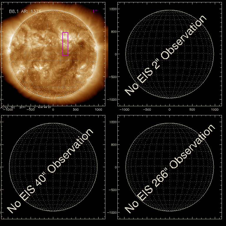 EIS Observation timeline overlay to GOES-Xray curve Code 1" 2" 40" 266" EIS Observations list for this event: STUDY ACRONYM ID DATE OBSERVED DESCRIPTION NOAA# TARGET 0 HPW021_VEL_240x512v1 | 25333 | 2011/12/19 10:58:26 | Active Region map. AR 11377. | 1376 | Active Region TIMELINE ID DATE OBSERVED FITS FILE XCEN (+W/-E) YCEN (+N/-S) DUR ----------------------------------------------------------------------------------------------------------------- 25333 | 2011/12/19 10:58:26.000 | eis_l0_20111219_105826.fits.gz | 272.08 | 223.66 | 2h3m48s : Check study information : Download file : View thumbnails For this event, also check for: